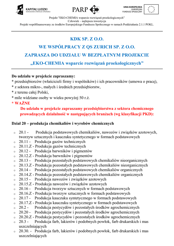 Projekt "EKO-CHEMIA wsparcie rozwiązań proekologicznych” Człowiek – najlepsza inwestycja Projekt współfinansowany ze środków Europejskiego Funduszu Społecznego w ramach Poddziałania 2.1.1 POKL. KDK SP. Z O.O. WE WSPÓŁPRACY Z QS ZURICH SP. Z O.O. ZAPRASZA DO UDZIAŁU W BEZPŁATNYM PROJEKCIE „EKO-CHEMIA wsparcie rozwiązań proekologicznych” Do udziału w projekcie zapraszamy: * przedsiębiorców (właścicieli firmy i wspólników) i ich pracowników (umowa o pracę), * z sektora mikro-, małych i średnich przedsiębiorstw, * z terenu całej Polski, * mile widziane osoby w wieku powyżej 50 r.ż. * WAŻNE Do udziału w projekcie zapraszamy przedsiębiorstwa z sektora chemicznego prowadzących działalność w następujących branżach (wg klasyfikacji PKD): Dział 20 – produkcja chemikaliów i wyrobów chemicznych o o o o o o o o o o o o o o o o o o o o 20.1 Produkcja podstawowych chemikaliów, nawozów i związków azotowych, tworzyw sztucznych i kauczuku syntetycznego w formach podstawowych 20.11 - Produkcja gazów technicznych 20.11.Z - Produkcja gazów technicznych 20.12 - Produkcja barwników i pigmentów 20.12.Z - Produkcja barwników i pigmentów 20.13 - Produkcja pozostałych podstawowych chemikaliów nieorganicznych 20.13.Z - Produkcja pozostałych podstawowych chemikaliów nieorganicznych 20.14 - Produkcja pozostałych podstawowych chemikaliów organicznych 20.14.Z - Produkcja pozostałych podstawowych chemikaliów organicznych 20.15 - Produkcja nawozów i związków azotowych 20.15.Z - Produkcja nawozów i związków azotowych 20.16 - Produkcja tworzyw sztucznych w formach podstawowych 20.16.Z - Produkcja tworzyw sztucznych w formach podstawowych 20.17 - Produkcja kauczuku syntetycznego w formach podstawowych 20.17.Z - Produkcja kauczuku syntetycznego w formach podstawowych 20.2 - Produkcja pestycydów i pozostałych środków agrochemicznych 20.20 - Produkcja pestycydów i pozostałych środków agrochemicznych 20.20.Z - Produkcja pestycydów i pozostałych środków agrochemicznych 20.3 - Produkcja farb, lakierów i podobnych powłok, farb drukarskich i mas uszczelniających 20.30. - Produkcja farb, lakierów i podobnych powłok, farb drukarskich i mas uszczelniających o o o o o o o o o o o o o o o o o o 20.30.Z - Produkcja farb, lakierów i podobnych powłok, farb drukarskich i mas uszczelniających 20.4 - Produkcja mydła i detergentów, środków myjących i czyszczących, wyrobów kosmetycznych i toaletowych 20.41 - Produkcja mydła i detergentów, środków myjących i czyszczących 20.41.Z - Produkcja mydła i detergentów, środków myjących i czyszczących 20.42 – Produkcja wyrobów kosmetycznych i toaletowych 20.42.Z - Produkcja wyrobów kosmetycznych i toaletowych 20.5 - Produkcja pozostałych wyrobów chemicznych 20.51 - Produkcja materiałów wybuchowych 20.51.Z - Produkcja materiałów wybuchowych 20.52 - Produkcja klejów 20.52.Z - Produkcja klejów 20.53 - Produkcja olejków eterycznych 20.53.Z - Produkcja olejków eterycznych 20.59 - Produkcja pozostałych wyrobów chemicznych, gdzie indziej niesklasyfikowana 20.59.Z - Produkcja pozostałych wyrobów chemicznych, gdzie indziej niesklasyfikowana 20.6 - Produkcja włókien chemicznych 20.60 - Produkcja włókien chemicznych 20.60.Z - Produkcja włókien chemicznych Dział 21 – produkcja podstawowych substancji farmaceutycznych oraz leków i pozostałych wyrobów farmaceutycznych o o o o o o 21.1 - Produkcja podstawowych substancji farmaceutycznych 21.10 - Produkcja podstawowych substancji farmaceutycznych 21.10.Z - Produkcja podstawowych substancji farmaceutycznych 21.2 - Produkcja leków i pozostałych wyrobów farmaceutycznych 21.20 - Produkcja leków i pozostałych wyrobów farmaceutycznych 21.20.Z - Produkcja leków i pozostałych wyrobów farmaceutycznych Dział 22 – produkcja z wyrobów gumy i tworzyw sztucznych o o o o o o o o o o o o o o 22.1. - Produkcja wyrobów z gumy 22.11 - Produkcja opon i dętek z gumy; bieżnikowanie i regenerowanie opon z gumy 22.11.Z - Produkcja opon i dętek z gumy; bieżnikowanie i regenerowanie opon z gumy 22.19 - Produkcja pozostałych wyrobów z gumy 22.19.Z - Produkcja pozostałych wyrobów z gumy 22.2 - Produkcja wyrobów z tworzyw sztucznych 22.21 - Produkcja płyt, arkuszy, rur i kształtowników z tworzyw sztucznych 22.21.Z - Produkcja płyt, arkuszy, rur i kształtowników z tworzyw sztucznych 22.22 - Produkcja opakowań z tworzyw sztucznych 22.22.Z - Produkcja opakowań z tworzyw sztucznych 22.23 - Produkcja wyrobów dla budownictwa z tworzyw sztucznych 22.23.Z - Produkcja wyrobów dla budownictwa z tworzyw sztucznych 22.29 - Produkcja pozostałych wyrobów z tworzyw sztucznych 22.29.Z - Produkcja pozostałych wyrobów z tworzyw sztucznych W ramach udziału w projekcie oferujemy: 1. Bezpłatny udział w 4 dniowym szkoleniu System Zarządzania Środowiskowego 2. Bezpłatne konsultacje nt. wdrażania rozwiązań ekologicznych w przedsiębiorstwie 3. Atrakcyjne i praktyczne materiały szkoleniowe 4. Lunch i serwis kawowy podczas każdego dnia szkolenia Cel szkolenia: Przygotowanie uczestników do opracowania i implementacji „planu wdrożenia działań proekologicznych“ w firmie Zapoznanie uczestników z istotą, celem, rodzajami, planowaniem i metodyką prowadzenia auditów, Zapoznanie uczestników z normą ISO 14001 oraz podstawami normy ISO 5001, Przygotowanie przyszłych auditorów do efektywnego przeprowadzenia auditów w przedsiębiorstwie zgodnie z normą ISO 14001. RAMOWY PLAN SZKOLENIA DZIEŃ I Koncepcja funkcjonowania Systemu Zarządzania Środowiskiem Podstawowe pojęcia dotyczące funkcjonowania Systemu Zarządzania Środowiskowego Podstawowe wymagania prawne Systemu Zarządzania Środowiskiem DZIEŃ II Norma ISO 14001, omówienie założeń i wymagań normy ISO 14001 Norma ISO 5001, omówienie założeń i wymagań normy ISO 5001 DZIEŃ III Przebieg procesu - wdrożenie i funkcjonowanie Systemu Zarządzania Środowiskiem Tw