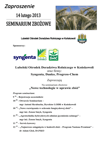 Sponsorzy: Lubelski Ośrodek Doradztwa Rolniczego w Końskowoli oraz firmy: Syngenta, Danko, Progress-Chem Zapraszają Na seminarium zbożowe „Nowe technologie w uprawie zbóż” Program seminarium: 9 30 – Rejestracja uczestników 10 00 - Otwarcie Seminarium – mgr Antoni Skrabucha, Dyrektor LODR w Końskowoli 10 15- „Nowe rozwiązania w ochronie fungicydowej zbóż” – mgr inż. Zenon Smyk, Syngenta 11 00 - „Agrotechnika hybrydowych odmian jęczmienia ozimego” – mgr inż. Zenon Smyk, Syngenta 11 45 – Serwis kawowy 12 10 – „Najnowsze osiągnięcia w hodowli zbóż – Program Nasiona Premium” – dr Adam Gleń, DANKO 12 50 - „Możliwości zaopatrzenia w środki produkcji - prognozy cen na rok 2013” mgr inż. Grzegorz Kremeś, Progress-Chem 13 00 - „Modernizacja gospodarstw rolnych – Nabór wniosków 2013” „Program Rozwoju Obszarów Wiejskich – Planowane działania na lata 2014-2020” – mgr inż. Danuta Sobich, LODR w Końskowoli 13 30- „Nawożenie zbóż na przykładzie Pola Doświadczalno–Wdrożeniowego w Pożogu II” - mgr inż. Krzysztof Kurus, LODR w Końskowoli 14 10 – Poczęstunek Spotkanie odbędzie się w dniu 14.02.2013 r. w Centrum Innowacyjno-Szkoleniowym Lubelskiego Ośrodka Doradztwa Rolniczego w Końskowoli ul. Pożowska 8 Serdecznie zapraszamy tel. kontaktowy: 81 8890651; 661107333