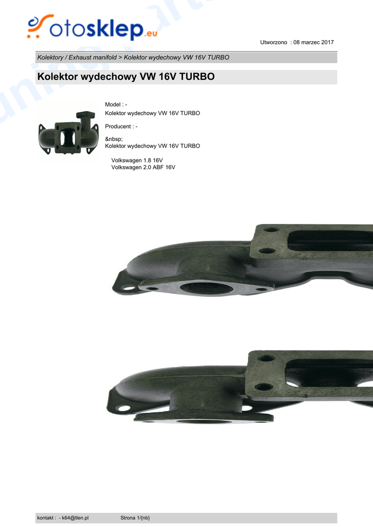 p g n i n u t r a Kolektory / Exhaust manifold > Kolektor wydechowy VW 16V TURBO Kolektor wydechowy VW 16V TURBO Model : Kolektor wydechowy VW 16V TURBO Producent : Kolektor wydechowy VW 16V TURBO Volkswagen 1.8 16V Volkswagen 2.0 ABF 16V kontakt : - [email protected] Strona 1/{nb} Utworzono : 08 marzec 2017 p g n i n u t r a Kolektory / Exhaust manifold > Kolektor wydechowy VW 16V TURBO Kolektor wydechowy VW 16V TURBO kontakt : - [email protected] Strona 2/{nb} Utworzono : 08 marzec 2017 p g n i n u t r a Kolektory / Exhaust manifold > Kolektor wydechowy VW 16V TURBO Kolektor wydechowy VW 16V TURBO kontakt : - [email protected] Strona 3/{nb} Utworzono : 08 marzec 2017 p g n i n u t r a Kolektory / Exhaust manifold > Kolektor wydechowy VW 16V TURBO Kolektor wydechowy VW 16V TURBO Cena : 380,00 zł Brutto ( 308,94 zł Netto) Dostępność: Produkt dostępny w naszym sklepie od 01 luty 2017 kontakt : - [email protected] Strona 4/{nb} Utworzono : 08 marzec 2017