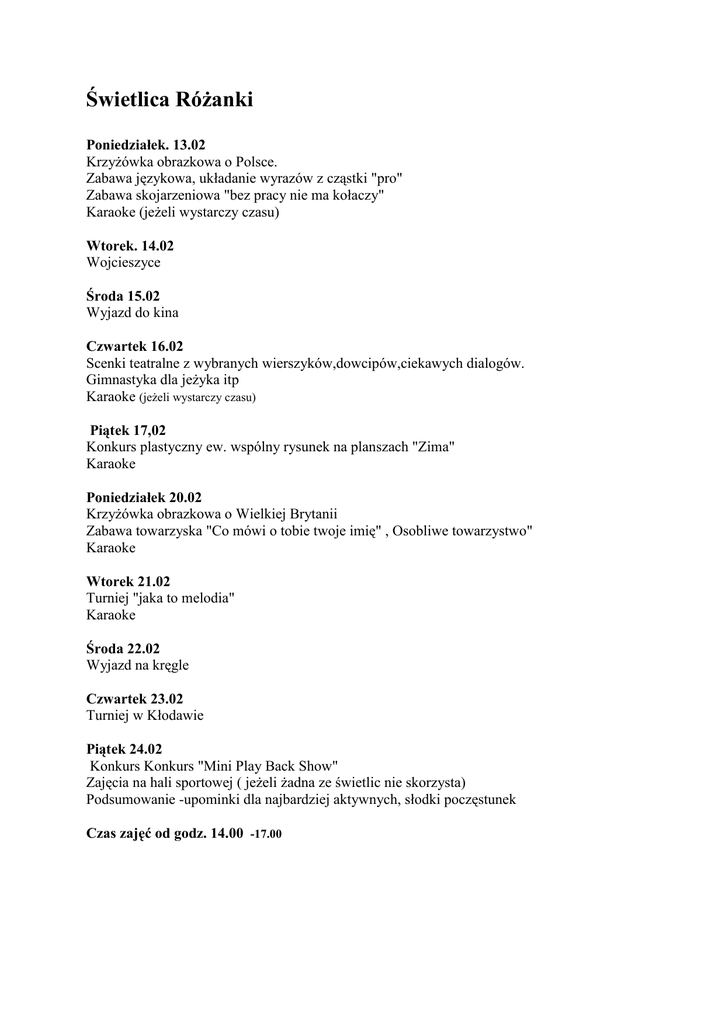 Świetlica Różanki Poniedziałek. 13.02 Krzyżówka obrazkowa o Polsce. Zabawa językowa, układanie wyrazów z cząstki "pro" Zabawa skojarzeniowa "bez pracy nie ma kołaczy" Karaoke (jeżeli wystarczy czasu) Wtorek. 14.02 Wojcieszyce Środa 15.02 Wyjazd do kina Czwartek 16.02 Scenki teatralne z wybranych wierszyków,dowcipów,ciekawych dialogów. Gimnastyka dla jeżyka itp Karaoke (jeżeli wystarczy czasu) Piątek 17,02 Konkurs plastyczny ew. wspólny rysunek na planszach "Zima" Karaoke Poniedziałek 20.02 Krzyżówka obrazkowa o Wielkiej Brytanii Zabawa towarzyska "Co mówi o tobie twoje imię" , Osobliwe towarzystwo" Karaoke Wtorek 21.02 Turniej "jaka to melodia" Karaoke Środa 22.02 Wyjazd na kręgle Czwartek 23.02 Turniej w Kłodawie Piątek 24.02 Konkurs Konkurs "Mini Play Back Show" Zajęcia na hali sportowej ( jeżeli żadna ze świetlic nie skorzysta) Podsumowanie -upominki dla najbardziej aktywnych, słodki poczęstunek Czas zajęć od godz. 14.00 -17.00