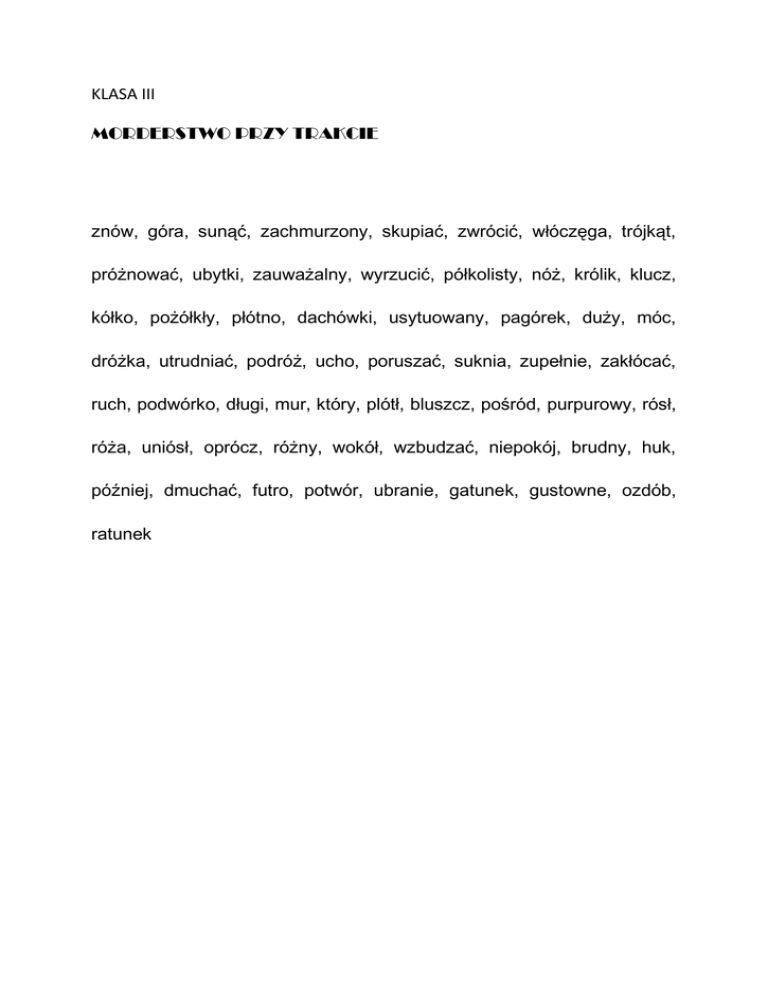 KLASA III MORDERSTWO PRZY TRAKCIE znów, góra, sunąć, zachmurzony, skupiać, zwrócić, włóczęga, trójkąt, próżnować, ubytki, zauważalny, wyrzucić, półkolisty, nóż, królik, klucz, kółko, pożółkły, płótno, dachówki, usytuowany, pagórek, duży, móc, dróżka, utrudniać, podróż, ucho, poruszać, suknia, zupełnie, zakłócać, ruch, podwórko, długi, mur, który, plótł, bluszcz, pośród, purpurowy, rósł, róża, uniósł, oprócz, różny, wokół, wzbudzać, niepokój, brudny, huk, później, dmuchać, futro, potwór, ubranie, gatunek, gustowne, ozdób, ratunek KLASA I HISTORIA HANDLARZA HENRYKA choleryk, ożenić, kucharka, drożdże, ślub, zupa, ogórek, gulasz, karczochy, rzodkiew, chrzan, duszony, marchew, orzechy, kruchy, handlarz, poczuć, zawód, chwila, później, pojąć, małżeński, należy, kupić, książka, kucharska, pochówek, służba, dochodzenie, szóstka, zauważyć, puścić, żona, zabójca, Henryk, ukrywać, szuwary, chart, który, poszczuć, okrążyć, zbrodniarz, hart, bohater, ulegać, przeważający, stróż, uwzględnić, żaden