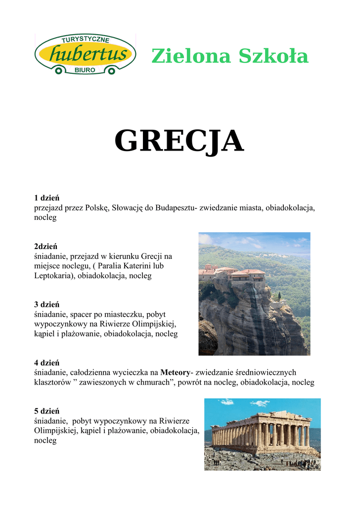 Zielona Szkoła GRECJA 1 dzień przejazd przez Polskę, Słowację do Budapesztu- zwiedzanie miasta, obiadokolacja, nocleg 2dzień śniadanie, przejazd w kierunku Grecji na miejsce noclegu, ( Paralia Katerini lub Leptokaria), obiadokolacja, nocleg 3 dzień śniadanie, spacer po miasteczku, pobyt wypoczynkowy na Riwierze Olimpijskiej, kąpiel i plażowanie, obiadokolacja, nocleg 4 dzień śniadanie, całodzienna wycieczka na Meteory- zwiedzanie średniowiecznych klasztorów ” zawieszonych w chmurach”, powrót na nocleg, obiadokolacja, nocleg 5 dzień śniadanie, pobyt wypoczynkowy na Riwierze Olimpijskiej, kąpiel i plażowanie, obiadokolacja, nocleg 6 Dzień śniadanie, wykwaterowanie, Saloniki- drugie pod względem wielkości miasto w Grecji, zwiedzanie m. in. kościół Hagia Sofija z VIII w, kościół św. Demetriusza z V wieku, rzymski łuk triumfalny cesarza Galeriusza oraz symbol miasta - wenecka Biała Wieża, w której obecnie znajduje się Muzeum Bizantyjskie, obiad, nocny przejazd w kierunku Miszkolca 7 dzień Miszkolc- całodzienna zabawa na basenach termalnych, przejazd w kierunku Polski 8 dzień przyjazd do Polski w godzinach wczesno- porannych Kolejność zwiedzania może ulec zmianie!!! Cena: 630 zł + 130 Euro Cena zawiera: transport, zakwaterowanie (5 noclegów z HB), opiekę pilota – przewodnika, ubezpieczenie NNW Cena nie zawiera: biletów wstępu do zwiedzanych obiektów (ok .50 Euro) Biuro Turystyczne „hubertus” 20-017 Lublin ul. Narutowicza 69 tel/fax 534-57-13 tel.534-33-84 NIP 712-102-09-85 KONTO: PKO BP IV O/Lublin 5510203176-0000-5802-0011- 6780 Zez. Woj. Lub. Nr 2/99