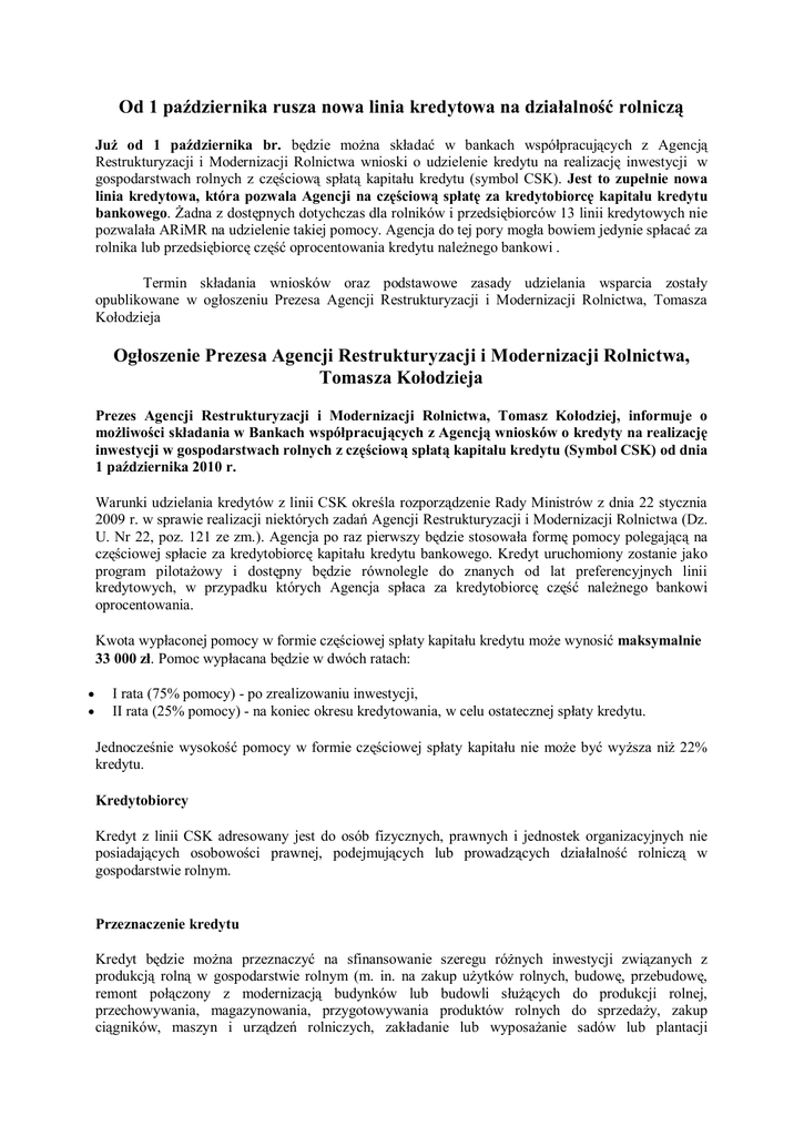 Od 1 pa dziernika rusza nowa linia kredytowa na dzia alno rolnicz Ju od 1 pa dziernika br. b dzie mo na sk ada w bankach wspó pracuj cych z Agencj Restrukturyzacji i Modernizacji Rolnictwa wnioski o udzielenie kredytu na realizacj inwestycji w gospodarstwach rolnych z cz ciow sp at kapita u kredytu (symbol CSK). Jest to zupe nie nowa linia kredytowa, która pozwala Agencji na cz ciow sp at za kredytobiorc kapita u kredytu bankowego. adna z dost pnych dotychczas dla rolników i przedsi biorców 13 linii kredytowych nie pozwala a ARiMR na udzielenie takiej pomocy. Agencja do tej pory mog a bowiem jedynie sp aca za rolnika lub przedsi biorc cz oprocentowania kredytu nale nego bankowi . Termin sk adania wniosków oraz podstawowe zasady udzielania wsparcia zosta y opublikowane w og oszeniu Prezesa Agencji Restrukturyzacji i Modernizacji Rolnictwa, Tomasza Ko odzieja Og oszenie Prezesa Agencji Restrukturyzacji i Modernizacji Rolnictwa, Tomasza Ko odzieja Prezes Agencji Restrukturyzacji i Modernizacji Rolnictwa, Tomasz Ko odziej, informuje o mo liwo ci sk adania w Bankach wspó pracuj cych z Agencj wniosków o kredyty na realizacj inwestycji w gospodarstwach rolnych z cz ciow sp at kapita u kredytu (Symbol CSK) od dnia 1 pa dziernika 2010 r. Warunki udzielania kredytów z linii CSK okre la rozporz dzenie Rady Ministrów z dnia 22 stycznia 2009 r. w sprawie realizacji niektórych zada Agencji Restrukturyzacji i Modernizacji Rolnictwa (Dz. U. Nr 22, poz. 121 ze zm.). Agencja po raz pierwszy b dzie stosowa a form pomocy polegaj na cz ciowej sp acie za kredytobiorc kapita u kredytu bankowego. Kredyt uruchomiony zostanie jako program pilota owy i dost pny b dzie równolegle do znanych od lat preferencyjnych linii kredytowych, w przypadku których Agencja sp aca za kredytobiorc cz nale nego bankowi oprocentowania. Kwota wyp aconej pomocy w formie cz ciowej sp aty kapita u kredytu mo e wynosi maksymalnie 33 000 z . Pomoc wyp acana b dzie w dwóch ratach: I rata (75% pomocy) - po zrealizowaniu inwestycji, II rata (25% pomocy) - na koniec okresu kredytowania, w celu ostatecznej sp aty kredytu. Jednocze nie wysoko kredytu. pomocy w formie cz ciowej sp aty kapita u nie mo e by wy sza ni 22% Kredytobiorcy Kredyt z linii CSK adresowany jest do osób fizycznych, prawnych i jednostek organizacyjnych nie posiadaj cych osobowo ci prawnej, podejmuj cych lub prowadz cych dzia alno rolnicz w gospodarstwie rolnym. Przeznaczenie kredytu Kredyt b dzie mo na przeznaczy na sfinansowanie szeregu ró nych inwestycji zwi zanych z produkcj roln w gospodarstwie rolnym (m. in. na zakup u ytków rolnych, budow , przebudow , remont po czony z modernizacj budynków lub budowli s cych do produkcji rolnej, przechowywania, magazynowania, przygotowywania produktów rolnych do sprzeda y, zakup ci gników, maszyn i urz dze rolniczych, zak adanie lub wyposa anie sadów lub plantacji wieloletnich, wyposa anie pastwisk lub wybiegów dla zwierz t, budow uj urz dze do uzdatniania wody lub do nawodnie ci nieniowych). wody, zakup i instalacj Warunki udzielania kredytu Kwota kredytu nie mo e przekracza 80% inwestycji w gospodarstwie rolnym i jednocze nie nie mo e wynosi wi cej ni 4 mln z . Kredyt mo e zosta udzielony na okres od 5 do 10 lat. Okres karencji w sp acie kredytu, a tak e wysoko oprocentowania kredytu okre li Bank w umowie kredytu. Procedura ubiegania si o kredyt Aby zaci gn kredyt nale y przygotowa plan inwestycji i z go wraz z wnioskiem o kredyt i kompletem innych dokumentów w Banku wspó pracuj cym z Agencj (wzór wniosku okre la Bank). O kredyt z linii CSK mo na ubiega si w Mazowieckim Banku Regionalnym S.A., SGB Gospodarczym Banku Wielkopolski S.A., a tak e w zrzeszonych w nich Bankach Spó dzielczych, oraz w Banku Gospodarki ywno ciowej S.A. Obecnie finalizowane s prace zwi zane z podpisaniem umów o wspó pracy z kolejnymi bankami, celem umo liwienia zaci gania kredytów z linii CSK równie w Banku Polskiej Spó dzielczo ci S.A. i w zrzeszonych w nim Bankach Spó dzielczych, Banku Zachodnim WBK S.A., Banku BPH S.A., ING Banku skim S.A. oraz Banku Polska Kasa Opieki S.A. Szczegó owe warunki i zasady udzielania kredytu s dost pne w zak adce "Pomoc krajowa".