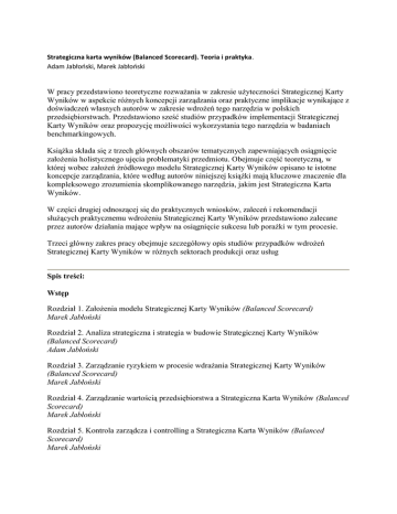 Strategiczna karta wyników (Balanced Scorecard). Teoria i praktyka. Adam Jabłoński, Marek Jabłoński W pracy przedstawiono teoretyczne rozważania w zakresie użyteczności Strategicznej Karty Wyników w aspekcie różnych koncepcji zarządzania oraz praktyczne implikacje wynikające z doświadczeń własnych autorów w zakresie wdrożeń tego narzędzia w polskich przedsiębiorstwach. Przedstawiono sześć studiów przypadków implementacji Strategicznej Karty Wyników oraz propozycję możliwości wykorzystania tego narzędzia w badaniach benchmarkingowych. Książka składa się z trzech głównych obszarów tematycznych zapewniających osiągnięcie założenia holistycznego ujęcia problematyki przedmiotu. Obejmuje część teoretyczną, w której wobec założeń źródłowego modelu Strategicznej Karty Wyników opisano te istotne koncepcje zarządzania, które według autorów niniejszej książki mają kluczowe znaczenie dla kompleksowego zrozumienia skomplikowanego narzędzia, jakim jest Strategiczna Karta Wyników. W części drugiej odnoszącej się do praktycznych wniosków, zaleceń i rekomendacji służących praktycznemu wdrożeniu Strategicznej Karty Wyników przedstawiono zalecane przez autorów działania mające wpływ na osiągnięcie sukcesu lub porażki w tym procesie. Trzeci główny zakres pracy obejmuje szczegółowy opis studiów przypadków wdrożeń Strategicznej Karty Wyników w różnych sektorach produkcji oraz usług Spis treści: Wstęp Rozdział 1. Założenia modelu Strategicznej Karty Wyników (Balanced Scorecard) Marek Jabłoński Rozdział 2. Analiza strategiczna i strategia w budowie Strategicznej Karty Wyników (Balanced Scorecard) Adam Jabłoński Rozdział 3. Zarządzanie ryzykiem w procesie wdrażania Strategicznej Karty Wyników (Balanced Scorecard) Marek Jabłoński Rozdział 4. Zarządzanie wartością przedsiębiorstwa a Strategiczna Karta Wyników (Balanced Scorecard) Marek Jabłoński Rozdział 5. Kontrola zarządcza i controlling a Strategiczna Karta Wyników (Balanced Scorecard) Marek Jabłoński Rozdział 6. Społeczna odpowiedzialność biznesu a Strategiczna Karta Wyników (Balanced Scorecard) Adam Jabłoński Rozdział 7. Innowacja a Strategiczna Karta Wyników (Balanced Scorecard) Adam Jabłoński Rozdział 8. Benchmarking w procesie wdrożenia Strategicznej Karty Wyników (Balanced Scorecard) Adam Jabłoński, Marek Jabłoński Rozdział 9. Praktyczna implementacja wdrożenia Strategicznej Karty Wyników (Balanced Scorecard) w przedsiębiorstwach Adam Jabłoński, Marek Jabłoński Rozdział 10. Wspomaganie informatyczne wdrożenia Strategicznej Karty Wyników (Balanced Scorecard) z wykorzystaniem systemu klasy Business Intelligence – Result Scorecard Adam Jabłoński, Marek Jabłoński Rozdział 11. Studium przypadków wdrożenia Strategicznej Karty Wyników (Balanced Scorecard) w warunkach polskich Adam Jabłoński, Marek Jabłoński 11.1. Studium przypadku wdrożenia Strategicznej Karty Wyników (Balanced Scorecard) w sektorze hotelarskim 11.2. Studium przypadku wdrożenia Strategicznej Karty Wyników (Balanced Scorecard) w przedsiębiorstwie kolejowym 11.3. Studium przypadku wdrożenia Strategicznej Karty Wyników (Balanced Scorecard) w przedsiębiorstwie branży aluminium 11.4. Studium wdrożenia Strategicznej Karty Wyników (Balanced Scorecard) w przedsiębiorstwie gospodarki wodno-ściekowej 11.5. Studium przypadku wdrożenia Strategicznej Karty Wyników (Balanced Scorecard) w przedsiębiorstwie wodociągowym 11.6. Studium przypadku wdrożenia Strategicznej Karty Wyników (Balanced Scorecard) w wydawnictwie muzycznym Zakończenie Słownik podstawowych pojęć Bibliografia