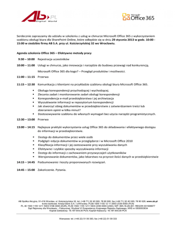 Serdecznie zapraszamy do udziału w szkoleniu z usług w chmurze Microsoft Office 365 z wykorzystaniem szablonu obsługi biura dla SharePoint Online, które odbędzie się w dniu 29 stycznia 2013 w godz. 10:00 15:00 w siedzibie firmy AB S.A. przy ul. Kościerzyńskiej 32 we Wrocławiu. Agenda szkolenia Office 365 – Efektywne metody pracy 9:30 – 10:00 Rejestracja uczestników 10:00 – 11:00 Usługi w chmurze, jako innowacja i narzędzie do budowy przewagi nad konkurencją. Microsoft Office 365 dla kogo? – Przegląd produktów i możliwości. 11:00 – 11:15 Przerwa 11:15 – 12:30 Komunikacja z klientami na przykładzie szablonu obsługi biura Microsoft Office 365. Obsługa korespondencji przychodzącej i wychodzącej. Zlecania zadań i monitorowanie zadań obsługi korespondencji Korespondencja e-mail przedsiębiorstwa i jej archiwizacja Wyszukiwanie informacji w repozytorium korespondencji Jak stworzyć obieg dokumentów w przedsiębiorstwie z zatwierdzaniem treści lub zbieraniem opinii w kilka minut? Dostosowywanie szablonu do własnych wymagań bez użycia narzędzi programistycznych. 12:30 – 13:00 Przerwa 13:00 – 14:15 Najlepsze praktyki wykorzystania usług Office 365 do składowania i efektywnego dostępu do informacji w przedsiębiorstwie. Dostęp do dokumentów przez wiele osób Podgląd i edycja dokumentów w przeglądarce i w Microsoft Office 2010 Klasyfikacja informacji i jej zastosowanie przy wyszukiwaniu danych Efektywne i szybkie sposoby wyszukiwania informacji Dostęp do informacji z zachowaniem przyzwyczajeń użytkowników Wersjonowanie dokumentów, jako lekarstwo na przyrost ilości danych w przedsiębiorstwie 14:15 – 14:45 Podsumowanie i koszty proponowanych rozwiązań. 14:45 – 15:00 Zakończenie. Pytania. AB Spółka Akcyjna, 51-416 Wrocław, ul. Kościerzyńska 32, tel. (+48 71) 32 40 500, 78 90 500, fax (+48 71) 32 40 529, 78 90 529, www.ab.pl konto bankowe: Kredyt Bank S.A. I o/Wrocław, PL68 1500 1155 12 11 5003 2339 0000 (PLN) PL 46 1500 1155 1211 5003 5196 0000 (EUR), PL58 1500 1155 1211 5003 2456 0000 (USD); NIP: 895-16-28-481: REGON 931908977 Sąd Rejonowy dla Wrocławia – Fabrycznej, Wydział VI Gospodarczy Krajowego Rejestru Sądowego, KRS nr 0000053834 Kapitał Zakładowy: 16.187.644,00 PLN; Kapitał Wpłacony: 16.187.644,00 PLN Warszawa: tel. (+48 22) 51 09 300, fax (+48 22) 51 09 333