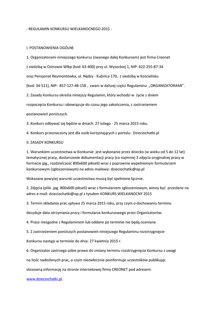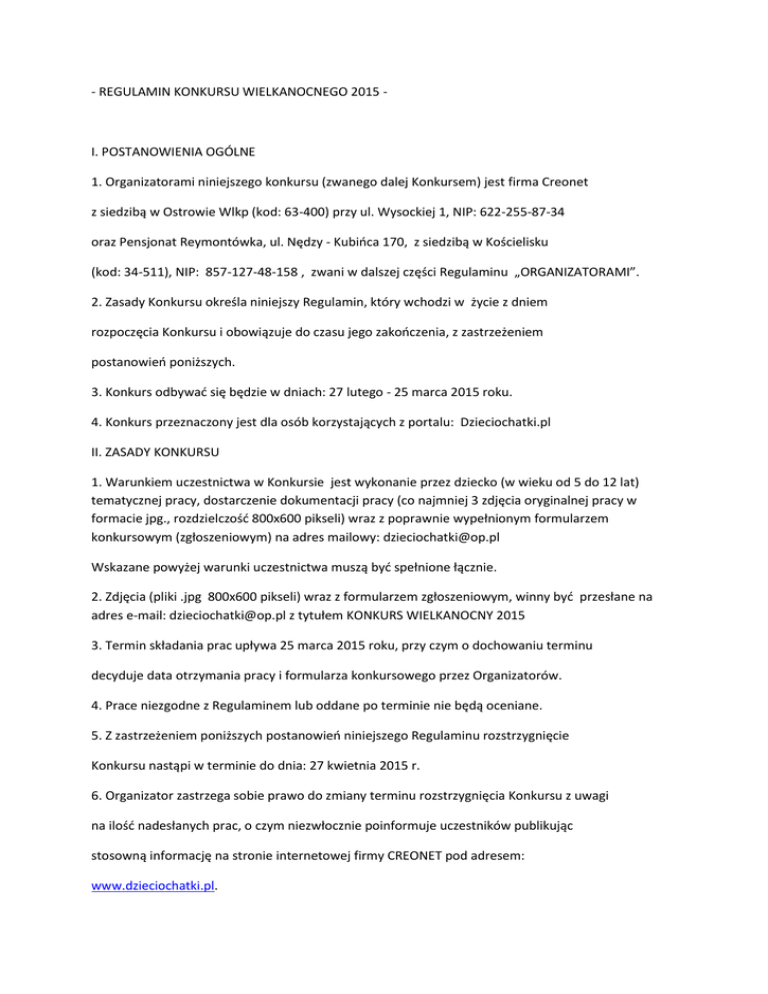 - REGULAMIN KONKURSU WIELKANOCNEGO 2015 - I. POSTANOWIENIA OGÓLNE 1. Organizatorami niniejszego konkursu (zwanego dalej Konkursem) jest firma Creonet z siedzibą w Ostrowie Wlkp (kod: 63-400) przy ul. Wysockiej 1, NIP: 622-255-87-34 oraz Pensjonat Reymontówka, ul. Nędzy - Kubińca 170, z siedzibą w Kościelisku (kod: 34-511), NIP: 857-127-48-158 , zwani w dalszej części Regulaminu „ORGANIZATORAMI”. 2. Zasady Konkursu określa niniejszy Regulamin, który wchodzi w życie z dniem rozpoczęcia Konkursu i obowiązuje do czasu jego zakończenia, z zastrzeżeniem postanowień poniższych. 3. Konkurs odbywać się będzie w dniach: 27 lutego - 25 marca 2015 roku. 4. Konkurs przeznaczony jest dla osób korzystających z portalu: Dzieciochatki.pl II. ZASADY KONKURSU 1. Warunkiem uczestnictwa w Konkursie jest wykonanie przez dziecko (w wieku od 5 do 12 lat) tematycznej pracy, dostarczenie dokumentacji pracy (co najmniej 3 zdjęcia oryginalnej pracy w formacie jpg., rozdzielczość 800x600 pikseli) wraz z poprawnie wypełnionym formularzem konkursowym (zgłoszeniowym) na adres mailowy: [email protected] Wskazane powyżej warunki uczestnictwa muszą być spełnione łącznie. 2. Zdjęcia (pliki .jpg 800x600 pikseli) wraz z formularzem zgłoszeniowym, winny być przesłane na adres e-mail: [email protected] z tytułem KONKURS WIELKANOCNY 2015 3. Termin składania prac upływa 25 marca 2015 roku, przy czym o dochowaniu terminu decyduje data otrzymania pracy i formularza konkursowego przez Organizatorów. 4. Prace niezgodne z Regulaminem lub oddane po terminie nie będą oceniane. 5. Z zastrzeżeniem poniższych postanowień niniejszego Regulaminu rozstrzygnięcie Konkursu nastąpi w terminie do dnia: 27 kwietnia 2015 r. 6. Organizator zastrzega sobie prawo do zmiany terminu rozstrzygnięcia Konkursu z uwagi na ilość nadesłanych prac, o czym niezwłocznie poinformuje uczestników publikując stosowną informację na stronie internetowej firmy CREONET pod adresem: www.dzieciochatki.pl. 7. Zwycięzcą Konkursu zostanie osoba, której praca zostanie najwyżej oceniona przez Jury Konkursu. Jury przyzna jedną nagrodę główną (I miejsce) oraz nagrody pocieszenia dla 2 (dwóch) kolejnych uczestników Konkursu, których prace zostaną ocenione najwyżej. Wszystkie wyróżnione oraz zwycięskie prace mogą zostać opublikowane w portalu: Dzieciochatki.pl oraz na stronie internetowej Pensjonatu Reymontówka. 8. Wyniki Konkursu zostaną opublikowane na stronie www.dzieciochatki.pl. 9. Rodzice nagrodzonych dzieci zostaną poinformowani o wynikach Konkursu drogą mailową lub telefonicznie. 10. ORGANIZATORZY zastrzegają sobie możliwość odwołania Konkursu w szczególności z uwagi na niskie zainteresowanie i małą liczbę, względnie niski poziom prac konkursowych. 11. Jury stanowią: Hanna Wróbel, Karol Wagner III. NAGRODY 1. Nagrodą główną w Konkursie jest: Pobyt w Pensjonacie Reymontówka*** w Kościelisku(rodzice + max. 3 dzieci), w terminie od 3 do 6 kwietnia z wyżywieniem w pakiecie „Święta z Jajem i z Lego” 2. Nagrodami pocieszenia w Konkursie będą: II nagroda - 50% zniżki na pobyt w Reymontówce*** (rodzice + max. 3 dzieci), od 30 Kwietnia do 3 maja 2015 w pakiecie „Majówka z Lego” lub od 3 do 7 czerwca 2015 w pakiecie „Długi Weekend Czerwcowy” III nagroda - 33% zniżki na pobyt w Reymontówce*** (rodzice + max. 3 dzieci), w terminie od 30 kwietnia do 3 maja 2015 w pakiecie „Majówka z Lego” lub od 3 do 7 czerwca 2015 w pakiecie „Długi Weekend Czerwcowy” 3. Nagrody, o których mowa powyżej zostaną przekazane w momencie ogłoszenia zwycięzcy konkursu tj. do 27 kwietnia 2015 r. w formie elektronicznej. 4. Nagrody zostaną wysłane w formie elektronicznych voucher-ów na wskazany przez osoby nagrodzone adres e-mail lub mogą zostać odebrane osobiście w Pensjonacie Reymontówka***. 6. Koszty wysyłki nagród pokrywają Organizatorzy. 7. Nagrody nie podlegają wymianie na gotówkę. 8. Nie ma możliwości zmiany terminu pobytu. 9. W przypadku powstania obowiązku zapłaty podatku w związku z otrzymaniem nagród uczestnicy zobowiązani będą do ich pokrycia we własnym zakresie, na co - przystępując do Konkursu - wyrażają zgodę. 10. Organizator zastrzega sobie prawo do publikowania informacji o Zwycięzcy i osobach wyróżnionych nagrodami pocieszenia oraz publikacji przysłanych prac na stronie internetowej www.dzieciochatki.pl oraz stronie internetowej Pensjonatu Reymontówka, na co rodzice uczestników -przystępujących do udziału w Konkursie - wyrażają zgodę. IV. POSTANOWIENIA KOŃCOWE 1. Decyzje Organizatorów Konkursu (Creonet i Pensjonat Reymontówka) oraz Jury mają charakter ostateczny i nie przysługuje od nich odwołanie. 2. Przystąpienie do udziału w Konkursie jest jednoznaczne z przyjęciem warunków niniejszego Regulaminu. 3. W sprawach nieuregulowanych niniejszym Regulaminem zastosowanie mają odpowiednie przepisy kodeksu cywilnego. 4. ORGANIZATORZY zastrzegają sobie możliwość odwołania Konkursu w przypadkach, o których mowa w pkt. II ust. 10 Regulaminu, jak również możliwość nie przyznania nagrody głównej z uwagi na niski poziom nadesłanych prac.