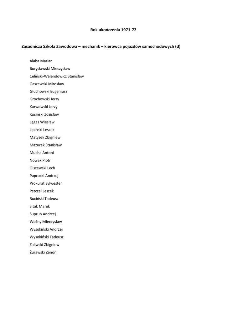 Rok ukończenia 1971-72 Zasadnicza Szkoła Zawodowa – mechanik – kierowca pojazdów samochodowych (d) Alaba Marian Borysławski Mieczysław Celiński-Walendowicz Stanisław Gaszewski Mirosław Głuchowski Eugeniusz Grochowski Jerzy Karwowski Jerzy Kosiński Zdzisław Lęgas Wiesław Lipiński Leszek Matysek Zbigniew Mazurek Stanisław Mucha Antoni Nowak Piotr Olszewski Lech Paprocki Andrzej Prokurat Sylwester Pszczel Leszek Ruciński Tadeusz Sitak Marek Suprun Andrzej Woźny Mieczysław Wysokiński Andrzej Wysokiński Tadeusz Zaliwski Zbigniew Żurawski Zenon Zasadnicza Szkoła Zawodowa – mechanik – kierowca pojazdów samochodowych Wychowawca: Bonat Zdzisław Borkowski Ryszard Chrusny Wojciech Chróściel Grzegorz Domański Zdzisław Duczek Adam Gaładyk Waldemar Gujski Zenon Igański Krzysztof Jastrzębski Antoni Kicler Zdzisław Kobyliński Andrzej Koć Kazimierz Kosiorek Antoni Leszkowicz Ireneusz Łukasik Marek Madej Zygmunt Modrzewski Wiesław Piechotka Waldemar Pieczara Czesław Roman Zdzisław Rosa Adam Soldecki Tadeusz Struś Zygmunt Walecki Tadeusz Wysokiński Wincenty Zbieć Tadeusz Zasadnicza Szkoła Zawodowa – mechanik pojazdów samochodowych Wychowawca: Leszczyński Mirosław Bielecki Mirosław Borkowicz Jan Borkowski Józef Charuta Bogdan Chojecki Mieczysław Chromiński Jan Dąbrowski Adam Dmowska Maria Dobrzyński Zbigniew Duk Jerzy Dzierżanowski Andrzej Fedorowicz Jan Gumiński Andrzej Grochowski Krzysztof Jasińska Elżbieta Jasiński Marian Jastrzębska Maria Jarocki Marek Korejwo Kazimiera Marczak Stanisław Mlonek Jan Okniński Mieczysław Orzełowski Ryszard Perycz Marek Pieńkowski Ignacy Protasiuk Barbara Rosa Krystyna Rudek Krzysztof Sobkowicz Bogusław Szadkowski marek Szarek Krystyna Śledź Jerzy Wereda Jadwiga Wielgórski Marek Wójcik Halina Zasadnicza Szkoła Zawodowa – mechanik pojazdów samochodowych – ślusarz Wychowawca: Sadłowski Marian Cabaj Kazimierz Chraniuk Andrzej Chróściel Stanisław Czarnocki Tadeusz Duber Zbigniew Gaszewski Andrzej Głuchowski Franciszek Grzyb Józef Joński Sławomir Kalaciński Jerzy Maciak Jakub Marcinkiewicz Stanisław Mędza Andrzej Michalak Ryszard Muszyński Jerzy Pogorzelski Janusz Radzikowski Zygmunt Radzik Władysław Sosinowski Tadeusz Szałapski Jerzy Świniarski Jarosław Tokarski Krzysztof Troć Zenon Tryński Zbigniew Zielińska Elżbieta Zasadnicza Szkoła Zawodowa – formierz odlewnik Wychowawca: Garwoliński Arasim Romuald Baran Wiesław Bielak Stanisław Boruc Lech Czeluścińska Maria Golec Teresa Izdebski Ryszard Jasiński Szczepan Kopycki Janusz Krysiak Marek Ługowski Bonifacy Michalak Antoni Piotruk Henryk Przyboś Adam Sałata Tadeusz Uziak Stanisław Witowski Bogdan Wrzosek Bogumiła Zasadnicza Szkoła Zawodowa – drobiarstwo przemysłowe – przetwórstwo owocowo-warzywne Wychowawca: J. Kobylińska Bajek Elżbieta Bańkowska Barbara Borkowska Marianna Cabaj Hanna Czarnocka Danuta Domańska Elżbieta Kadej Maria Klimowicz Anna Koć Henryka Kołodziejczyk Hanna Kowalczyk Janina Kowieska Elżbieta Kozaryna Ewa Kożuchowska Danuta Królikowska Danuta Łagodzin Barbara Malesa Danuta Malesa Teresa Nowosielska Jadwiga Osłowska Bożena Piątek Grażyna Pieńkowska Józefa Pniewska Teresa Popławska Elżbieta Rodak Teresa Sadłakowska Krystyna Serowiec Halina Sosnowska Grażyna Sujka Hanna Supryn Kazimiera Świątek Halina Tkaczyk Teresa Wasiluk Krystyna Witecka Wiesława Zbucka Ewa Zielińska Zofia Zasadnicza Szkoła Zawodowa - kucharz Adamczyk Barbara Bartoszewska Elżbieta Bryńczak Marianna Ciołek Grażyna Czarnocka Teresa Demianiuk Danuta Dziubak Bogusława Głuchowska Jadwiga Harasim Maria Kanteluk Aniela Karczmarczyk Jolanta Klukowska Danuta Kosiorek Irena Kostyra Zofia Kowalczyk Teresa Metera Helena Michalak Danuta Michalak Zofia Osiadała Elżbieta Ostrowska Marianna Pacek Marianna Pieczeniuk Anna Piotrowska Ewa Pliszka Danuta Przeorek Franciszek Rucińska Elżbieta Rychlica Bogumiła Skwierczyńska Alina Sowa Ewa Strzalińska Alina Stępnik Grażyna Uziębło Teresa Walewska Hanna Waloch Jolanta Wedziuk Elżbieta Witczuk Ewa Wysocka Alicja Wyszomirska Anna Zaniewicz Danuta Zielonka Ewa Zasadnicza Szkoła Zawodowa - kucharz Bareja Justyna Bartosiak Bożena Bubin Teresa Długosz Danuta Głuchowska Barbara Jakubasek Alicja Jankowska Elżbieta Jurko Danuta Kąkol Elżbieta Kędziora Teresa Klukowska Teresa Kobylińska Teresa Kobylińska Wiesława Krasuska Hanna Kurowska Elżbieta Laskowska Anna Ławecka Konstancja Maksimiak Bożena Maksymiuk Danuta Mularzuk Jadwiga Myrcha Barbara Podniesińska Jolanta Perz Jerzy Piekut Barbara Pliszka Edwarda Pniewska Stefania Prokurat Jadwiga Prokurat Wiesława Rytel Jadwiga Sikorska Alina Skorupka Stefania Soczewka Janina Święcki Krzysztof Szybka Teresa Warowna Halina Wasążnik Teresa Wróbel Wiesława Zdanowska Elżbieta Zasadnicza Szkoła Zawodowa - krawiec odzieży damskiej ciężkiej Bartoszuk Marianna Danilczuk Barbara Dąbrowska Grażyna Denis Barbara Golcew Maria Grochowska Teresa Guzek Janina Izdebska Elżbieta Izdebska Anna Jabłońska Renata Kamińska Barbara Kępa Jadwiga Karwacka Danuta Kłak Teresa Kozłowska Alina Krasowska Danuta Kruk Mirosława Krypa Janina Krzyzińska Teresa Lipińska Teresa Ławecka Zofia Mudent Wiesława Majewska Alina Olędzka Barbara Pałka Danuta Paszkowska Helena Pawlak Krystyna Popławska Krystyna Pilich Lucyna Romańczyk Grażyna Sawicka Teresa Sikorska Marianna Wiącek Grażyna Więsak Zofia Wojewódzka Anna Żarska Janina Zasadnicza Szkoła Zawodowa - dziewiarz maszynowo - ręczny Wychowawca: M. Taraszkiewicz Adamczyk Zofia Dziedzic Krystyna Gajewiak Halina Gomza Janina Grochulska Hanna Jackiewicz Katarzyna Kokosza Wanda Kokoszka Barbara Kostera Elżbieta Kozieł Barbara Krasuska Grażyna Kwiatkowska Ewa Major Marianna Mączyńska Danuta Ostolska Elżbieta Paczuska Bożena Perz Anna Pogorzelska Bożena Powalska Teresa Rudnicka Hanna Siemionek Krystyna Strzeszewska Monika Supeł Zuzanna Sylwestrzak El