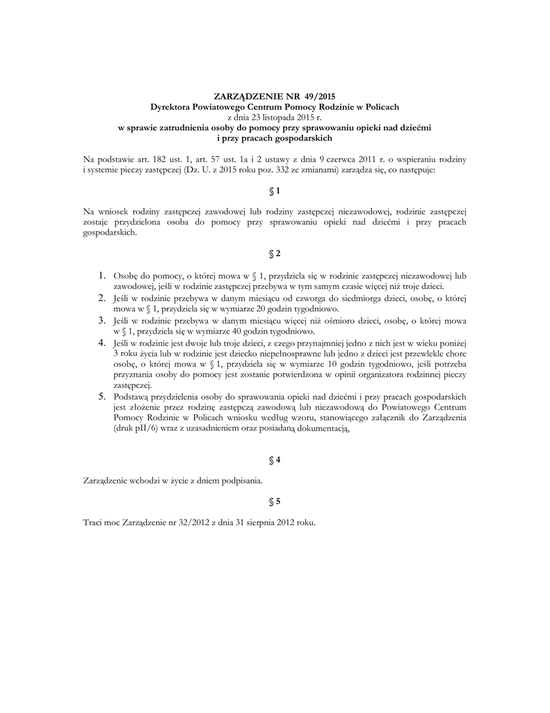 ZARZĄDZENIE NR 49/2015 Dyrektora Powiatowego Centrum Pomocy Rodzinie w Policach z dnia 23 listopada 2015 r. w sprawie zatrudnienia osoby do pomocy przy sprawowaniu opieki nad dziećmi i przy pracach gospodarskich Na podstawie art. 182 ust. 1, art. 57 ust. 1a i 2 ustawy z dnia 9 czerwca 2011 r. o wspieraniu rodziny i systemie pieczy zastępczej (Dz. U. z 2015 roku poz. 332 ze zmianami) zarządza się, co następuje: §1 Na wniosek rodziny zastępczej zawodowej lub rodziny zastępczej niezawodowej, rodzinie zastępczej zostaje przydzielona osoba do pomocy przy sprawowaniu opieki nad dziećmi i przy pracach gospodarskich. §2 1. Osobę do pomocy, o której mowa w § 1, przydziela się w rodzinie zastępczej niezawodowej lub zawodowej, jeśli w rodzinie zastępczej przebywa w tym samym czasie więcej niż troje dzieci. 2. Jeśli w rodzinie przebywa w danym miesiącu od czworga do siedmiorga dzieci, osobę, o której mowa w § 1, przydziela się w wymiarze 20 godzin tygodniowo. 3. Jeśli w rodzinie przebywa w danym miesiącu więcej niż ośmioro dzieci, osobę, o której mowa w § 1, przydziela się w wymiarze 40 godzin tygodniowo. 4. Jeśli w rodzinie jest dwoje lub troje dzieci, z czego przynajmniej jedno z nich jest w wieku poniżej 3 roku życia lub w rodzinie jest dziecko niepełnosprawne lub jedno z dzieci jest przewlekle chore osobę, o której mowa w § 1, przydziela się w wymiarze 10 godzin tygodniowo, jeśli potrzeba przyznania osoby do pomocy jest zostanie potwierdzona w opinii organizatora rodzinnej pieczy zastępczej. 5. Podstawą przydzielenia osoby do sprawowania opieki nad dziećmi i przy pracach gospodarskich jest złożenie przez rodzinę zastępczą zawodową lub niezawodową do Powiatowego Centrum Pomocy Rodzinie w Policach wniosku według wzoru, stanowiącego załącznik do Zarządzenia (druk pII/6) wraz z uzasadnieniem oraz posiadaną dokumentacją, §4 Zarządzenie wchodzi w życie z dniem podpisania. §5 Traci moc Zarządzenie nr 32/2012 z dnia 31 sierpnia 2012 roku.
