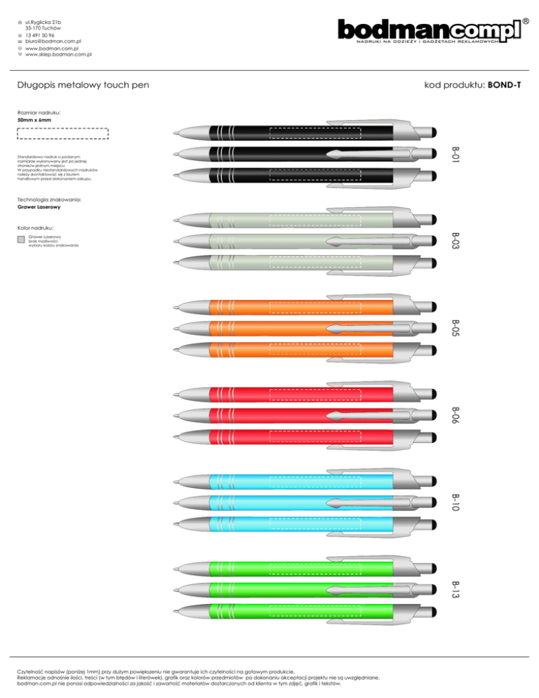 ul.Ryglicka 21b 33-170 Tuchów 13 491 50 96 [email protected] www.bodman.com.pl www.sklep.bodman.com.pl Długopis metalowy touch pen kod produktu: BOND-T Rozmiar nadruku: 50mm x 6mm B-01 Standardowo nadruk o podanym rozmiarze wykonywany jest po jednej stronie/w jednym miejscu. W przypadku niestandardowych nadruków należy skontaktować się z biurem handlowym przed dokonaniem zakupu. Technologia znakowania: Grawer Laserowy Kolor nadruku: B-03 Grawer Laserowy brak możliwości wyboru koloru znakowania B-05 B-06 B-10 B-13 Czytelność napisów (poniżej 1mm) przy dużym powiększeniu nie gwarantuje ich czytelności na gotowym produkcie. Reklamacje odnośnie ilości, treści (w tym błędów i literówek), grafik oraz kolorów przedmiotów po dokonaniu akceptacji projektu nie są uwzględniane. bodman.com.pl nie ponosi odpowiedzialności za jakość i zawartość materiałów dostarczonych od klienta w tym zdjęć, grafik i tekstów.
