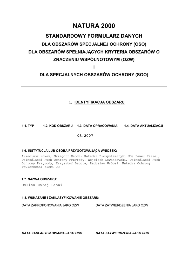 NATURA 2000 STANDARDOWY FORMULARZ DANYCH DLA OBSZARÓW SPECJALNEJ OCHRONY (OSO) DLA OBSZARÓW SPEŁNIAJĄCYCH KRYTERIA OBSZARÓW O ZNACZENIU WSPÓLNOTOWYM (OZW) I DLA SPECJALNYCH OBSZARÓW OCHRONY (SOO) 1. IDENTYFIKACJA OBSZARU 1.1. TYP 1.2. KOD OBSZARU 1.3. DATA OPRACOWANIA 1.4. DATA AKTUALIZACJI 03.2007 1.6. INSTYTUCJA LUB OSOBA PRZYGOTOWUJĄCA WNIOSEK: Arkadiusz Nowak, Grzegorz Hebda, Katedra Biosystematyki UO; Paweł Kisiel, Dolnośląski Ruch Ochrony Przyrody, Wojciech Lewandowski, Dolnośląski Ruch Ochrony Przyrody, Krzysztof Badora, Radosław Wróbel, Katedra Ochrony Powierzchni Ziemi UO 1.7. NAZWA OBSZARU: Dolina Małej Panwi 1.8. WSKAZANE I ZAKLASYFIKOWANIE OBSZARU: DATA ZAPROPONOWANIA JAKO OZW DATA ZATWIERDZENIA JAKO OZW DATA ZAKLASYFIKOWANIA JAKO OSO DATA ZATWIERDZENIA JAKO SOO 2. POŁOŻENIE OBSZARU 2.1. POŁOŻENIE CENTRALNEGO PUNKTU OBSZARU DŁUGOŚĆ GEOGRAFICZNA SZEROKOŚĆ GEOGRAFICZNA 18°29’6’’ E 50°36’19’’ N 2.3. DŁUGOŚĆ OBSZARU (km): 2.2. POWIERZCHNIA (ha): 1170,94 2.4. WYSOKOŚĆ (m): MINIMALNA MAKSYMALNA ŚREDNIA 194 228 200 2.5. WOJEWÓDZTWO (REGION ADMINISTRACYJNY): KOD NAZWA % POKRYCIA opolskie 100 2.6. REGION BIOGEOGRAFICZNY ANATOLIJSKI MAKARONEZYJSKI ALPEJSKI ARKTYCZNY ŚRÓDZIEMNOMORSKI ATLANTYCKI PANNOŃSKI BOREALNY CZARNOMORSKI KONTYNENTALNY STEPOWY 3. INFORMACJA PRZYRODNICZA 3.1. Typy SIEDLISK znajdujące się na terenie obszaru Natura 2000 oraz ocena znaczenia obszaru dla tych siedlisk: 3.1.a. Typy SIEDLISK wymienione w Załączniku I: Kod % pokrycia Reprezentatywność Względna Stan zachowania Ocena ogólna powierzchnia 3150 3260 6410 6510 7110 7230 9170 *91E0 *91D0 0,1 A C A 1,4 A C A 9,3 3,4 0,6 B B B B A 0,1 B 7,2 C 1,9 4,0 B B B C A C A C A A B B B A B A A B B B B A A 3.1.b. Pozostałe ważne typy SIEDLISK: Kod % pokrycia 3.2 GATUNKI objęte artykułem 4 Dyrektywy 79/409/EWG oraz wymienione w Załączniku II Dyrektywy 92/43/EWG oraz ocena znaczenia obszaru dla tych gatunków: 3.2.a. PTAKI wymienione w Załączniku I Dyrektywy Rady 79/409/EWG Kod Nazwa POPULACJA Osiadłe Lęgowa A030 Ciconia nigra A031 Ciconia ciconia A127 Grus grus A229 Alcedo atthis A231 Ficedula albicollis A234 Picus canus A236 Dryocopus martius A238 Dendrocopus medius A246 Lulula arborea A320 Ficedula parva A338 Lanius collurio A409 Tetrao tetrix OCENA ZNACZENIA OBSZARU Migrujące Zimująca Populacja Ochrona Izolacja Ogólnie Migrująca 3.2.b. Regularnie występujące PTAKI MIGRUJĄCE nie wymienione w Załączniku I Dyrektywy Rady 79/409/EWG Kod Nazwa POPULACJA Osiadłe OCENA ZNACZENIA OBSZARU Migrujące Lęgowa Zimująca Populacja Ochrona Izolacja Ogólnie Migrująca 3.2.c. SSAKI wymienione w Załączniku II Dyrektywy Rady 92/43/EWG Kod Nazwa POPULACJA Osiadłe Migrujące Lęgowa 1355 Lutra lutra 1337 Castor fiber 1324 Myotis myotis OCENA ZNACZENIA OBSZARU Zimująca Populacja Ochrona Izolacja Ogólnie Migrująca 3.2.d. PŁAZY I GADY wymienione w Załączniku II Dyrektywy Rady 92/43/EWG Kod Nazwa POPULACJA Osiadłe Lęgowa 1166 Triturus cristatus 1220 Emys orbicularis 1188 Bombina bombina OCENA ZNACZENIA OBSZARU Migrujące Zimująca Populacja Ochrona Izolacja Ogólnie Migrująca 3.2.e. RYBY wymienione w Załączniku II Dyrektywy Rady 92/43/EWG Kod Nazwa POPULACJA Osiadłe Lęgowa 1096 Lampetra planeri 1145 Misgurnus fossilis 1134 Rhodeus sericeus OCENA ZNACZENIA OBSZARU Migrujące Zimująca Populacja Ochrona Izolacja Ogólnie Migrująca 3.2.f. BEZKRĘGOWCE wymienione w Załączniku II Dyrektywy Rady 92/43/EWG Kod Nazwa POPULACJA Osiadłe Migrujące Lęgowa 1083 Lucanus cervus 1084 Osmoderma eremita OCENA ZNACZENIA OBSZARU Zimująca Populacja Ochrona Izolacja Migrująca 3.2.g. ROŚLINY wymienione w Załączniku II Dyrektywy Rady 92/43/EWG Kod Nazwa Populacja OCENA ZNACZENIA OBSZARU Populacja 3.3 Pozostałe ważne gatunki roślin i zwierząt Ochrona Izolacja Ogólnie Ogólnie GRUPA B M A R F NAZWA NAUKOWA I X POPULACJA MOTYWACJA P Motacilla cinerea X D Coenonympha hero C X Drosera rotundifolia A X Drosera anglica A X Galanthius nivalis C X Lycopodium annotinum C X Lycopodium clavataum C X Nuphar lutea X Bufo calamita (B=ptaki, M=ssaki, A=płazy, R=gady, F=ryby, I=bezkręgowce, P=rośliny) D C 4. OPIS OBSZARU 4.1. OGÓLNA CHARAKTERYSTYKA OBSZARU: Dolina Małej Panwi charakteryzuje się zróżnicowaną morfologią tworzoną przez plejstoceńskie terasy oraz zdenudowane, peryglacjalne równiny lodowcowe i wodnolodowcowe z licznie występującymi wydmami. Osady polodowcowe, eoliczne i rzeczne płytko podścielone są nieprzepuszczalnymi iłami górnotriasowymi. Proponowana ostoja obejmuje koryto rzeki o naturalnym silnie meandrującym przebiegu, dno doliny i przyległe tereny wysoczyzny. Mała Panew jest jedną z najbardziej naturalnych rzek nizinnych regionu, jedyną tego rodzaju proponowaną jako ostoja sieci Natura 2000 w granicach woj. opolskiego. W dnie licznie występują starorzecza. Ostoja obejmuje także przyległe do doliny kompleksy pól wydmowych z wydmami dochodzącymi do 10 m, w zagłębieniach międzywydmowych oraz w samej dolinie rzecznej zlokalizowane są niewielkie torfowiska. 4.2. WARTOŚĆ PRZYRODNICZA I ZNACZENIE: W granicach proponowanej ostoi dominują lasy, wśród których największą wartość przyrodniczą mają starodrzewia borów na wydmach i morenach. W obniżeniach terenu zlokalizowane są bory bagienne Vaccinio uliginosiPinetum i bagniska z roślinnością szuwarową. Obecne są torfowiska wysokie(żywe), przejściowe i niskie, w tym niezwykle cenne doskonale zachowane niskie torfowisko węglanowe. Torfowiska przedstawiają bardzo wysoką wartość przyrodniczą. Na niewielkich fragmentach skarp i piaszczysk rozwinęły się zbiorowiska muraw i wrzosowisk. Rzeka ma naturalny przebieg z licznymi starorzeczami, meandrami, wyspami. W Małej Panwi i jej dopływach występują zbiorowiska Ranunculetum fluitantis. Dolina przedstawia unikalne zróżnicowanie siedliskowe nieobecne w innych częściach województwa. Proponowana ostoja jest ważn