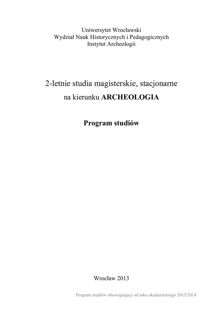 Uniwersytet Wrocławski Wydział Nauk Historycznych i Pedagogicznych Instytut Archeologii 2-letnie studia magisterskie, stacjonarne na kierunku ARCHEOLOGIA Program studiów Wrocław 2013 Program studiów obowiązujący od roku akademickiego 2013/2014 I. CHARAKTERYSTYKA STUDIÓW Studia drugiego stopnia (magisterskie) na kierunku archeologia trwają 2 lata (4 semestry) i kończą się nadaniem tytułu zawodowego magistra. W czasie studiów należy zebrać 120 punktów ECTS. Do zaliczenia każdego roku potrzebne jest zdobycie 60 punktów ECTS. II. SYLWETKA ABSOLWENTA Absolwent będzie posiadał gruntowną i wszechstronną wiedzę w zakresie wybranych specjalności archeologii oraz znajomość metod i osiągnięć dyscyplin z nią współpracujących. Będzie posiadał pogłębioną wiedzę metodologiczną oraz z zakresu teorii stosowanych w archeologii, a także posiądzie wiedzę na temat metod analizy różnych wytworów kultury i ich interpretacji prowadzonych na gruncie wybranych tradycji, teorii i szkół badawczych. Będzie posiadał ugruntowaną wiedzę z zakresu ochrony dziedzictwa kulturowego i będzie potrafił w praktyce wykorzystać znajomość oowiązujących w tym zakresie przepisów prawa polskiego i międzynarodowego (m.in. Ustawy o ochronie zabytków i opiece nad zabytkami). Absolwent uzyska umiejętność posługiwania się osiągnięciami w zakresie wybranych specjalności archeologii. Ponadto będzie znał i rozumiał podstawowe pojęcia i zasady z zakresu ochrony własności intelektualnej i prawa autorskiego. Absolwent będzie wyposażony w umiejętności związane z zastosowaniem i rozwijaniem wiedzy specjalistycznej z zakresu archeologii, ale także pozna zasady organizowania i funkcjonowania zespołów badawczych, w zakresie umożliwiającym wykonywanie zawodu archeologa. Posiądzie wiedzę z zakresu podstaw zarządzania organizacjami i projektami oraz umiejętności związane z planowaniem, konstruowaniem i realizacją projektów badawczych. Będzie potrafił poszukiwać źródeł finansowania projektów i zadań związanych z ochroną dziedzictwa, a także z jego popularyzacją. Absolwent będzie posiadał ponadto pogłębione umiejętności językowe w zakresie specjalistycznego słownictwa z dziedziny archeologii, zgodnie z wymaganiami określonymi dla poziomu B2+ Europejskiego Systemu Opisu Kształcenia Językowego. Wyposażony w niezbędną wiedzę, umiejętności i kompetencje Absolwent studiów magisterskich na kierunku Archeologia powinien kierować się w swoim postępowaniu zasadami etyki, przyjętymi w archeologii, mieć świadomość potrzeby nieustawicznego kształcenia w zakresie umożliwiającym wykonywanie zawodu archeologa oraz świadomość odpowiedzialności za dziedzictwo kulturowe. Program studiów obowiązujący od roku akademickiego 2013/2014 ARCHEOLOGIA – studia dzienne, drugiego stopnia, magisterskie PROGRAM STUDIÓW dla absolwentów studiów licencjackich na kierunku ARCHEOLOGIA Przedmioty ogólne (180 godzin) Liczba godzin Nazwa przedmiotu W Wykład ogólnouniwersytecki S K/Ć L Egz./zal. Punkty ECTS Z 90 Język obcy nowożytny 60 Z, E* 12 (3x4) 4* Wychowanie fizyczne 30 Z 1 Razem 180 17 *Egzamin ze znajomości języka na poziomie B2+ - do zaliczenia do końca semestru 3 Przedmioty podstawowe i kierunkowe (435 godzin) Liczba godzin Nazwa przedmiotu W Metodologia i historia archeologii S K/Ć 15 Podstawy zarządzania w archeologii L Egz./zal. 30 E, Z 30 E, Z Wykład specjalizacyjny I 60 E Wykład specjalizacyjny II (do wyboru przez studentów) Konwersatoria specjalistyczne (do wyboru przez studentów) Seminarium magisterskie 30 Z 150 Z 120 6 (3+3) 6 8 (2x4) 3 Z, E* 15 (5x3) 56 (4x12+8*) 94 Egz./zal. Punkty ECTS 435 Razem Punkty ECTS *Obrona pracy magisterskiej Ćwiczenia terenowe (155 godzin) Liczba godzin Nazwa przedmiotu W S K/Ć L Metodyka badań wykopaliskowych 150 Z 6 Metodyka prospekcji archeologicznej 35 Z 3 Razem 185 9 Program studiów obowiązujący od roku akademickiego 2013/2014 III. TREŚCI I EFEKTY KSZTAŁCENIA Przedmioty ogólne Wykład ogólnouniwersytecki Wykład do wyboru z oferty Uniwersytetu Wrocławskiego lub innej szkoły wyższej. W zależności od zainteresowania Studenta daje możliwość uzyskania wiedzy z zakresu nauk humanistycznych, przyrodniczych i społecznych. Tematyka powinna zostać uzgodniona z promotorem pracy magisterskiej. Język obcy nowożytny Osiągnięcie biegłości językowej w zakresie dziedzin nauki i dyscyplin naukowych właściwych dla studiowanego kierunku, zgodnie z wymaganiami określonymi dla poziomu B2+ Europejskiego Systemu Opisu Kształcenia Językowego Rady Europy. Wychowanie fizyczne Udział w zajęciach sportowo-rekreacyjnych. Przedmioty podstawowe i kierunkowe Metodologia i historia archeologii Zapoznanie Studenta z procesem wykształcania się archeologii jako samodzielnej dyscypliny naukowej oraz ze zmianami i zróżnicowaniem podstaw teoretycznych, koncepcji i procedur badawczych zachodzącymi wraz z jej rozwojem. Podstawy myśli teoretycznej oraz historia i zarys współczesnych tendencji metodologicznych w archeologii. Podstawy zarządzania w archeologii Zapoznanie Studentów z podstawowymi zagadnieniami z zakresu organizacji procesu badawczego i zarządzania projektem w archeologii, podstaw działalności gospodarczej i komunikacji społecznej. Wykształcenie umiejętności rozwiązywania problemów związanych z organizacją pracy archeologa (formułowanie celów, planowanie, ocenianie skuteczności działania) oraz zarządzania zespołem (tworzenie i kierowanie zespołem, komunikacja w grupie, zarządzanie kryzysem). Istotnym elementem zajęć będzie zapoznanie Studentów z problematyką podstaw przedsiębiorczości oraz etyki w archeologii i biznesie. Student zostanie wyposażony w umiejętność planowania projektu badawczego oraz pozyskiwania środków na jego realizację. Program studiów obowiązujący od roku akademickiego 2013/2014 Wykład specjalizacyjny I Poszcze