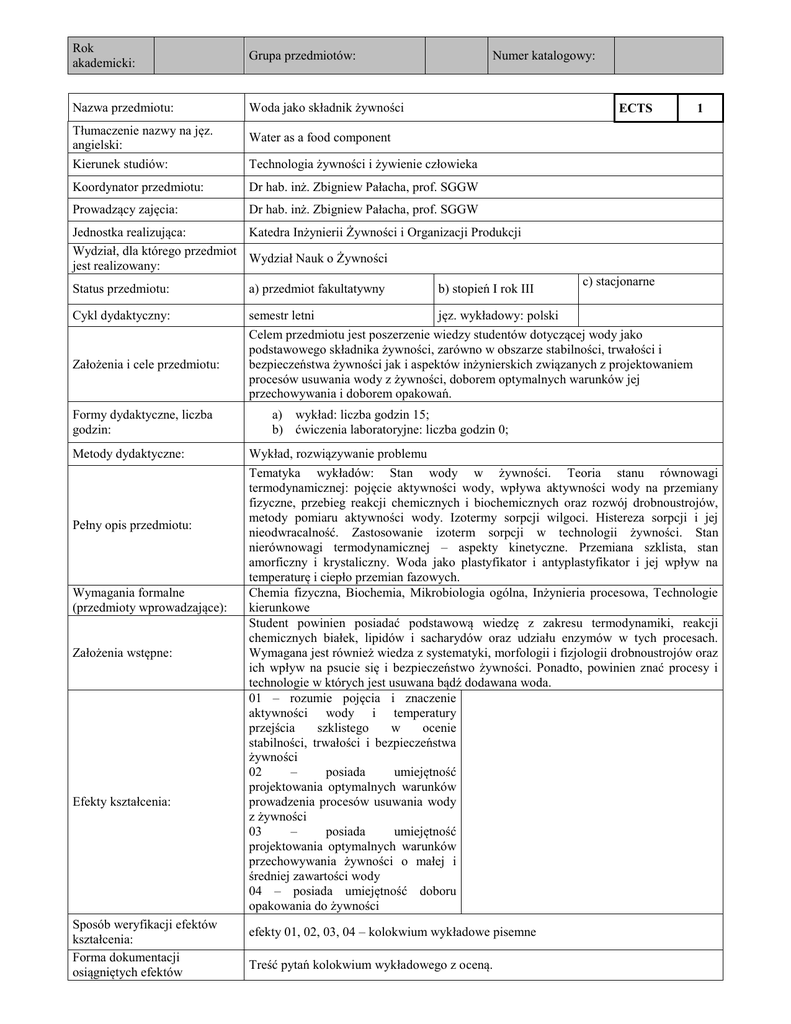 Rok akademicki: Grupa przedmiotów: Nazwa przedmiotu: Woda jako składnik żywności Tłumaczenie nazwy na jęz. angielski: Kierunek studiów: Numer katalogowy: ECTS 1 Water as a food component Technologia żywności i żywienie człowieka Koordynator przedmiotu: Dr hab. inż. Zbigniew Pałacha, prof. SGGW Prowadzący zajęcia: Dr hab. inż. Zbigniew Pałacha, prof. SGGW Jednostka realizująca: Katedra Inżynierii Żywności i Organizacji Produkcji Wydział, dla którego przedmiot Wydział Nauk o Żywności jest realizowany: b) stopień I rok III c) stacjonarne Status przedmiotu: a) przedmiot fakultatywny Cykl dydaktyczny: semestr letni jęz. wykładowy: polski Celem przedmiotu jest poszerzenie wiedzy studentów dotyczącej wody jako podstawowego składnika żywności, zarówno w obszarze stabilności, trwałości i bezpieczeństwa żywności jak i aspektów inżynierskich związanych z projektowaniem procesów usuwania wody z żywności, doborem optymalnych warunków jej przechowywania i doborem opakowań. Założenia i cele przedmiotu: Formy dydaktyczne, liczba godzin: Metody dydaktyczne: Pełny opis przedmiotu: Wymagania formalne (przedmioty wprowadzające): Założenia wstępne: Efekty kształcenia: Sposób weryfikacji efektów kształcenia: Forma dokumentacji osiągniętych efektów a) wykład: liczba godzin 15; b) ćwiczenia laboratoryjne: liczba godzin 0; Wykład, rozwiązywanie problemu Tematyka wykładów: Stan wody w żywności. Teoria stanu równowagi termodynamicznej: pojęcie aktywności wody, wpływa aktywności wody na przemiany fizyczne, przebieg reakcji chemicznych i biochemicznych oraz rozwój drobnoustrojów, metody pomiaru aktywności wody. Izotermy sorpcji wilgoci. Histereza sorpcji i jej nieodwracalność. Zastosowanie izoterm sorpcji w technologii żywności. Stan nierównowagi termodynamicznej – aspekty kinetyczne. Przemiana szklista, stan amorficzny i krystaliczny. Woda jako plastyfikator i antyplastyfikator i jej wpływ na temperaturę i ciepło przemian fazowych. Chemia fizyczna, Biochemia, Mikrobiologia ogólna, Inżynieria procesowa, Technologie kierunkowe Student powinien posiadać podstawową wiedzę z zakresu termodynamiki, reakcji chemicznych białek, lipidów i sacharydów oraz udziału enzymów w tych procesach. Wymagana jest również wiedza z systematyki, morfologii i fizjologii drobnoustrojów oraz ich wpływ na psucie się i bezpieczeństwo żywności. Ponadto, powinien znać procesy i technologie w których jest usuwana bądź dodawana woda. 01 – rozumie pojęcia i znaczenie aktywności wody i temperatury przejścia szklistego w ocenie stabilności, trwałości i bezpieczeństwa żywności 02 – posiada umiejętność projektowania optymalnych warunków prowadzenia procesów usuwania wody z żywności 03 – posiada umiejętność projektowania optymalnych warunków przechowywania żywności o małej i średniej zawartości wody 04 – posiada umiejętność doboru opakowania do żywności efekty 01, 02, 03, 04 – kolokwium wykładowe pisemne Treść pytań kolokwium wykładowego z oceną. kształcenia: Student na kolokwium wykładowym wybiera 5 z 7 pytań. Każde z pytań oceniane jest równocennie w skali od 0 do 5 pkt. Maksymalna ilość punktów z kolokwium wykładowego 25. Uzyskanie 13 pkt. zalicza przedmiot (ocena dostateczna). Miejsce realizacji zajęć: Sala dydaktyczna wykładowa. Literatura podstawowa i uzupełniająca: 1. Praca zbiorowa, 2002, 2015: Chemia żywności (red. Z.E. Sikorski), WNT, Warszawa. 2. Praca zbiorowa, 2010: Właściwości fizyczne żywności (red. Z. Pałacha, I. Sitkiewicz), WNT, Warszawa. 3. Atkins P.W., 2001:Chemia fizyczna, WNT, Warszawa. 4. Czasopisma krajowe I zagraniczne związane z w/w tematyką (ciągle aktualizowane). UWAGI: Dodaj tekst Elementy i wagi mające wpływ na ocenę końcową: Wskaźniki ilościowe charakteryzujące moduł/przedmiot: Szacunkowa sumaryczna liczba godzin pracy studenta (kontaktowych i pracy własnej) niezbędna dla osiągnięcia zakładanych efektów kształcenia - na tej podstawie należy wypełnić pole ECTS: Łączna liczba punktów ECTS, którą student uzyskuje na zajęciach wymagających bezpośredniego udziału nauczycieli akademickich: Łączna liczba punktów ECTS, którą student uzyskuje w ramach zajęć o charakterze praktycznym, takich jak zajęcia laboratoryjne, projektowe, itp.: 15 h 1 ECTS 0 ECTS Tabela zgodności kierunkowych efektów kształcenia efektami przedmiotu: Nr /symbol efektu 01 02 03 04 05 Wymienione w wierszu efekty kształcenia: rozumie pojęcia i znaczenie aktywności wody i temperatury przejścia szklistego w ocenie stabilności, trwałości i bezpieczeństwa żywności posiada umiejętność projektowania optymalnych warunków prowadzenia procesów usuwania wody z żywności posiada umiejętność projektowania optymalnych warunków przechowywania żywności o małej i średniej zawartości wody posiada umiejętność doboru opakowania do żywności Odniesienie do efektów dla programu kształcenia na kierunku K_W01, K_W05, K_W09, K_U04, KK01 K_W04, K_W06, K_W08, K_W10, K_U02, K_K01, K_K04 K_W05, K_W09, K_U04, K_U06, K_K01 K_W09, K_W15, K_U03, K_U04, K_K01