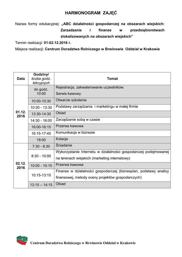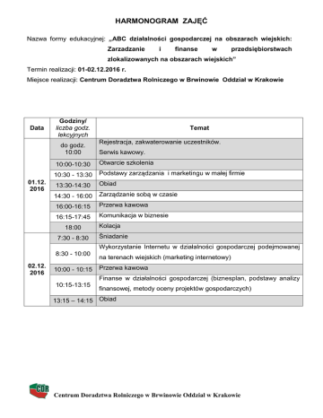 HARMONOGRAM ZAJĘĆ Nazwa formy edukacyjnej: „ABC działalności gospodarczej na obszarach wiejskich: Zarzadzanie i finanse w przedsiębiorstwach zlokalizowanych na obszarach wiejskich” Termin realizacji: 01-02.12.2016 r. Miejsce realizacji: Centrum Doradztwa Rolniczego w Brwinowie Oddział w Krakowie Data Godziny/ liczba godz. lekcyjnych do godz. 10:00 01.12. 2016 Temat Rejestracja, zakwaterowanie uczestników. Serwis kawowy. 10:00-10:30 Otwarcie szkolenia 10:30 - 13:30 Podstawy zarządzania i marketingu w małej firmie 13:30-14:30 Obiad 14:30 - 16:00 Zarządzanie sobą w czasie 16:00-16:15 Przerwa kawowa 16:15-17:45 Komunikacja w biznesie 18:00 7:30 - 8:30 Kolacja Śniadanie Wykorzystanie Internetu w działalności gospodarczej podejmowanej 8:30 - 10:00 02.12. 2016 10:00 - 10:15 na terenach wiejskich (marketing internetowy) Przerwa kawowa Finanse w działalności gospodarczej (biznesplan, podstawy analizy 10:15-13:15 finansowej, metody oceny projektów gospodarczych) 13:15 – 14:15 Obiad Centrum Doradztwa Rolniczego w Brwinowie Oddział w Krakowie