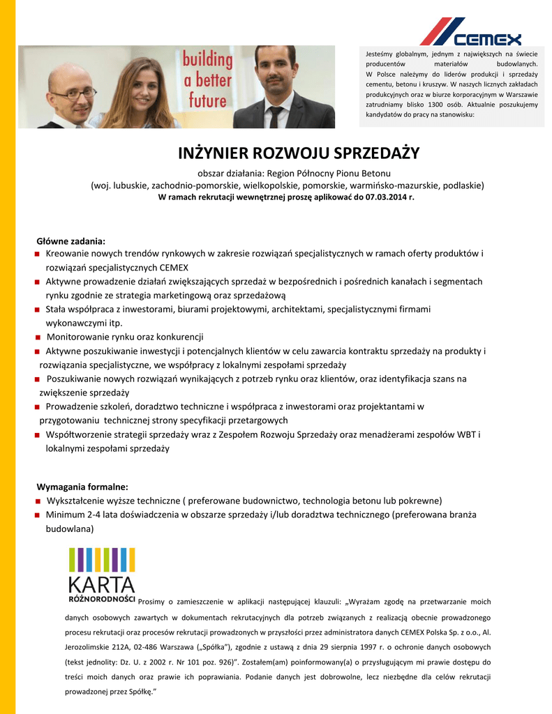 Jesteśmy globalnym, jednym z największych na świecie producentów materiałów budowlanych. W Polsce należymy do liderów produkcji i sprzedaży cementu, betonu i kruszyw. W naszych licznych zakładach produkcyjnych oraz w biurze korporacyjnym w Warszawie zatrudniamy blisko 1300 osób. Aktualnie poszukujemy kandydatów do pracy na stanowisku: INŻYNIER ROZWOJU SPRZEDAŻY obszar działania: Region Północny Pionu Betonu (woj. lubuskie, zachodnio-pomorskie, wielkopolskie, pomorskie, warmińsko-mazurskie, podlaskie) W ramach rekrutacji wewnętrznej proszę aplikować do 07.03.2014 r. Główne zadania: Kreowanie nowych trendów rynkowych w zakresie rozwiązań specjalistycznych w ramach oferty produktów i rozwiązań specjalistycznych CEMEX Aktywne prowadzenie działań zwiększających sprzedaż w bezpośrednich i pośrednich kanałach i segmentach rynku zgodnie ze strategia marketingową oraz sprzedażową Stała współpraca z inwestorami, biurami projektowymi, architektami, specjalistycznymi firmami wykonawczymi itp. Monitorowanie rynku oraz konkurencji Aktywne poszukiwanie inwestycji i potencjalnych klientów w celu zawarcia kontraktu sprzedaży na produkty i rozwiązania specjalistyczne, we współpracy z lokalnymi zespołami sprzedaży Poszukiwanie nowych rozwiązań wynikających z potrzeb rynku oraz klientów, oraz identyfikacja szans na zwiększenie sprzedaży Prowadzenie szkoleń, doradztwo techniczne i współpraca z inwestorami oraz projektantami w przygotowaniu technicznej strony specyfikacji przetargowych Współtworzenie strategii sprzedaży wraz z Zespołem Rozwoju Sprzedaży oraz menadżerami zespołów WBT i lokalnymi zespołami sprzedaży Wymagania formalne: Wykształcenie wyższe techniczne ( preferowane budownictwo, technologia betonu lub pokrewne) Minimum 2-4 lata doświadczenia w obszarze sprzedaży i/lub doradztwa technicznego (preferowana branża budowlana) Prosimy o zamieszczenie w aplikacji następującej klauzuli: „Wyrażam zgodę na przetwarzanie moich danych osobowych zawartych w dokumentach rekrutacyjnych dla potrzeb związanych z realizacją obecnie prowadzonego procesu rekrutacji oraz procesów rekrutacji prowadzonych w przyszłości przez administratora danych CEMEX Polska Sp. z o.o., Al. Jerozolimskie 212A, 02-486 Warszawa („Spółka”), zgodnie z ustawą z dnia 29 sierpnia 1997 r. o ochronie danych osobowych (tekst jednolity: Dz. U. z 2002 r. Nr 101 poz. 926)”. Zostałem(am) poinformowany(a) o przysługującym mi prawie dostępu do treści moich danych oraz prawie ich poprawiania. Podanie danych jest dobrowolne, lecz niezbędne dla celów rekrutacji prowadzonej przez Spółkę.” Doświadczenie we wprowadzeniu nowych rozwiązań na rynek B2B jako dodatkowy atut Umiejętność pozyskiwania klientów, prowadzenia negocjacji i budowania długoterminowych relacji Umiejętność rozwiązywania problemów w relacjach z klientami / partnerami z branży Otwartość na postrzeganie rynku, umiejętność obserwacji działań konkurencji Rozumienie i przewidywanie potrzeb klientów / partnerów z branży budowlanej Chęć do poszukiwania innowacyjnych rozwiązań w celu zaspokojenia potrzeb rynku i klientów Dobra znajomość obsługi programów pakietu MS Office Mobilność i dyspozycyjność, gotowość do odbywania częstych podróży służbowych Posiadanie ważnego prawa jazdy kat. B i praktyka w prowadzeniu samochodu Oczekiwania interpersonalne: Samodzielność i inicjatywa w realizacji powierzonych zadań Łatwość w nawiązywaniu i utrzymywaniu kontaktów z ludźmi, umiejętność pracy zespołowej Orientacja na klienta i umiejętność budowania relacji biznesowych Ambicja i gotowość do podejmowania wyzwań Kreatywność i gotowość do poszukiwania niestandardowych rozwiązań Zmysł techniczny Umiejętność samodzielnego planowania i organizacji pracy Co możesz zyskać pracując w CEMEX-ie? Pracę w dużej i stabilnej firmie o globalnym zasięgu Możliwość rozwoju, nauki i zdobywania doświadczenia w różnych obszarach biznesu Rozległą sieć międzynarodowych kontaktów Konkurencyjne wynagrodzenie, szeroki pakiet świadczeń dodatkowych oraz rozbudowane usługi dla pracowników Wszystkie osoby zainteresowane udziałem w rekrutacji prosimy o przesłanie CV oraz listu motywacyjnego klikając przycisk APLIKUJ znajdujący się na dole ogłoszenia. Jesteśmy otwarci na zatrudnianie osób niepełnosprawnych spełniających wymagania rekrutacyjne. Informujemy, że wszystkie nadesłane aplikacje zostaną poddane wnikliwej analizie, jednak odpowiemy tylko na wybrane zgłoszenia. Prosimy o zamieszczenie w aplikacji następującej klauzuli: „Wyrażam zgodę na przetwarzanie moich danych osobowych zawartych w dokumentach rekrutacyjnych dla potrzeb związanych z realizacją obecnie prowadzonego procesu rekrutacji oraz procesów rekrutacji prowadzonych w przyszłości przez administratora danych CEMEX Polska Sp. z o.o., Al. Jerozolimskie 212A, 02-486 Warszawa („Spółka”), zgodnie z ustawą z dnia 29 sierpnia 1997 r. o ochronie danych osobowych (tekst jednolity: Dz. U. z 2002 r. Nr 101 poz. 926)”. Zostałem(am) poinformowany(a) o przysługującym mi prawie dostępu do treści moich danych oraz prawie ich poprawiania. Podanie danych jest dobrowolne, lecz niezbędne dla celów rekrutacji prowadzonej przez Spółkę.” Prosimy o zamieszczenie w aplikacji następującej klauzuli: „Wyrażam zgodę na przetwarzanie moich danych osobowych zawartych w dokumentach rekrutacyjnych dla potrzeb związanych z realizacją obecnie prowadzonego procesu rekrutacji oraz procesów rekrutacji prowadzonych w przyszłości przez administratora danych CEMEX Polska Sp. z o.o., Al. Jerozolimskie 212A, 02-486 Warszawa („Spółka”), zgodnie z ustawą z dnia 29 sierpnia 1997 r. o ochronie danych osobowych (tekst jednolity: Dz. U. z 2002 r. Nr 101 poz. 926)”. Zostałem(am) poinformowany(a) o przysługującym mi prawie dostępu do treści moich danych oraz pr