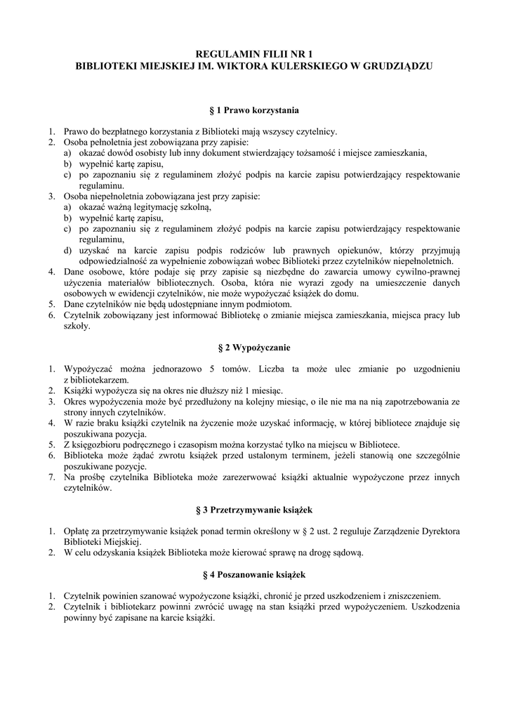 REGULAMIN FILII NR 1 BIBLIOTEKI MIEJSKIEJ IM. WIKTORA KULERSKIEGO W GRUDZIĄDZU § 1 Prawo korzystania 1. Prawo do bezpłatnego korzystania z Biblioteki mają wszyscy czytelnicy. 2. Osoba pełnoletnia jest zobowiązana przy zapisie: a) okazać dowód osobisty lub inny dokument stwierdzający tożsamość i miejsce zamieszkania, b) wypełnić kartę zapisu, c) po zapoznaniu się z regulaminem złożyć podpis na karcie zapisu potwierdzający respektowanie regulaminu. 3. Osoba niepełnoletnia zobowiązana jest przy zapisie: a) okazać ważną legitymację szkolną, b) wypełnić kartę zapisu, c) po zapoznaniu się z regulaminem złożyć podpis na karcie zapisu potwierdzający respektowanie regulaminu, d) uzyskać na karcie zapisu podpis rodziców lub prawnych opiekunów, którzy przyjmują odpowiedzialność za wypełnienie zobowiązań wobec Biblioteki przez czytelników niepełnoletnich. 4. Dane osobowe, które podaje się przy zapisie są niezbędne do zawarcia umowy cywilno-prawnej użyczenia materiałów bibliotecznych. Osoba, która nie wyrazi zgody na umieszczenie danych osobowych w ewidencji czytelników, nie może wypożyczać książek do domu. 5. Dane czytelników nie będą udostępniane innym podmiotom. 6. Czytelnik zobowiązany jest informować Bibliotekę o zmianie miejsca zamieszkania, miejsca pracy lub szkoły. § 2 Wypożyczanie 1. Wypożyczać można jednorazowo 5 tomów. Liczba ta może ulec zmianie po uzgodnieniu z bibliotekarzem. 2. Książki wypożycza się na okres nie dłuższy niż 1 miesiąc. 3. Okres wypożyczenia może być przedłużony na kolejny miesiąc, o ile nie ma na nią zapotrzebowania ze strony innych czytelników. 4. W razie braku książki czytelnik na życzenie może uzyskać informację, w której bibliotece znajduje się poszukiwana pozycja. 5. Z księgozbioru podręcznego i czasopism można korzystać tylko na miejscu w Bibliotece. 6. Biblioteka może żądać zwrotu książek przed ustalonym terminem, jeżeli stanowią one szczególnie poszukiwane pozycje. 7. Na prośbę czytelnika Biblioteka może zarezerwować książki aktualnie wypożyczone przez innych czytelników. § 3 Przetrzymywanie książek 1. Opłatę za przetrzymywanie książek ponad termin określony w § 2 ust. 2 reguluje Zarządzenie Dyrektora Biblioteki Miejskiej. 2. W celu odzyskania książek Biblioteka może kierować sprawę na drogę sądową. § 4 Poszanowanie książek 1. Czytelnik powinien szanować wypożyczone książki, chronić je przed uszkodzeniem i zniszczeniem. 2. Czytelnik i bibliotekarz powinni zwrócić uwagę na stan książki przed wypożyczeniem. Uszkodzenia powinny być zapisane na karcie książki. § 5 Zagubienie, zniszczenie lub uszkodzenie książek 1. Czytelnik jest zobowiązany odkupić zagubioną lub zniszczoną książkę. O ile odkupienie jest niemożliwe, czytelnik powinien zapłacić wartość książki ustaloną przez kierownika Filii. Za zagubiony lub uszkodzony jeden tom dzieła wielotomowego pobiera się należność za całe dzieło. Pozostałe tomy stanowią nadal własność Biblioteki. 2. Czytelnik może, za zgodą bibliotekarza, dostarczyć za zagubioną lub zniszczoną pozycję inną książkę przydatną dla Biblioteki. 3. Za uszkodzenie książki czytelnik jest zobowiązany zapłacić odszkodowanie. Wysokość odszkodowania określa kierownik Filii. 4. W przypadku czytelników niepełnoletnich za uszkodzenie, zniszczenie lub zagubienie książek odpowiadają rodzice lub prawni opiekunowie. § 6 Informacje i porady 1. Czytelnik ma prawo do korzystania z usług informacyjnych i poradnictwa bibliotecznego, świadczonych przez pracowników Biblioteki. § 7 Życzenia i uwagi czytelników 1. Wszelkie życzenia i uwagi czytelnik może wpisywać do „Książki życzeń i zażaleń”, która znajduje się u kierownika Filii. § 8 Przepisy porządkowe 1. W Bibliotece obowiązuje cisza oraz zakaz palenia tytoniu i używania telefonów komórkowych. § 9 Przepisy końcowe 1. Czytelnik nie stosujący się do postanowień niniejszego regulaminu może być na podstawie decyzji kierownika Filii, czasowo pozbawiony prawa korzystania z Biblioteki. Od decyzji kierownika Filii czytelnikowi przysługuje prawo odwołania się do Dyrektora Biblioteki. 2. Sprawy nieuregulowane postanowieniami niniejszego regulaminu rozstrzyga Dyrektor Biblioteki Miejskiej im. Wiktora Kulerskiego w Grudziądzu, ul. Legionów 28. Niniejszy regulamin opracowano na podstawie Ustawy o bibliotekach z 27.06.1997 r. (Dz. U. nr 85 poz. 539). Zatwierdzam: Grudziądz, dnia 11 marca 2008 r. Grudziądz, 22.07.2009 r. ZARZĄDZENIE NR 10/2009 DYREKTORA BIBLIOTEKI MIEJSKIEJ IM. W. KULERSKIEGO W GRUDZIĄDZU Z dniem 1 sierpnia 2009 roku wprowadzam następującą opłatę za przetrzymywanie książek ponad termin określony w regulaminie biblioteki w wysokości 2,00 zł od każdego tomu za każdy rozpoczynający się miesiąc po terminie zwrotu. Koszt wysłania upomnienia ustalam na 2,00 zł za upomnienie. Jednocześnie informuję, że Biblioteka nie ma obowiązku wysyłania upomnieo. Zarządzenie obowiązuje w całej sieci Biblioteki Miejskiej tj. w Bibliotece Głównej oraz filiach bibliotecznych na terenie miasta.