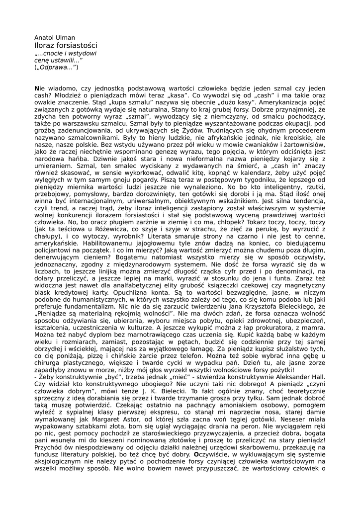 Anatol Ulman Iloraz forsiastości „...cnocie i wstydowi cenę ustawili...” („Odprawa...”) Nie wiadomo, czy jednostką podstawową wartości człowieka będzie jeden szmal czy jeden cash? Młodzież o pieniądzach mówi teraz „kasa”. Co wywodzi się od „cash” i ma takie oraz owakie znaczenie. Stąd „kupa szmalu” nazywa się obecnie „dużo kasy”. Amerykanizacja pojęć związanych z gotówką wydaje się naturalna, Stany to kraj grubej forsy. Dobrze przynajmniej, że zdycha ten potworny wyraz „szmal”, wywodzący się z niemczyzny, od smalcu pochodzący, także po warszawsku szmalcu. Szmal były to pieniądze wyszantażowane podczas okupacji, pod groźbą zadenuncjowania, od ukrywających się Żydów. Trudniących się ohydnym procederem nazywano szmalcownikami. Były to hieny ludzkie, nie afrykańskie jednak, nie kreolskie, ale nasze, nasze polskie. Bez wstydu używano przez pół wieku w mowie cwaniaków i żartownisiów, jako że raczej niechętnie wspominano genezę wyrazu, tego pojęcia, w którym odciśnięta jest narodowa hańba. Dziwnie jakoś stara i nowa nieformalna nazwa pieniędzy kojarzy się z umieraniem. Szmal, ten smalec wyciskany z wydawanych na śmierć, a „cash in” znaczy również skasować, w sensie wykorkować, odwalić kitę, kopnąć w kalendarz, żeby użyć pojęć wylęgłych w tym samym gnoju pogardy. Piszą teraz w postępowym tygodniku, że lepszego od pieniędzy miernika wartości ludzi jeszcze nie wynaleziono. No bo kto inteligentny, rzutki, przebojowy, pomysłowy, bardzo dorozwinięty, ten gotówki się dorobi i ją ma. Stąd ilość onej winna być internacjonalnym, uniwersalnym, obiektywnym wskaźnikiem. Jest silna tendencja, czyli trend, a raczej trąd, żeby iloraz inteligencji zastąpiony został właściwszym w systemie wolnej konkurencji ilorazem forsiastości i stał się podstawową wyceną prawdziwej wartości człowieka. No, bo oracz pługiem zarżnie w ziemię i co ma, chłopek? Tokarz toczy, toczy, toczy (jak ta teściowa u Różewicza, co szyje i szyje w strachu, że zięć za perukę, by wyrzucić z chałupy), i co wytoczy, wyrobnik? Literata smaruje strony na czarno i nie jest to cenne, amerykańskie. Habilitowanemu jajogłowemu tyle znów dadzą na koniec, co biedującemu policjantowi na początek. I co im mierzyć? Jaką wartość zmierzyć można chudemu poza długim, denerwującym cieniem? Bogatemu natomiast wszystko mierzy się w sposób oczywisty, jednoznaczny, zgodny z międzynarodowym systemem. Nie dość że forsa wyrazić się da w liczbach, to jeszcze linijką można zmierzyć długość rządka cyfr przed i po denominacji, na dolary przeliczyć, a jeszcze lepiej na marki, wyrazić w stosunku do jena i funta. Zaraz też widoczna jest nawet dla analfabetycznej elity grubość książeczki czekowej czy magnetyczny blask kredytowej karty. Opuchlizna konta. Są to wartości bezwzględne, jasne, w niczym podobne do humanistycznych, w których wszystko zależy od tego, co się komu podoba lub jaki preferuje fundamentalizm. Nic nie da się zarzucić twierdzeniu Jana Krzysztofa Bieleckiego, że „Pieniądze są materialną rękojmią wolności”. Nie ma dwóch zdań, że forsa oznacza wolność sposobu odżywiania się, ubierania, wyboru miejsca pobytu, opieki zdrowotnej, ubezpieczeń, kształcenia, uczestniczenia w kulturze. A jeszcze wykupić można z łap prokuratora, z mamra. Można też nabyć dyplom bez marnotrawiącego czas uczenia się. Kupić każdą babę w każdym wieku i rozmiarach, zamiast, pozostając w pętach, budzić się codziennie przy tej samej obrzydłej i wściekłej, mającej nas za wyjątkowego łamagę. Za pieniądz kupisz służalstwo tych, co cię poniżają, pizzę i chińskie żarcie przez telefon. Można też sobie wybrać inna gębę u chirurga plastycznego, większe i twarde cycki w wypadku pań. Dzień tu, ale jasne zorze zapadłyby znowu w morze, niżby mój głos wyrzekł wszytki wolnościowe forsy pożytki! - Żeby konstruktywnie „być”, trzeba jednak „mieć” - stwierdza konstruktywnie Aleksander Hall. Czy widział kto konstruktywnego ubogiego? Nie uczyni taki nic dobrego! A pieniądz „czyni człowieka dobrym”, mówi tenże J. K. Bielecki. To fakt ogólnie znany, choć teoretycznie sprzeczny z ideą dorabiania się przez i twarde trzymanie grosza przy tyłku. Sam jednak dobroć taką muszę potwierdzić. Czekając ostatnio na pachnący amoniakiem osobowy, pomogłem wyleźć z sypialnej klasy pierwszej ekspresu, co stanął mi naprzeciw nosa, starej damie wymalowanej jak Margaret Astor, od której szła zacna woń tęgiej gotówki. Neseser miała wypakowany sztabkami złota, bom się ugiął wyciągając drania na peron. Nie wyciągałem ręki po nic, gest pomocy pochodził ze staroświeckiego przyzwyczajenia, a przecież dobra, bogata pani wsunęła mi do kieszeni nominowaną złotówkę i proszę to przeliczyć na stary pieniądz! Przychód ów niespodziewany od odjęciu działki należnej urzędowi skarbowemu, przekazuję na fundusz literatury polskiej, bo też chcę być dobry. Oczywiście, w wykluwającym się systemie aksjologicznym nie należy pytać o pochodzenie forsy czyniącej człowieka wartościowym na wszelki możliwy sposób. Nie wolno bowiem nawet przypuszczać, że wartościowy człowiek o wysokim ilorazie forsiastości dorobił się na rabunku, oszustwach, prostytucji, kradzieży, malwersacji, aferach, szantażu, wymuszeniach, wyłudzeniach, łapówkach, morderstwach. Czytamy przecież, iż przekonanie, że powodzenie jest cechą kombinatorów „to sposób myślenia wyjątkowo destrukcyjny dla społeczeństwa odchodzącego od kolektywizmu!” Zresztą, jak piszą, co sprawę badali, nawet niezgodne z prawem zarabianie cieszy się społecznym uznaniem. Naród nie przepada za uczciwymi, bo nie lubi odmienności. Dotychczas, diabli wiedzą dlaczego, było tak, że bogacz nie był uznawany za intelektualistę ani kanonizowany, choćby kupił so