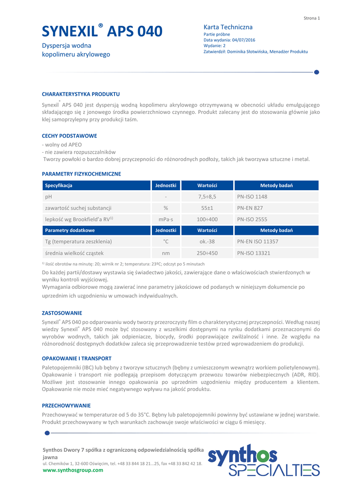 Strona 1 SYNEXIL® APS 040 Karta Techniczna Partie próbne Data wydania: 04/07/2016 Wydanie: 2 Zatwierdził: Dominika Słotwińska, Menadżer Produktu Dyspersja wodna kopolimeru akrylowego CHARAKTERYSTYKA PRODUKTU ® Synexil APS 040 jest dyspersją wodną kopolimeru akrylowego otrzymywaną w obecności układu emulgującego składającego się z jonowego środka powierzchniowo czynnego. Produkt zalecany jest do stosowania głównie jako klej samoprzylepny przy produkcji taśm. CECHY PODSTAWOWE - wolny od APEO - nie zawiera rozpuszczalników Tworzy powłoki o bardzo dobrej przyczepności do różnorodnych podłoży, takich jak tworzywa sztuczne i metal. PARAMETRY FIZYKOCHEMICZNE Specyfikacja Jednostki Wartości pH - 7,5÷8,5 zawartość suchej substancji % 55±1 lepkość wg Brookfield’a RV1) mPa∙s 100÷400 Jednostki Wartości Tg (temperatura zeszklenia) °C ok.-38 średnia wielkość cząstek nm 250÷450 Parametry dodatkowe 1) Metody badań PN-ISO 1148 PN-EN 827 PN-ISO 2555 Metody badań PN-EN ISO 11357 PN-ISO 13321 ilość obrotów na minutę: 20; wirnik nr 2; temperatura: 23ºC; odczyt po 5 minutach Do każdej partii/dostawy wystawia się świadectwo jakości, zawierające dane o właściwościach stwierdzonych w wyniku kontroli wyjściowej. Wymagania odbiorowe mogą zawierać inne parametry jakościowe od podanych w niniejszym dokumencie po uprzednim ich uzgodnieniu w umowach indywidualnych. ZASTOSOWANIE Synexil® APS 040 po odparowaniu wody tworzy przezroczysty film o charakterystycznej przyczepności. Według naszej wiedzy Synexil® APS 040 może być stosowany z wszelkimi dostępnymi na rynku dodatkami przeznaczonymi do wyrobów wodnych, takich jak odpieniacze, biocydy, środki poprawiające zwilżalność i inne. Ze względu na różnorodność dostępnych dodatków zaleca się przeprowadzenie testów przed wprowadzeniem do produkcji. OPAKOWANIE I TRANSPORT Paletopojemniki (IBC) lub bębny z tworzyw sztucznych (bębny z umieszczonym wewnątrz workiem polietylenowym). Opakowanie i transport nie podlegają przepisom dotyczącym przewozu towarów niebezpiecznych (ADR, RID). Możliwe jest stosowanie innego opakowania po uprzednim uzgodnieniu między producentem a klientem. Opakowanie nie może mieć negatywnego wpływu na jakość produktu. PRZECHOWYWANIE Przechowywać w temperaturze od 5 do 35°C. Bębny lub paletopojemniki powinny być ustawiane w jednej warstwie. Produkt przechowywany w tych warunkach zachowuje swoje właściwości w ciągu 6 miesięcy. Synthos Dwory 7 spółka z ograniczoną odpowiedzialnością spółka jawna ul. Chemików 1, 32-600 Oświęcim, tel. +48 33 844 18 21...25, fax +48 33 842 42 18. www.synthosgroup.com Strona 2 Niniejszy dokument ma charakter informacyjny. Informacje w nim podane opierają się na aktualnym stanie naszej wiedzy i doświadczeniu. Nie stanowią one gwarancji właściwości produktu ani specyfikacji jakościowej i nie mogą być podstawą do reklamacji. Przedstawione informacje nie mogą mieć zastosowania dla mieszanin produktu z innymi substancjami. Produkt powinien być transportowany, magazynowany i stosowany zgodnie z obowiązującymi przepisami oraz dobrymi praktykami higieny pracy. Wykorzystanie podanych informacji, jak i stosowanie produktu, nie są kontrolowane przez producenta, a zatem określenie warunków bezpieczeństwa stosowania jest obowiązkiem użytkownika. Synthos Dwory 7 spółka z ograniczoną odpowiedzialnością spółka jawna ul. Chemików 1, 32-600 Oświęcim, tel. +48 33 844 18 21...25, fax +48 33 842 42 18. www.synthosgroup.com