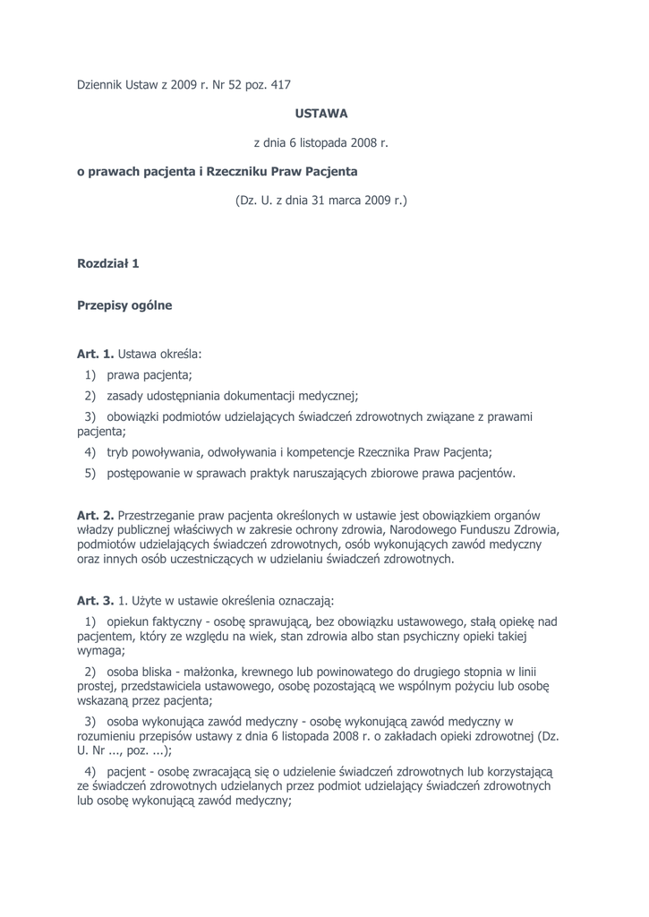 Dziennik Ustaw z 2009 r. Nr 52 poz. 417 USTAWA z dnia 6 listopada 2008 r. o prawach pacjenta i Rzeczniku Praw Pacjenta (Dz. U. z dnia 31 marca 2009 r.) Rozdział 1 Przepisy ogólne Art. 1. Ustawa określa: 1) prawa pacjenta; 2) zasady udostępniania dokumentacji medycznej; 3) obowiązki podmiotów udzielających świadczeń zdrowotnych związane z prawami pacjenta; 4) tryb powoływania, odwoływania i kompetencje Rzecznika Praw Pacjenta; 5) postępowanie w sprawach praktyk naruszających zbiorowe prawa pacjentów. Art. 2. Przestrzeganie praw pacjenta określonych w ustawie jest obowiązkiem organów władzy publicznej właściwych w zakresie ochrony zdrowia, Narodowego Funduszu Zdrowia, podmiotów udzielających świadczeń zdrowotnych, osób wykonujących zawód medyczny oraz innych osób uczestniczących w udzielaniu świadczeń zdrowotnych. Art. 3. 1. UŜyte w ustawie określenia oznaczają: 1) opiekun faktyczny - osobę sprawującą, bez obowiązku ustawowego, stałą opiekę nad pacjentem, który ze względu na wiek, stan zdrowia albo stan psychiczny opieki takiej wymaga; 2) osoba bliska - małŜonka, krewnego lub powinowatego do drugiego stopnia w linii prostej, przedstawiciela ustawowego, osobę pozostającą we wspólnym poŜyciu lub osobę wskazaną przez pacjenta; 3) osoba wykonująca zawód medyczny - osobę wykonującą zawód medyczny w rozumieniu przepisów ustawy z dnia 6 listopada 2008 r. o zakładach opieki zdrowotnej (Dz. U. Nr ..., poz. ...); 4) pacjent - osobę zwracającą się o udzielenie świadczeń zdrowotnych lub korzystającą ze świadczeń zdrowotnych udzielanych przez podmiot udzielający świadczeń zdrowotnych lub osobę wykonującą zawód medyczny; 5) podmiot udzielający świadczeń zdrowotnych - zakład opieki zdrowotnej oraz indywidualną praktykę lekarską, indywidualną specjalistyczną praktykę lekarską, grupową praktykę lekarską, indywidualną praktykę pielęgniarek, połoŜnych, indywidualną specjalistyczną praktykę pielęgniarek, połoŜnych oraz grupową praktykę pielęgniarek, połoŜnych oraz jednostkę badawczo-rozwojową, o której mowa w art. 2 ust. 6 ustawy z dnia 25 lipca 1985 r. o jednostkach badawczo-rozwojowych (Dz. U. z 2008 r. Nr 159, poz. 993); 6) świadczenie zdrowotne - świadczenie zdrowotne w rozumieniu przepisów ustawy z dnia 6 listopada 2008 r. o zakładach opieki zdrowotnej; 7) stacjonarny zakład opieki zdrowotnej - stacjonarny zakład opieki zdrowotnej w rozumieniu przepisów ustawy z dnia 6 listopada 2008 r. o zakładach opieki zdrowotnej. 2. Ilekroć w ustawie jest mowa o lekarzu, rozumie się przez to takŜe lekarza dentystę oraz felczera w zakresie wynikającym z przepisów o zawodzie felczera. Art. 4. 1. W razie zawinionego naruszenia praw pacjenta sąd moŜe przyznać poszkodowanemu odpowiednią sumę tytułem zadośćuczynienia pienięŜnego za doznaną krzywdę na podstawie art. 448 Kodeksu cywilnego. 2. W razie zawinionego naruszenia prawa pacjenta do umierania w spokoju i godności sąd moŜe, na Ŝądanie małŜonka, krewnych lub powinowatych do drugiego stopnia w linii prostej lub przedstawiciela ustawowego, zasądzić odpowiednią sumę pienięŜną na wskazany przez nich cel społeczny na podstawie art. 448 Kodeksu cywilnego. 3. Przepisu ust. 1 nie stosuje się do zawinionego naruszenia prawa pacjenta do: 1) przechowywania rzeczy wartościowych w depozycie stacjonarnego zakładu opieki zdrowotnej; 2) informacji o rodzaju i zakresie świadczeń zdrowotnych udzielanych przez podmioty udzielające świadczeń zdrowotnych; 3) dostępu do dokumentacji medycznej dotyczącej jego stanu zdrowia. Art. 5. Kierownik podmiotu udzielającego świadczeń zdrowotnych lub upowaŜniony przez niego lekarz moŜe ograniczyć korzystanie z praw pacjenta w przypadku wystąpienia zagroŜenia epidemicznego lub ze względu na bezpieczeństwo zdrowotne pacjentów, a w przypadku praw, o których mowa w art. 33 ust. 1, takŜe ze względu na moŜliwości organizacyjne zakładu. Rozdział 2 Prawo pacjenta do świadczeń zdrowotnych Art. 6. 1. Pacjent ma prawo do świadczeń zdrowotnych odpowiadających wymaganiom aktualnej wiedzy medycznej. 2. Pacjent ma prawo, w sytuacji ograniczonych moŜliwości udzielenia odpowiednich świadczeń zdrowotnych, do przejrzystej, obiektywnej, opartej na kryteriach medycznych, procedury ustalającej kolejność dostępu do tych świadczeń. 3. Pacjent ma prawo Ŝądać, aby udzielający mu świadczeń zdrowotnych: 1) lekarz zasięgnął opinii innego lekarza lub zwołał konsylium lekarskie; 2) pielęgniarka (połoŜna) zasięgnęła opinii innej pielęgniarki (połoŜnej). 4. Lekarz moŜe odmówić zwołania konsylium lekarskiego lub zasięgnięcia opinii innego lekarza, jeŜeli uzna, Ŝe Ŝądanie, o którym mowa w ust. 3, jest bezzasadne. 5. śądanie, o którym mowa w ust. 3, oraz odmowę, o której mowa w ust. 4, odnotowuje się w dokumentacji medycznej. 6. Przepisy ust. 4 i 5 stosuje się do pielęgniarki (połoŜnej) w zakresie zasięgania opinii innej pielęgniarki (połoŜnej). Art. 7. 1. Pacjent ma prawo do natychmiastowego udzielenia świadczeń zdrowotnych ze względu na zagroŜenie zdrowia lub Ŝycia. 2. W przypadku porodu pacjentka ma prawo do uzyskania świadczeń zdrowotnych związanych z porodem. Art. 8. Pacjent ma prawo do świadczeń zdrowotnych udzielanych z naleŜytą starannością przez podmioty udzielające świadczeń zdrowotnych w warunkach odpowiadających określonym w odrębnych przepisach wymaganiom fachowym i sanitarnym. Przy udzielaniu świadczeń zdrowotnych osoby wykonujące zawód medyczny kierują się zasadami etyki zawodowej określonymi przez właściwe samorządy zawodów medycznych. Rozdział 3 Prawo pacjenta do informacji Art. 9. 1. Pacjent ma prawo do informacji o swoim stanie zdrowia. 2. Pacjent, w tym małoletni, który ukończył 16 lat, lub jego ustawowy przedstawiciel mają prawo do uzyskania od lekarza przystępnej informacji o stanie zdrowia pa