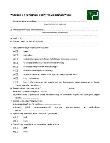 WNIOSEK O PRZYZNANIE DODATKU MIESZKANIOWEGO 1. Oznaczenie wnioskodawcy:...................................................................................... (nazwisko i imię, data urodzenia) .......................................................................................................................................................... 2. Oznaczenie miejsc zamieszkania: ............................................................................................... (miejsce zamieszkania wnioskodawcy) .......................................................................................................................................................... 3. telefon,fax: .................................................................................................................................. 4. Nazwa i siedziba zarządcy domu ................................................................................................. .......................................................................................................................................................... 5. Tytuł prawny zajmowanego mieszkania: a) najem b) podnajem c) spółdzielcze prawo do lokalu (lokatorskie lub własnościowe) d) własność lokalu w spółdzielni mieszkaniowej e) własność innego lokalu mieszkalnego f) własność domu jednorodzinnego g) własność budynku wielorodzinnego, w którym zajmuje lokal h) inny tytuł prawny i) bez tytułu prawnego, ale oczekujący na dostarczenie przysługującego im lokalu zamiennego lub socjalnego 6. Powierzchnia uŜytkowa lokalu* ............................................... w tym: a) łączna powierzchnia pokoi i kuchni* ........................................... b) powierzchnia zajmowana przez wnioskodawcę w przypadku najmu lub podnajmu części lokalu ............................... 7. Liczba osób niepełnosprawnych: a) poruszających się na wózku ................................... b) innych, jeŜeli niepełnosprawność wymaga pokoju ................................................ 8. Sposób ogrzewania lokalu: centralne ogrzewanie - a) jest b) brak 9. Sposób ogrzewania wody: centralnie ciepła woda - a) jest b) brak zamieszkiwania w oddzielnym 10.Instalacja gazu przewodowego: a) jest b) brak 11. Liczba osób w gospodarstwie domowym ...................................... 12. Razem dochody gospodarstwa domowego .......................................................................... zł (według deklaracji) 13. Stawka czynszu za 1 m2 powierzchni uŜytkowej ....................................................................... zł 14.Łączna kwota wydatków na mieszkanie za ostatni miesiąc** ................................................... zł (według okazanych dokumentów, zgodna z § 2 rozporządzenia Rady Ministrów z dnia 28.12.2001 r. w sprawie dodatków mieszkaniowych) Najemcy /podnajemcy/ inny tytuł Członkowie spółdzielni / właściciele i najemcy lokali w budynkach spółdzielni Właściciele lokali mieszkalnych Właściciele domów jednorodzinnych Osoby zajmujące lokal bez tytułu Czynsz albo inne opłaty za uŜywanie lokalu Koszty eksploatacji i remontów Zal. na koszty zarządu z wył. c.o z wył. ubezp., podatku ubezp., podatku i wieczystego uŜytk. gruntów wieczystego uŜytkowania gruntów odszkodowanie c.o. c.o. c.o. Woda c.o. Woda Woda Woda Śmieci woda Śmieci Śmieci Śmieci Kanaliz. śmieci Kanaliz. Kanaliz. Kanaliz. Kanaliz. Fundusz remontowy Razem: Razem: Razem: Razem: Razem: Potwierdzenie przez zarządcę danych zawartych w pkt. 2-5, 7-9, 12-13 ............................................................... (podpis zarządcy) * w przypadku przekroczenia pow. normatywnej o 30% ale o więcej niŜ 50% pod warunkiem, Ŝe udział powierzchni pokoi i kuchni w powierzchni uŜytkowej lokalu nie przekracza 60% ** miesiąc , w którym składany jest wniosek § 2 rozporządzenia Rady Ministrów z dnia 28 grudnia 2001 r. w sprawie dodatków mieszkaniowych Podstawę obliczenia dodatku mieszkaniowego stanowią następujące rodzaje wydatków w gospodarstwach domowych: 1. najemców i podnajemców oraz innych osób mających tytuł prawny do uŜywania lokalu z wyjątkiem wymienionych w pkt. 2-5 - czynsz albo inne opłaty za uŜywanie lokalu oraz opłaty za energię cieplną, wodę, odbiór nieczystości stałych i płynnych, 2. członków spółdzielni mieszkaniowych oraz właścicieli i najemców w budynkach spółdzielni mieszkaniowych – opłaty za energię cieplną, wodę, odbiór nieczystości stałych i płynnych oraz koszty eksploatacji i remontów z wyłączeniem ubezpieczenia, podatku od nieruchomości i opłaty za wieczyste uŜytkowanie gruntów, 3. właścicieli lokali mieszkalnych – opłaty za energię cieplną i wodę dostarczane do lokalu, opłaty za odbiór nieczystości stałych i płynnych oraz zaliczki na koszty zarządu nieruchomością z wyłączeniem ubezpieczenia, podatku od nieruchomości i opłaty za wieczyste uŜytkowanie gruntów, 4. osób uŜywających lokali mieszkalnych w budynkach wielorodzinnych stanowiących ich własność oraz właścicieli domów jednorodzinnych – opłaty za energię cieplną i wodę dostarczane do lokalu, opłaty za odbiór nieczystości stałych i płynnych, 5. zajmujących lokal bez tytułu prawnego i oczekujących na dostarczenie przysługującego im lokalu zamiennego lub socjalnego – odszkodowanie za zajmowanie lokalu bez tytułu prawnego oraz opłaty za energię cieplną, wodę, odbiór nieczystości stałych i płynnych z wyłączeniem ubezpieczenie, podatku od nieruchomości i opłaty za wieczyste uŜytkowanie gruntów. (data, podpis przyjmującego) (data, podpis wnioskodawcy) DEKLARACJA O WYSOKOŚCI DOCHODÓW 1. Oznaczenie wnioskodawcy:........................................................................................ 2. (nazwisko i imię, data urodzenia) .............................................................................................
