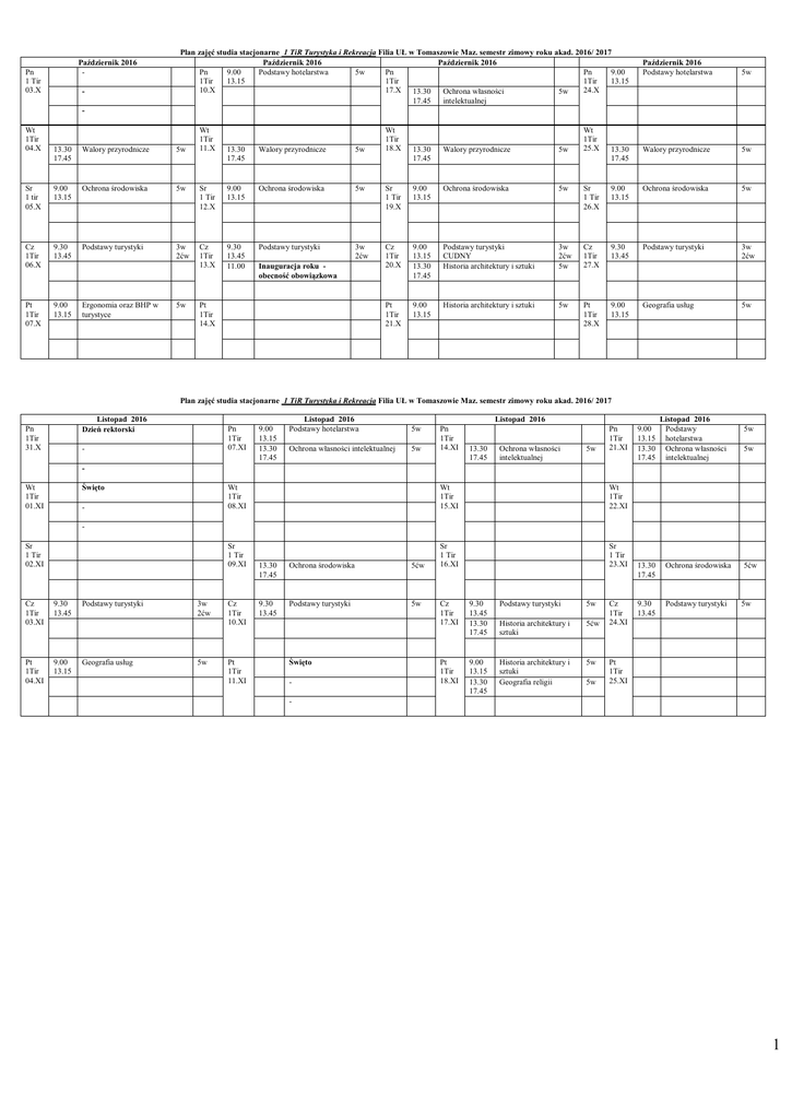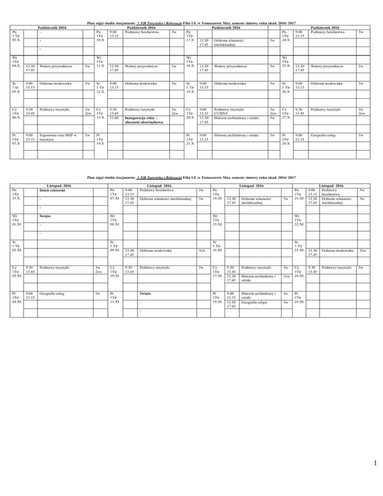 Październik 2016 - Pn 1 Tir 03.X - Plan zajęć studia stacjonarne 1 TiR Turystyka i Rekreacja Filia UŁ w Tomaszowie Maz. semestr zimowy roku akad. 2016/ 2017 Październik 2016 Październik 2016 Pn 9.00 Podstawy hotelarstwa 5w Pn Pn 9.00 1Tir 13.15 1Tir 1Tir 13.15 10.X 17.X 13.30 24.X Ochrona własności 5w 17.45 intelektualnej Październik 2016 Podstawy hotelarstwa 5w 13.30 17.45 Walory przyrodnicze 5w Wt 1Tir 04.X 13.30 17.45 Walory przyrodnicze 5w Sr 1 tir 05.X 9.00 13.15 Ochrona środowiska 5w Cz 1Tir 06.X 9.30 13.45 Podstawy turystyki 3w 2ćw Pt 1Tir 07.X 9.00 13.15 Ergonomia oraz BHP w turystyce 5w Wt 1Tir 11.X 13.30 17.45 Walory przyrodnicze 5w Sr 1 Tir 12.X 9.00 13.15 Ochrona środowiska 5w Cz 1Tir 13.X 9.30 13.45 11.00 Podstawy turystyki 3w 2ćw Inauguracja roku obecność obowiązkowa Pt 1Tir 14.X Wt 1Tir 18.X Wt 1Tir 25.X 13.30 17.45 Walory przyrodnicze 5w Sr 1 Tir 19.X 9.00 13.15 Ochrona środowiska 5w Sr 1 Tir 26.X 9.00 13.15 Ochrona środowiska 5w Cz 1Tir 20.X 9.00 13.15 13.30 17.45 Podstawy turystyki CUDNY Historia architektury i sztuki 3w 2ćw 5w Cz 1Tir 27.X 9.30 13.45 Podstawy turystyki 3w 2ćw Pt 1Tir 21.X 9.00 13.15 Historia architektury i sztuki 5w Pt 1Tir 28.X 9.00 13.15 Geografia usług 5w Plan zajęć studia stacjonarne 1 TiR Turystyka i Rekreacja Filia UŁ w Tomaszowie Maz. semestr zimowy roku akad. 2016/ 2017 Listopad 2016 Dzień rektorski Pn 1Tir 31.X Pn 1Tir 07.XI - 9.00 13.15 13.30 17.45 Listopad 2016 Podstawy hotelarstwa 5w Listopad 2016 Ochrona własności intelektualnej 5w Pn 1Tir 14.XI 13.30 17.45 Ochrona własności intelektualnej 5w Pn 1Tir 21.XI 9.00 13.15 13.30 17.45 Listopad 2016 Podstawy hotelarstwa Ochrona własności intelektualnej 5w 5w Święto Wt 1Tir 01.XI Wt 1Tir 08.XI - Wt 1Tir 15.XI Wt 1Tir 22.XI Sr 1 Tir 16.XI Sr 1 Tir 23.XI Sr 1 Tir 02.XI Sr 1 Tir 09.XI Cz 1Tir 03.XI 9.30 13.45 Pt 1Tir 04.XI 9.00 13.15 Podstawy turystyki Geografia usług 3w 2ćw 5w Cz 1Tir 10.XI Pt 1Tir 11.XI 13.30 17.45 Ochrona środowiska 5ćw 9.30 13.45 Podstawy turystyki 5w Święto - Cz 1Tir 17.XI 9.30 13.45 13.30 17.45 Podstawy turystyki 5w Historia architektury i sztuki 5ćw Pt 1Tir 18.XI 9.00 13.15 13.30 17.45 Historia architektury i sztuki Geografia religii 5w 5w Cz 1Tir 24.XI 13.30 17.45 Ochrona środowiska 9.30 13.45 Podstawy turystyki 5ćw 5w Pt 1Tir 25.XI - 1 Plan zajęć studia stacjonarne 1 TiR Turystyka i Rekreacja Filia UŁ w Tomaszowie Maz. semestr zimowy roku akad. 2016/ 2017 Pn 1 Tir 28.XI Listopad –Grudzień 2016 9.00 Podstawy hotelarstwa 13.15 5ćw Pn 1 Tir 05.XII Grudzień 2016 Podstawy hotelarstwa 9.00 13.15 5ćw Pn 1 Tir 12.XII 9.00 13.15 Grudzień 2016 Podstawy hotelarstwa 5ćw Pn 1 Tir 19.XII Wt 1 Tir 29.XI Wt 1 Tir 06.XII Wt 1 Tir 13.XII Wt 20.XII 1 Tir Śr 1 Tir 30.XI Śr 1 Tir 07.XII Śr 1 Tir 14.XII Śr 1 Tir 21.XII Cz 1 Tir 01.XII 9.00 13.15 Historia architektury i sztuki 5ćw Cz 1 Tir 08.XII Pt 1 Tir 02.XII 9.00 13.15 13.30 17.45 Turystyka a dziedzictwo kulturowe Geografia religii Gosik 5k Pt 1 Tir 09.XII 5w Geografia ludności 9.30 13.45 13.15 17.45 Ergonomia oraz BHP w turystyce Gosik 5w 5w Cz 1 Tir 15.XII 9.30 13.45 Geografia ludności 5w Czw 1 Tir 22.XII Pt 1 Tir 16.XII 9.00 13.15 Historia turystyki 5k Pt 1 Tir 23.XII Grudzień 2016 9.00 Podstawy hotelarstwa 13.15 13.30 Pedagogika czasu 17.45 wolnego 9.00 13.15 Historia turystyki 5ćw 5k 5k Wakacje zimowe Wakacje zimowe Wakacje zimowe Plan zajęć studia stacjonarne 1 TiR Turystyka i Rekreacja Filia UŁ w Tomaszowie Maz. semestr zimowy roku akad. 2016/ 2017 Pn 1 Tir 26.XII Grudzień 2016 Wakacje zimowe Wakacje zimowe Pn 1 Tir 02.I Wakacje zimowe Wt 1 Tir 27 .XII Wakacje zimowe Wakacje zimowe Styczeń 2017 Wakacje zimowe Wakacje zimowe Pn 1 Tir 09.I 9.0013.15 Styczeń 2017 Pedagogika czasu wolnego 5k Pn 1 Tir 16.I 9.0013.15 Styczeń 2017 Pedagogika czasu wolnego 5k Wakacje zimowe Wt 1 Tir 03. I Wt 1 Tir 10.I Wt 1 Tir 17.I Śr 1 Tir 04.I Śr 1 Tir 11.I Śr 1 Tir 18.I Cz 1 Tir 05.I Cz 1 Tir 12.I Wakacje zimowe Śr 1 Tir 28.XII Wakacje zimowe Wakacje zimowe Wakacje zimowe Cz 1 Tir 29.XII Wakacje zimowe Wakacje zimowe 9.00 13.15 Turystyka a dziedzictwo kulturowe 5k Cz 1 Tir 19.I Wakacje zimowe Pt 1 Tir 30.XII Wakacje zimowe Wakacje zimowe Wakacje zimowe Pt 1 Tir 06.I Święto - Pt 1 Tir 13.I Pt 1 Tir 20.I - Istotne terminy: W semestrze zimowym zajęcia trwają od 04 października 2016 r. do 22 stycznia 2017 r. Zimowa sesja egzaminacyjna od 23 stycznia do 05 lutego 2017; Zimowa sesja poprawkowa od 13 lutego do 19 lutego 2017 r. Przerwa międzysemestralna od 06 do 12 lutego 2017 r. Semestr letni rozpoczyna się od 20 lutego 2017 r. 2 Objaśnienia: w-wykład, ćw-ćwiczenia, k-konwersatorium; e-egzamin, z-zaliczenie na ocenę Przedmioty i prowadzący: 1 TIR –prowadzący zajęcia: Podstawy turystyki: dr Cudny, 30 wykład – egzamin +10 ćwiczeń w 1 grupie – zaliczenie – 4ECTS. Historia turystyki: dr Rouba 10 konwersatorium – zaliczenie - 2 ECTS. Podstawy hotelarstwa: dr Piech 20wykład – egzamin + 20ćwiczenia w 1 grupie – zaliczenie 3 ECTS. Ochrona środowiska z elementami geografii fizycznej: dr Piech, 20wykład – egzamin +10 ćwiczenia w 1 grupie – zaliczenie - 4 ECTS. Ochrona własności intelektualnej: dr Rupniewski, 20wykład – zalicznie - 1 ECTS. Walory przyrodnicze: dr Gosik, 20wykład - zaliczenie - 1 ECTS. Ergonomia oraz Bezpieczeństwo i Higiena Pracy w Turystyce: dr Gosik, 10wykład – zaliczenie - 1 ECTS. Turystyka a dziedzictwo kulturowe cz. 1 przedmiotu: prof. Rouba, 10 konwersatorium zaliczenie – bez ECTS w tym semestrze. Pedagogika czasu wolnego- cz. 1 przedmiotu: 15 konwersatorium – zaliczenie mgr Piotrowska Magdalena w 1 grupie – zal. - 1 ECTS. Geografia usług 10wykład – zaliczenie - dr Gosik - 1 ECTS. Geografia religii 10 wykład – zaliczenie - dr Gosik - 1 ECTS. Geografia ludności 10 wykład – zaliczenie - dr Cudny - 1 ECTS. Historia architektury i sztuki 15wykład – zaliczenie + 10 ćwiczenia w 1 grupie – zal. prof. Rouba. – cz