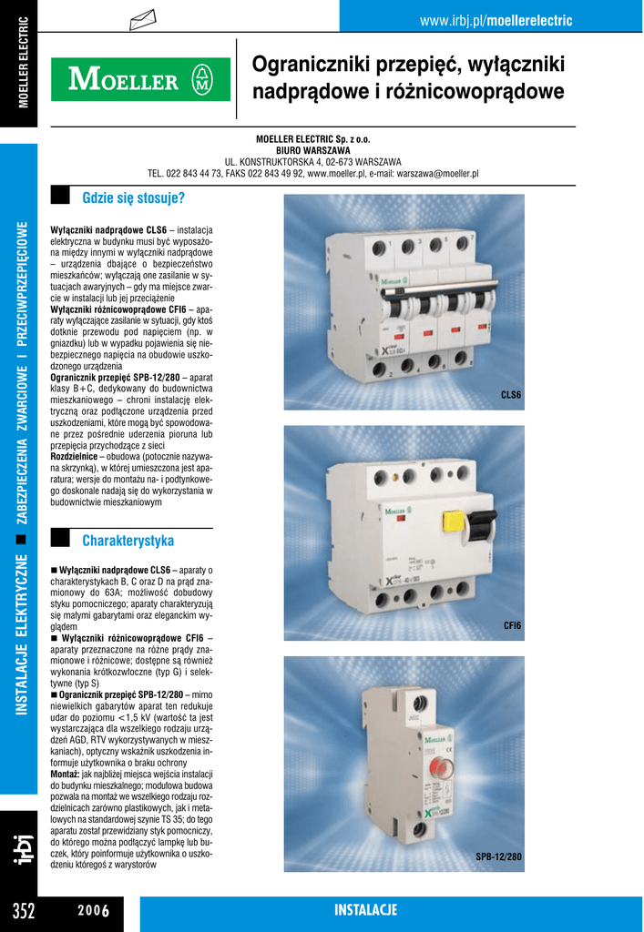 MOELLER ELECTRIC www.irbj.pl/moellerelectric Ograniczniki przepięć, wyłączniki nadprądowe i różnicowoprądowe MOELLER ELECTRIC Sp. z o.o. BIURO WARSZAWA UL. KONSTRUKTORSKA 4, 02-673 WARSZAWA TEL. 022 843 44 73, FAKS 022 843 49 92, www.moeller.pl, e-mail: [email protected] INSTALACJE ELEKTRYCZNE ZABEZPIECZENIA ZWARCIOWE I PRZECIWPRZEPIĘCIOWE Gdzie się stosuje? 352 Wyłączniki nadprądowe CLS6 – instalacja elektryczna w budynku musi być wyposażona między innymi w wyłączniki nadprądowe – urządzenia dbające o bezpieczeństwo mieszkańców; wyłączają one zasilanie w sytuacjach awaryjnych – gdy ma miejsce zwarcie w instalacji lub jej przeciążenie Wyłączniki różnicowoprądowe CFI6 – aparaty wyłączające zasilanie w sytuacji, gdy ktoś dotknie przewodu pod napięciem (np. w gniazdku) lub w wypadku pojawienia się niebezpiecznego napięcia na obudowie uszkodzonego urządzenia Ogranicznik przepięć SPB-12/280 – aparat klasy B+C, dedykowany do budownictwa mieszkaniowego – chroni instalację elektryczną oraz podłączone urządzenia przed uszkodzeniami, które mogą być spowodowane przez pośrednie uderzenia pioruna lub przepięcia przychodzące z sieci Rozdzielnice – obudowa (potocznie nazywana skrzynką), w której umieszczona jest aparatura; wersje do montażu na- i podtynkowego doskonale nadają się do wykorzystania w budownictwie mieszkaniowym CLS6 Charakterystyka Wyłączniki nadprądowe CLS6 – aparaty o charakterystykach B, C oraz D na prąd znamionowy do 63A; możliwość dobudowy styku pomocniczego; aparaty charakteryzują się małymi gabarytami oraz eleganckim wyglądem Wyłączniki różnicowoprądowe CFI6 – aparaty przeznaczone na różne prądy znamionowe i różnicowe; dostępne są również wykonania krótkozwłoczne (typ G) i selektywne (typ S) Ogranicznik przepięć SPB-12/280 – mimo niewielkich gabarytów aparat ten redukuje udar do poziomu <1,5 kV (wartość ta jest wystarczająca dla wszelkiego rodzaju urządzeń AGD, RTV wykorzystywanych w mieszkaniach), optyczny wskaźnik uszkodzenia informuje użytkownika o braku ochrony Montaż: jak najbliżej miejsca wejścia instalacji do budynku mieszkalnego; modułowa budowa pozwala na montaż we wszelkiego rodzaju rozdzielnicach zarówno plastikowych, jak i metalowych na standardowej szynie TS 35; do tego aparatu został przewidziany styk pomocniczy, do którego można podłączyć lampkę lub buczek, który poinformuje użytkownika o uszkodzeniu któregoś z warystorów 200 6 CFI6 SPB-12/280 INSTALACJE Rozdzielnice Typy: małe obudowy plastikowe, w których można umieścić od 14 do 56 standardowych modułów; większe obudowy metalowe, w których można umieścić od 72 do 144 modułów Wyposażenie: wszystkie rozdzielnice mieszkaniowe dostarczane są z kompletnym wyposażeniem i mogą mieć zamontowane transparentne drzwiczki (nowoczesny i elegancki wygląd znakomicie współgra z wystrojem wnętrza) BF-OT Informacje dodatkowe Kraj produkcji: kraje Europy Dystrybucja: w sprzedaży hurtowej i detalicznej przez sieć dystrybutorów Usługi: doradztwo techniczne, bezpłatne szkolenia Aprobaty i certyfikaty: ISO 9001, IEC/EN 61008, IEC/EN 61009, IEC/EN 60898, IEC/EN 60947-3, Certyfikat na Znak Bezpieczeństwa B i Certyfikat Zgodności CE Pozostała oferta: aparatura modułowa: rozłączniki główne, styczniki instalacyjne, przekaźniki instalacyjne i impulsowe, zegary sterownicze, liczniki energii elektrycznej, wyłączniki silnikowe, wyłączniki nadprądowe selektywne, lampki, przyciski; ponadto: szafki rozdzielcze, rozdzielnice systemu PROFI LINE, szafy sieciowe 19” KALKULATOR Zestawienie kosztów przykładowej rozdzielnicy mieszkaniowej przy instalacji jednofazowej (trzyżyłowej), z ochroną przeciwprzepięciową klasy B+C, wyłącznikiem różnicowoprądowym i rozdzielonymi odbiorami na cztery obwody (np. kuchnia, łazienka, oświetlenie i gniazdka). z Rozdzielnica plastikowa (12 modułów) BC-O-1/12-ECO – 1 sztuka cena: 42,97 zł* z Ochrona przeciwprzepięciowa SPB-12/280/2 – 1 sztuka cena: 389,50 zł* INSTALACJE ELEKTRYCZNE ZABEZPIECZENIA ZWARCIOWE I PRZECIWPRZEPIĘCIOWE MOELLER ELECTRIC www.irbj.pl/adres www z Wyłącznik różnicowoprądowy CFI6-25/2/003 – 1sztuka cena: 88,00 zł* z Wyłącznik nadprądowy CLS6-B16 – 4 sztuki cena: 4x8,90 = 35,60 zł* RAZEM: 556,07 zł* * ceny netto INSTALACJE 200 6 353