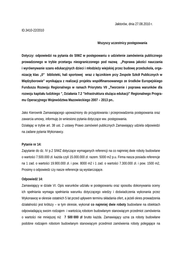 Jaktorów, dnia 27.08.2010 r. ID.3410-22/2010 Wszyscy uczestnicy postępowania Dotyczy: odpowiedzi na pytania do SIWZ w postępowaniu o udzielenie zamówienia publicznego prowadzonego w trybie przetargu nieograniczonego pod nazwą „Poprawa jakości nauczania i wyrównywanie szans edukacyjnych dzieci i młodzieży wiejskiej przez budowę przedszkola, organizację klas „0” biblioteki, hali sportowej wraz z łącznikiem przy Zespole Szkół Publicznych w Międzyborowie” wynikająca z realizacji projektu współfinansowanego ze środków Europejskiego Funduszu Rozwoju Regionalnego w ramach Priorytetu VII „Tworzenie i poprawa warunków dla rozwoju kapitału ludzkiego ”, Działania 7.2 ”Infrastruktura służąca edukacji” Regionalnego Programu Operacyjnego Województwa Mazowieckiego 2007 – 2013 pn.. Jako Kierownik Zamawiającego upoważniony do przygotowania i przeprowadzenia postępowania oraz zawarcia umowy, informuję że wniesiono pytania dotyczące ww. postępowania. Działając w trybie art. 38 ust. 2 ustawy Prawo zamówień publicznych Zamawiający udziela odpowiedzi na zadane pytania Wykonawcy. Pytanie nr 14: Zapytanie do dz. IV p.2 SIWZ dotyczące wymaganych referencji na co najmniej dwie roboty budowlane o wartości 7.500.000 zł. każda czyli 15.000.000 zł. razem. 5000 m2 p.u. Firma nasza posiada referencje na 1 zad. o wartości 19.900.000 zł. i pow. 8000 m2 i 1 zad. o wartości 7.300.000 zł. i pow. 1500 m2, Prosimy o odpowiedz czy nasze referencje są wystarczające. Odpowiedź 14: Zamawiający w dziale VI. Opis warunków udziału w postępowaniu oraz sposobu dokonywania oceny ich spełniania wymaga spełniania warunku dotyczącego wiedzy i doświadczenia wykonania przez Wykonawcę w okresie ostatnich 5 lat przed upływem terminu składania ofert, a jeżeli okres prowadzenia działalności jest krótszy – w tym okresie, wykonał co najmniej dwie roboty budowlane na obiektach odpowiadającą swoim rodzajem i wartością robotom budowlanym stanowiącym przedmiot zamówienia o wartości nie mniejszej niż 7 500 000 zł brutto każda. Zamawiający uzna za roboty budowlane podobne rodzajem robotom budowlanym stanowiącym przedmiot zamówienia roboty polegające na budowie, przebudowie budynków w zakresie robót ogólnobudowlanych, sanitarnych i elektrycznych o powierzchni użytkowej co najmniej 2500 m 2. W związku z powyższym zapisem Państwa referencje są niewystarczające. Pytanie nr 15: W związku z planowanym odwodnieniem wykopu, prosimy o informację czy istnieje możliwość zrzutu wody z wykopów do istniejącej kanalizacji oraz czy koszty zrzutu wody należy ująć w wycenie jako ryczałt, czy tez będą one rozliczane powykonawczo na podstawie rzeczywistych pomiarów. Odpowiedź 15: Informujemy, że nie posiadamy kanalizacji deszczowej. Natomiast istnieje możliwość zrzutu wody z wykopów do rowów odwadniających. Pytanie nr 16: Po sprawdzeniu rysunków konstrukcyjnych i zestawienia płyt prefabrykowanych stwierdzamy, iż w kosztorysie brak następujących płyt:  600x120 cm – 1 szt.  480x90 cm - 1 szt.  360x120 cm – 1 szt.  360x190 cm – 1 szt. Prosimy o uzupełnienie przedmiarów. Odpowiedź 16: Ilość płyt prefabrykowanych należy zwiększyć tak by była zgodna z projektem konstrukcyjnym (czyli do ilości podanych w przedmiarze należy doliczyć płyty podane w zapytaniu). Pytanie nr 17: Na przekrojach architektonicznych widnieją oznaczenia typów posadzek, jednak na żadnym rysunku nie ma legendy z poszczególnymi warstwami. Prosimy o uzupełnienie dokumentacji w tym zakresie. Odpowiedź 17: Charakterystyka warstw jest zawarta w opisie technicznym projektu. Pytanie nr 18: Czy zakresem przetargu objęte jest oznakowanie ewakuacyjne, opracowanie instrukcji bezpieczeństwa pożarowego i wyposażenie w sprzęt gaśniczy? Odpowiedź 18: Oznakowanie ewakuacyjne, opracowanie instrukcji bezpieczeństwa pożarowego i wyposażenie w sprzęt gaśniczy jest objęte zakresem przetargu i należy je wykonać zgodnie z obowiązującymi przepisami. Pytanie nr 19: Opisy techniczne wskazują na szklenie stolarki szkłem antywłamaniowym P4. Zestawienia stolarki podają min. P2. Którą opcję należy przyjąć za właściwą? Odpowiedź 19: Szklenie wykonać wg zestawienia stolarki - na parterze szklenie zestawem z szybą antywłamaniową P2. Pytanie nr 20: W oparciu o stanowisko KG Państwowej Straży Pożarnej funkcję oddymiania może spełniać system oddymiający stanowiący kompletne rozwiązanie składające się z okna, siłowników, centralki, czujek dymu, przycisków oddymiania i oprzewodowania, na który to system została wydana aprobata techniczna lub pozytywne stanowisko CNBOP. W obecnej sytuacji prawnej nie można wyposażyć tradycyjnego okna PCV w funkcję oddymiania. Okno PCV nie spełnia wymogów przeciwpożarowych – nie posiada stosownych atestów. Do poprawnej wyceny systemu oddymiania projektant powinien podać wymaganą powierzchnię czynną oddymiania, aby ustalić właściwy kąt otwarcia okna w związku z tym dobrać odpowiedni osprzęt. Proszę o doprecyzowanie danych odnośnie okna oddymiającego tak, aby nie należałoby go przeprojektowywać na etapie wykonawstwa. Odpowiedź 20: Od 1 września 2006 r. wszystkie urządzenia służące do naturalnej wentylacji pożarowej muszą posiadać certyfikat zgodności z normą PN-EN 12101-2. Dotyczy to również okien oddymiających. Każde takie urządzeniu musi być oznakowane etykietą zgodną z wymaganiami normy. Norma (Systemy kontroli rozprzestrzeniania się dymu i ciepła, cz.2: Wymagania techniczne dotyczące klap dymowych), precyzuje wymagania dotyczące tradycyjnych klap dymowych montowanych na dachu oraz klap dymowych montowanych w ścianie, zwanych potocznie oknami oddymiającymi. Obecnie istnieją już rozwiązania systemowe, certyfikowane zgodnie z normą jw. jako urządzenie oddymiające, które można zastosować w fasadach i dachach szklanych bez uszczerbku dla ich e