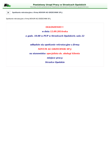 Powiatowy Urząd Pracy w Strzelcach Opolskich http://pup-strzelce.pl/wydarzenie/75/spotkanie-rekrutacyjne-z-firma-novum-ag-grzechnik-sp-j- Spotkanie rekrutacyjne z firmą NOVUM AG GRZECHNIK SP.J. Spotkanie rekrutacyjne z firmą NOVUM AG GRZECHNIK SP.J. OGŁOSZENIE!!! w dniu 12.09.2014roku o godz. 10.00 w PUP w Strzelcach Opolskich; sala 22 odbędzie się spotkanie rekrutacyjne z firmą: NOVUM AG GRZECHNIK SP.J. na stanowisko: specjalista ds. obsługi klienta miejsce pracy: Strzelce Opolskie