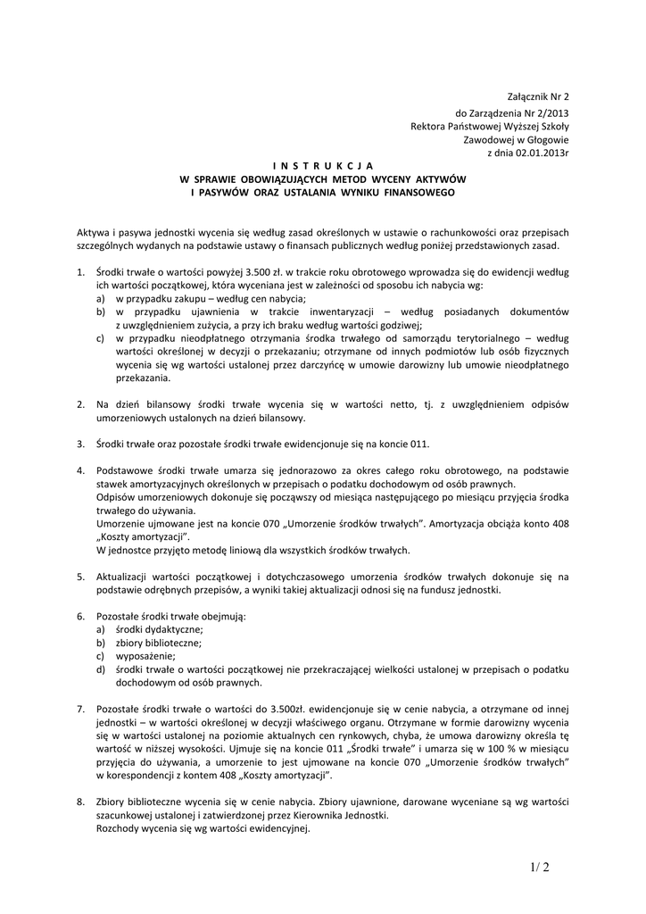 Załącznik Nr 2 do Zarządzenia Nr 2/2013 Rektora Państwowej Wyższej Szkoły Zawodowej w Głogowie z dnia 02.01.2013r I N S T R U K C J A W SPRAWIE OBOWIĄZUJĄCYCH METOD WYCENY AKTYWÓW I PASYWÓW ORAZ USTALANIA WYNIKU FINANSOWEGO Aktywa i pasywa jednostki wycenia się według zasad określonych w ustawie o rachunkowości oraz przepisach szczególnych wydanych na podstawie ustawy o finansach publicznych według poniżej przedstawionych zasad. 1. Środki trwałe o wartości powyżej 3.500 zł. w trakcie roku obrotowego wprowadza się do ewidencji według ich wartości początkowej, która wyceniana jest w zależności od sposobu ich nabycia wg: a) w przypadku zakupu – według cen nabycia; b) w przypadku ujawnienia w trakcie inwentaryzacji – według posiadanych dokumentów z uwzględnieniem zużycia, a przy ich braku według wartości godziwej; c) w przypadku nieodpłatnego otrzymania środka trwałego od samorządu terytorialnego – według wartości określonej w decyzji o przekazaniu; otrzymane od innych podmiotów lub osób fizycznych wycenia się wg wartości ustalonej przez darczyńcę w umowie darowizny lub umowie nieodpłatnego przekazania. 2. Na dzień bilansowy środki trwałe wycenia się w wartości netto, tj. z uwzględnieniem odpisów umorzeniowych ustalonych na dzień bilansowy. 3. Środki trwałe oraz pozostałe środki trwałe ewidencjonuje się na koncie 011. 4. Podstawowe środki trwałe umarza się jednorazowo za okres całego roku obrotowego, na podstawie stawek amortyzacyjnych określonych w przepisach o podatku dochodowym od osób prawnych. Odpisów umorzeniowych dokonuje się począwszy od miesiąca następującego po miesiącu przyjęcia środka trwałego do używania. Umorzenie ujmowane jest na koncie 070 „Umorzenie środków trwałych”. Amortyzacja obciąża konto 408 „Koszty amortyzacji”. W jednostce przyjęto metodę liniową dla wszystkich środków trwałych. 5. Aktualizacji wartości początkowej i dotychczasowego umorzenia środków trwałych dokonuje się na podstawie odrębnych przepisów, a wyniki takiej aktualizacji odnosi się na fundusz jednostki. 6. Pozostałe środki trwałe obejmują: a) środki dydaktyczne; b) zbiory biblioteczne; c) wyposażenie; d) środki trwałe o wartości początkowej nie przekraczającej wielkości ustalonej w przepisach o podatku dochodowym od osób prawnych. 7. Pozostałe środki trwałe o wartości do 3.500zł. ewidencjonuje się w cenie nabycia, a otrzymane od innej jednostki – w wartości określonej w decyzji właściwego organu. Otrzymane w formie darowizny wycenia się w wartości ustalonej na poziomie aktualnych cen rynkowych, chyba, że umowa darowizny określa tę wartość w niższej wysokości. Ujmuje się na koncie 011 „Środki trwałe” i umarza się w 100 % w miesiącu przyjęcia do używania, a umorzenie to jest ujmowane na koncie 070 „Umorzenie środków trwałych” w korespondencji z kontem 408 „Koszty amortyzacji”. 8. Zbiory biblioteczne wycenia się w cenie nabycia. Zbiory ujawnione, darowane wyceniane są wg wartości szacunkowej ustalonej i zatwierdzonej przez Kierownika Jednostki. Rozchody wycenia się wg wartości ewidencyjnej. 1/ 2 Zbiory biblioteczne ujmuje się na koncie 011 „Zbiory biblioteczne” i umarza się bez względu na wartość w 100% w miesiącu przyjęcia do używania. Umorzenie ujmowane jest na koncie 070 „Umorzenie środków trwałych” w korespondencji z kontem 408 „Koszty amortyzacji” 9. Wartości niematerialne i prawne zakupione ze środków na wydatki bieżące oraz stanowiące pierwsze wyposażenie nowych obiektów o wartości początkowej niższej od wymienionej w ustawie o podatku dochodowym dla osób prawnych traktuje się jako pozostałe wartości niematerialne i prawne, które umarzane są w 100 % w miesiącu przyjęcia do używania, ewidencjonuje się na koncie 020 „Wartości niematerialne i prawne”, a umorzenie ujmowane jest na koncie 075 „Umorzenie wartości niematerialnych i prawnych”. 10. Wartości niematerialne i prawne o wartości początkowej wyższej od wartości ustalonej w przepisach o podatku dochodowym dla osób prawnych podlegają umarzaniu na podstawie aktualnego planu amortyzacji. Umorzenie jest ujmowane na koncie 075 „Umorzenie wartości niematerialnych i prawnych”. Amortyzacja obciąża konto 408 „Koszty amortyzacji”. 11. Należności długoterminowe to należności, których termin spłaty przypada w okresie dłuższym niż rok od dnia bilansowego. Wyceniane są w kwocie wymagającej zapłaty, a więc łącznie z należnymi odsetkami, pomniejszone o ewentualnie odpisy aktualizujące ich wartość. 12. Należności krótkoterminowe to należności o terminie spłaty krótszym od jednego roku od dnia bilansowego. Wyceniane są w wysokości wymaganej zapłaty łącznie z wymagalnymi odsetkami z zachowaniem zasady ostrożnej wyceny. 13. Odsetki od należności ujmuje się w wysokości odsetek należnych na koniec kwartału. 14. Środki pieniężne w kasie i na rachunkach bankowych wycenia się wg wartości nominalnej. 15. Zobowiązania z tyt. dostaw wycenia się w kwocie wymagającej zapłaty, z odsetkami naliczonymi na podstawie not odsetkowych otrzymanych od kontrahentów. czyli łącznie 16. Fundusze własne oraz pozostałe aktywa i pasywa wycenia się wg wartości nominalnej. 17. W jednostce występują rozliczenia międzyokresowe kosztów czynne i bierne oraz rozliczenia międzyokresowe przychodów natomiast nie występują tytuły do tworzenia rezerw na przyszłe zobowiązania. Ustalenie wyniku finansowego jednostki. Wynik finansowy ustala się w sposób porównawczy. 1. Na wynik finansowy netto składa się wynik na działalności operacyjnej, operacjach finansowych i operacjach nadzwyczajnych: a) wynik na działalności operacyjnej jest to różnica między sumą należnych przychodów i dochodów operacyjnych, a wartością poniesionych od początku roku kosztów operacyjnych; b) wynik na operacj