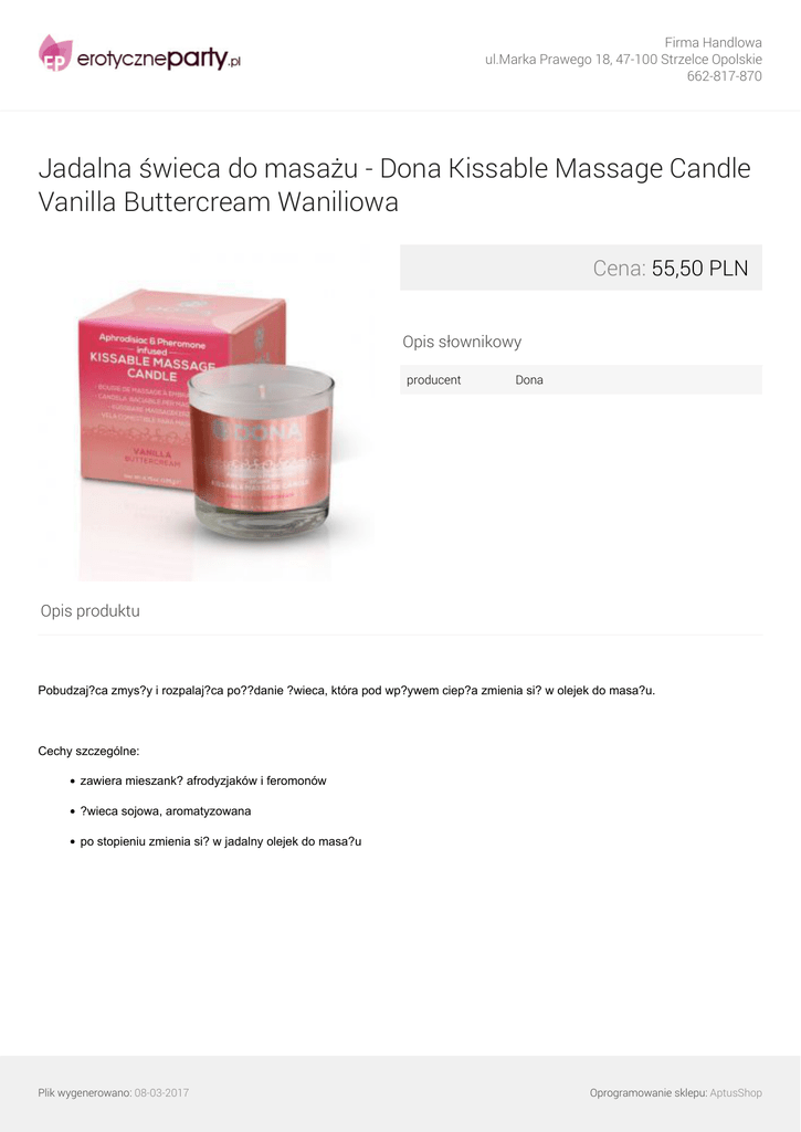 Firma Handlowa ul.Marka Prawego 18, 47-100 Strzelce Opolskie 662-817-870 Jadalna świeca do masażu - Dona Kissable Massage Candle Vanilla Buttercream Waniliowa Cena: 55,50 PLN Opis słownikowy producent Dona Opis produktu Pobudzaj?ca zmys?y i rozpalaj?ca po??danie ?wieca, która pod wp?ywem ciep?a zmienia si? w olejek do masa?u. Cechy szczególne: zawiera mieszank? afrodyzjaków i feromonów ?wieca sojowa, aromatyzowana po stopieniu zmienia si? w jadalny olejek do masa?u Plik wygenerowano: 08-03-2017 Powered by TCPDF (www.tcpdf.org) Oprogramowanie sklepu: AptusShop