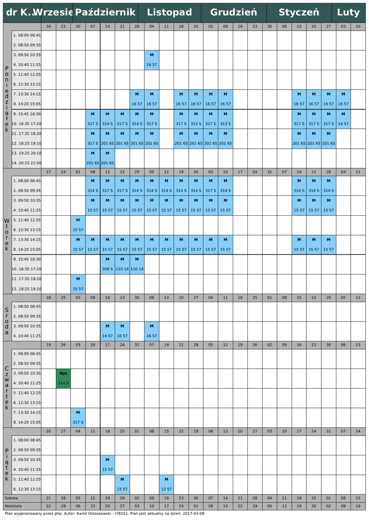 dr K... Wrzesień Październik 16 23 30 07 14 21 28 Listopad 04 11 Grudzień 18 25 02 09 16 23 Styczeń 30 06 Luty 13 20 27 03 10 1. 08:00 08:45 2. 08:50 09:35 P o n i e d z i a ł e k 3. 09:50 10:35 M 4. 10:40 11:25 16 57 5. 11:40 12:25 6. 12:30 13:15 7. 13:30 14:15 M M M M M M M M M M 8. 14:20 15:05 16 57 16 57 16 57 16 57 16 57 16 57 16 57 16 57 16 57 16 57 9. 15:45 16:30 M M M M M M M M M M M M M 10. 16:35 17:20 317 S 314 S 317 S 314 S 317 S 317 S 313 S 317 S 313 S 317 S 317 S 317 S 14 57 11. 17:35 18:20 M M M M M M M M M M M M 12. 18:25 19:10 317 S 201 65 201 65 201 65 201 65 13. 19:25 20:10 M 14. 20:15 21:00 24 01 M 08 15 22 29 05 12 19 26 03 10 1. 08:00 08:45 M M M M M M M M M 2. 08:50 09:35 314 S 317 S 317 S 314 S 314 S 314 S 314 S 314 S 3. 09:50 10:35 M M M M M M M 4. 10:40 11:25 15 57 15 57 15 57 15 57 15 57 15 57 17 24 31 07 14 21 28 M M M M 317 S 314 S 314 S 314 S 314 S M M M M M M 15 57 15 57 15 57 15 57 15 57 15 57 15 57 04 11 5. 11:40 12:25 M 6. 12:30 13:15 15 57 7. 13:30 14:15 M M M M M M M M M M M M M M 8. 14:20 15:05 15 57 15 57 15 57 15 57 15 57 15 57 15 57 15 57 15 57 15 57 15 57 15 57 15 57 15 57 M M M 06 13 20 27 04 11 18 25 01 08 15 22 29 05 12 9. 15:45 16:30 10. 16:35 17:20 308 S 110 14 110 14 11. 17:35 18:20 M 12. 18:25 19:10 15 57 18 Ś r o d a 201 65 201 65 201 65 201 65 201 65 17 W t o r e k 201 65 201 65 201 65 201 65 25 02 09 16 23 M M 30 1. 08:00 08:45 2. 08:50 09:35 3. 09:50 10:35 4. 10:40 11:25 19 26 03 M 14 57 16 57 10 17 24 31 16 57 07 14 21 28 05 12 19 26 02 09 16 23 30 06 13 11 18 25 01 08 15 22 29 06 13 20 27 03 10 17 24 31 07 14 1. 08:00 08:45 C z w a r t e k 2. 08:50 09:35 3. 09:50 10:35 Rps 4. 10:40 11:25 314 S 5. 11:40 12:25 6. 12:30 13:15 7. 13:30 14:15 M 8. 14:20 15:05 317 S 20 27 04 1. 08:00 08:45 P i ą t e k 2. 08:50 09:35 3. 09:50 10:35 M 4. 10:40 11:25 15 57 5. 11:40 12:25 M 6. 12:30 13:15 M 15 57 12 57 Sobota 21 28 05 12 19 26 02 09 16 23 30 07 14 21 28 04 11 18 25 01 08 15 Niedziela 22 29 06 13 20 27 03 10 17 24 01 08 15 22 29 05 12 19 26 02 09 16 Plan wygenerowany przez php. Autor: Kamil Ostaszewski - I7B1S1. Plan jest aktualny na dzień: 2017-03-08