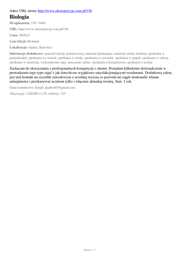 Adres URL strony http://www.ekorepetycje.com.pl/156 Biologia ID ogłoszenia: 156 / 9468 URL: http://www.ekorepetycje.com.pl/156 Cena: 30 PLN Czas lekcji: 60 minut Lokalizacja: śląskie, Katowice Informacje dodatkowe: materiał szkoły podstawowej, materiał gimnazjum, materiał szkoły średniej, spotkania w poniedziałek, spotkania we wtorek, spotkania w środę, spotkania w czwartek, spotkania w piątek, spotkania w sobotę, spotkania w niedzielę, wykształcenie mgr, nauczanie online, spotkania u korepetytora, spotkania u ucznia Zachęcam do skorzystania z profesjonalnych korepetycji z chemii. Posiadam kilkuletnie doświadczenie w prowadzeniu tego typu zajęć z jak dotychczas wyjątkowo satysfakcjonującymi rezultatami. Dodatkową zaletą jest mój kontakt na szczeblu zawodowym z uczelnią wyższą co pozwala mi ciągle doskonalić własne umiejętności i przekazywać uczniom tylko i włącznie aktualną wiedzę. Staż: 1 rok. Dane kontaktowe: Email: [email protected] Aktywacja: 12/02/09 12:39, odsłony: 319 Strona 1 / 1