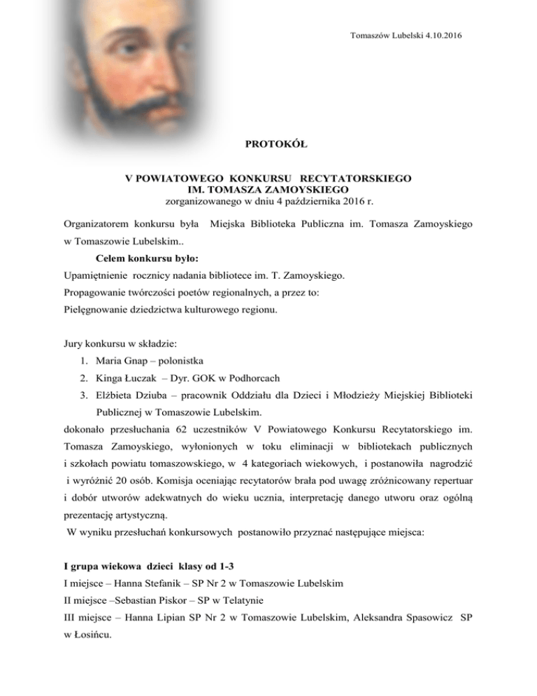 Tomaszów Lubelski 4.10.2016 PROTOKÓŁ V POWIATOWEGO KONKURSU RECYTATORSKIEGO IM. TOMASZA ZAMOYSKIEGO zorganizowanego w dniu 4 października 2016 r. Organizatorem konkursu była Miejska Biblioteka Publiczna im. Tomasza Zamoyskiego w Tomaszowie Lubelskim.. Celem konkursu było: Upamiętnienie rocznicy nadania bibliotece im. T. Zamoyskiego. Propagowanie twórczości poetów regionalnych, a przez to: Pielęgnowanie dziedzictwa kulturowego regionu. Jury konkursu w składzie: 1. Maria Gnap – polonistka 2. Kinga Łuczak – Dyr. GOK w Podhorcach 3. Elżbieta Dziuba – pracownik Oddziału dla Dzieci i Młodzieży Miejskiej Biblioteki Publicznej w Tomaszowie Lubelskim. dokonało przesłuchania 62 uczestników V Powiatowego Konkursu Recytatorskiego im. Tomasza Zamoyskiego, wyłonionych w toku eliminacji w bibliotekach publicznych i szkołach powiatu tomaszowskiego, w 4 kategoriach wiekowych, i postanowiła nagrodzić i wyróżnić 20 osób. Komisja oceniając recytatorów brała pod uwagę zróżnicowany repertuar i dobór utworów adekwatnych do wieku ucznia, interpretację danego utworu oraz ogólną prezentację artystyczną. W wyniku przesłuchań konkursowych postanowiło przyznać następujące miejsca: I grupa wiekowa dzieci klasy od 1-3 I miejsce – Hanna Stefanik – SP Nr 2 w Tomaszowie Lubelskim II miejsce –Sebastian Piskor – SP w Telatynie III miejsce – Hanna Lipian SP Nr 2 w Tomaszowie Lubelskim, Aleksandra Spasowicz SP w Łosińcu. Wyróżnienia 1. Antoni Grząśko – SP w Rachaniach 2. Karolina Malinowska – SP Nr 3 w Tomaszowie Lubelskim 3. Amelia Głowacka – SP Nr 2 w Tomaszowie Lubelskim II grupa wiekowa dzieci klasy od 4 do 6 I miejsce – Aleksandra Kowalik – SP w Majdanie Sopockim II miejsce – Aleksander Matuszek – SP w Krynicach, Jakub Tkaczuk – SP w Przewalu III miejsce – Nikola Rak SP Nr 2 w Tomaszowie Lubelskim, Gabriel Buczak –SP Nr 3 w Tomaszowie Lubelskim Wyróżnienia Julia Moskwa – SP w Machnowie Nowym, Gabriela Bojko – SP w Łuszczaczu III grupa wiekowa młodzież klasa 1-3 gimnazjum I miejsce – Katarzyna Cepil - Tarnawatka II miejsce – Szymon Kuśmierczuk – Bełżec, Ewelina Łasocha Susiec III miejsce – Emilia Obirek – Susiec, Sandra Litwińczuk,- Tarnawatka, Kacper Litwińczuk Tarnawatka. Nagrody książkowe dla laureatów ufundowało Starostwo Powiatowe. Laureatom gratulujemy sukcesu i zachęcamy do dalszego rozwijania talentów. Wszystkim uczestnikom i ich opiekunom i nauczycielom serdecznie dziękujemy za zainteresowanie poezją, wkład pracy oraz kultywowanie tradycji i kultury regionalnej. Przywołując pisarzy i poetów ziemi zamojskiej należącej niegdyś do Ordynacji Zamoyskiej oddaliście hołd jednemu z wielkich z tego rodu, patronowi biblioteki miejskiej Tomaszowi Zamoyskiemu. Życzymy wszystkim kontynuowania przygody z poezją i serdecznie zapraszamy na kolejne edycje konkursu. Podpisy Jury: 1……………… 2……………... 3……………..