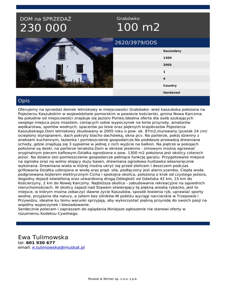 DOM na SPRZEDAŻ 230 000 Grabówko 100 m2 2620/3979/ODS Secondary 1300 2005 1 4 Country Hardened Opis Oferujemy na sprzedaż domek letniskowy w miejscowości Grabówko- wieś kaszubska położona na Pojezierzu Kaszubskim w województwie pomorskim w powiecie kościerski, gmina Nowa Karczma. Na południe od miejscowości znajduje się jezioro Psinko.Idealna oferta dla osób szukających swojego miejsca poza miastem, ceniących sobie wypoczynek na łonie przyrody, amatorów wędkarstwa, sportów wodnych, spacerów po lesie oraz pięknych krajobrazów Pojezierza Kaszubskiego.Dom letniskowy zbudowany w 2005 roku o pow. ok. 87m2,murowany (pustak 24 cm) ocieplony styropianem, dach pokryty blacho dachówką, okna pcv. Na parterze, pokój dzienny z aneksem kuchennym, łazienka i pomieszczenie gospodarcze.Na poddasze prowadzą drewniane schody, gdzie znajdują się 3 sypialnie w jednej z nich wyjście na balkon. Na piętrze w pokojach położone są deski, na parterze terakota.Dom w okresie jesienno - zimowym można ogrzewać oryginalnym piecem kaflowym.Działka ogrodzona o pow. 1300 m2 położona jest okolicy czterech jezior. Na działce stoi pomieszczenie gospodarcze pełniące funkcję garażu. Przygotowane miejsce na ognisko oraz na wolno stojący duży basen, drewniana ogrodowa huśtawka własnoręcznie wykonana. Drewniana wiata w której można ukryć się przed słońcem i deszczem podczas grillowania Działka uzbrojona w wodę oraz prąd- siła, podłączony jest alarm,szambo. Ciepła woda podgrzewana bojlerem elektrycznym Cicha i spokojna okolica, położona o krok od czystego jeziora, dogodny dojazd oświetloną oraz utwardzoną drogą.Odległość od Gdańska 42 km, 15 km do Kościerzyny, 2 km do Nowej Karczmy. Najbliższa okolica - zabudowania rekreacyjne na sąsiednich nieruchomościach. W okolicy zajazd nad Stawem otwierający tę piękną wioskę rybacko, jest to miejsce, w którym można zobaczyć dawne życie Kaszubów, sposób łowienia ryb, uprawiać sporty wodne, przyjazne dla natury, a zatem bez silników.W pobliżu wyciągi narciarskie w Trzepowie i Przywidzu, idealne ku temu warunki sprzyjają, aby wykorzystać piękną przyrodę do swoich pasji na wspólny wypoczynek i biesiadowanie. Serdecznie polecam i zapraszam do oglądania.Niniejsze ogłoszenie nie stanowi oferty w rozumieniu Kodeksu Cywilnego. Ewa Tulimowska tel. 601 930 677 email: [email protected] Muskat & Wicher sp. z o.o. s p.k. Powered by TCPDF (www.tcpdf.org)