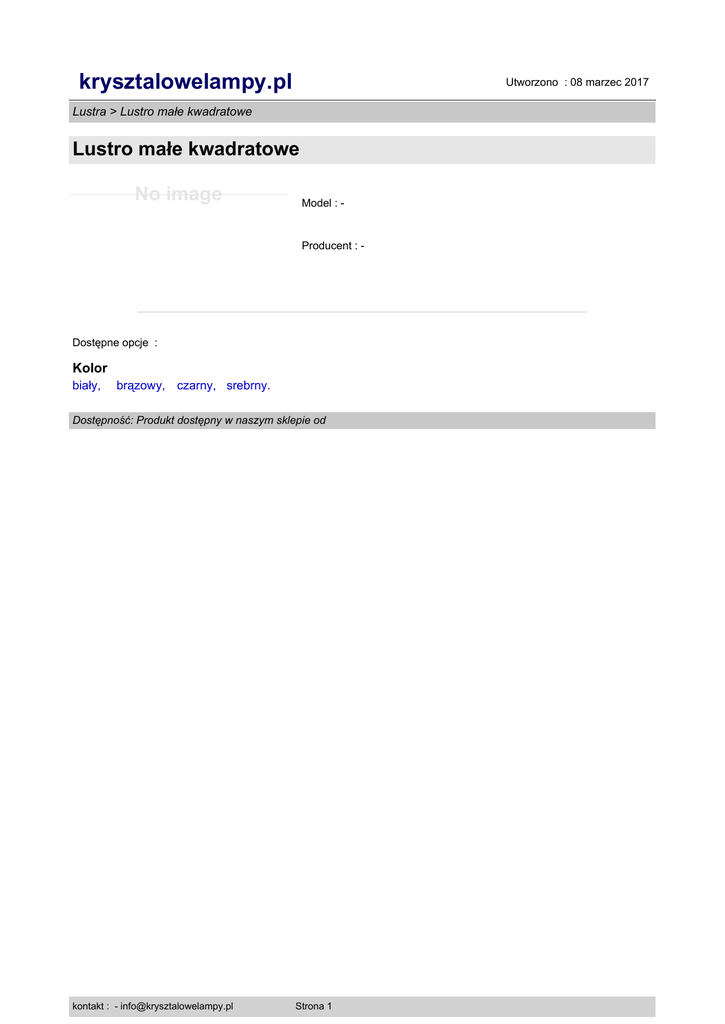 krysztalowelampy.pl Utworzono : 08 marzec 2017 Lustra > Lustro małe kwadratowe Lustro małe kwadratowe No image Model : - Producent : - Dostępne opcje : Kolor biały, brązowy, czarny, srebrny. Dostępność: Produkt dostępny w naszym sklepie od kontakt : - [email protected] Strona 1