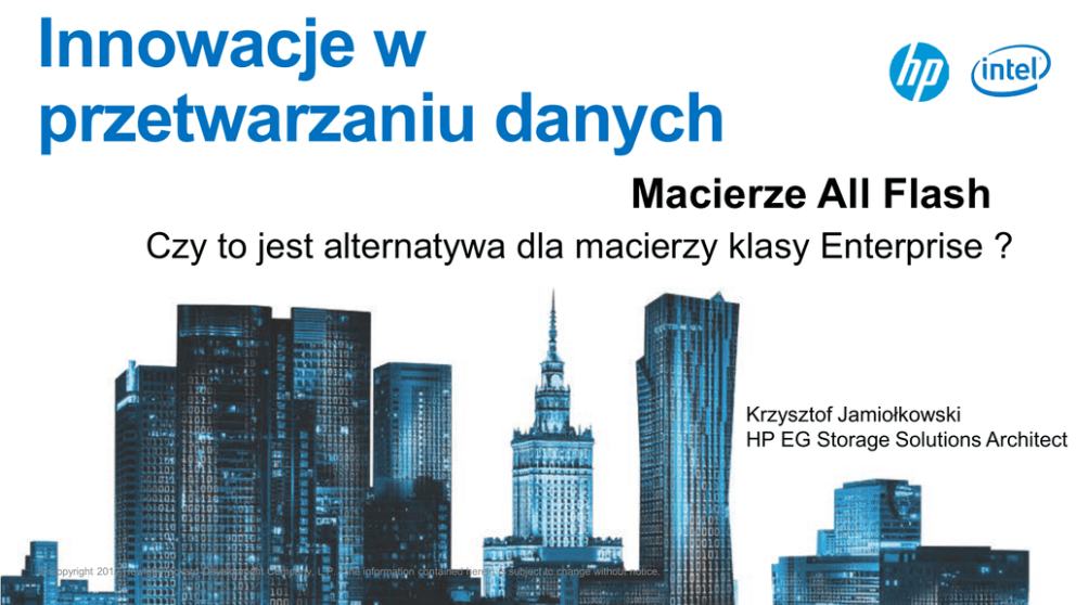 Innowacje w przetwarzaniu danych Macierze All Flash Czy to jest alternatywa dla macierzy klasy Enterprise ? Krzysztof Jamiołkowski HP EG Storage Solutions Architect © Copyright 2012 Hewlett-Packard Development Company, L.P. The information contained herein is subject to change without notice. Definicja macierzy Enterprise Cechy charakterystyczne dla macierzy High End Enterprise Wysoka Wydajność Skalowalność Funkcjonalności Wysoka Dostępność 2 © Copyright 2012 Hewlett-Packard Development Company, L.P. The information contained herein is subject to change without notice. Klasyczne macierze mają jednak swoje ograniczenia Nowe wymagania wykraczają po za możliwości obecnych macierzy Nowoczesne Aplikacje Wysokie koszty Skokowy wzrost wymagań Analityka Biznesowa Szybkie Pzetwarzanie Danych Stara architektura Niska wydajność Skomplikowane zarządzanie Szybka odpowiedź 3 © Copyright 2012 Hewlett-Packard Development Company, L.P. The information contained herein is subject to change without notice. Niezadowolenie klienta Niska efektywność Niedotrzymane SLAs Szukamy rozwiązania … 4 © Copyright 2012 Hewlett-Packard Development Company, L.P. The information contained herein is subject to change without notice. Source: Google Trends, August 2014 Czas odpowiedzi – kluczowy parametr wydajności Flash: 10X Wydajność Klasyczne HDD 8ms opóźnienie ,15ms Time Time Time Time 8ms Operacje I/O Aplikacji opóźnieni e Całkowite opóźnienie seek time + rotational latency Ponad 50 I/Os w tym samym czasie 5 © Copyright 2012 Hewlett-Packard Development Company, L.P. The information contained herein is subject to change without notice. Flash jest wystarczająco szybki Wydajność 1980 6 Pamięć •Większa pojemność •Wyższa przepustowość Procesory 10,000x wzrost wydajności • Częstotliwość • Wiele rdzeni 1990 2000 Rozwiązania SSD • 100 do 10,000 większa wydajność • Lepszy stosunek $/IOP niż dla dysków klasycznych 2014 Klasyczne dyski • 2x większa wydajność • Tańsza powierzchnia ($/GB), ale nie szybsza © Copyright 2012 Hewlett-Packard Development Company, L.P. The information contained herein is subject to change without notice. Klasyczne sposoby wykorzystania warstwy Flash Ewolucja zastosowań pamięci Flash Tiered Array 7 Server-based Flash Cache © Copyright 2012 Hewlett-Packard Development Company, L.P. The information contained herein is subject to change without notice. All-Flash Array All Flash – tylko do niektórych zastosowań Częste opinie na temat macierzy All Flash Flash - to tylko wydajność Flash - tylko do specyficznych przypadków Flash - to małe pojemności 8 © Copyright 2012 Hewlett-Packard Development Company, L.P. The information contained herein is subject to change without notice. Decyzja nie jest łatwa Wiele rozwiązań i wiele kompromisów 9 Wysoka wydajność Startups Wiele Funkcjonalności Dostawcy All Flash Skalowalność HP 3PAR StoreServ Wysoka Dostępność Stabilni Dostawcy © Copyright 2012 Hewlett-Packard Development Company, L.P. The information contained herein is subject to change without notice. HP 3PAR StoreServ – Unikalna Architektura Najważniejsza jest architektura dostarczająca symetrię i bezpieczeństwo Autonomiczne Zarządzanie 3PAR GEN-4 ASIC Wirtualizacja zasobów dyskowych 10 © Copyright 2012 Hewlett-Packard Development Company, L.P. The information contained herein is subject to change without notice. HP 3PAR StoreServ i „data compaction” Zagęszczanie danych jest określeniem, które charakteryzuje redukcję ilości danych, pasma, kosztu i czasu potrzebnego na odczyt, transmisję i przechowywanie danych bez straty jakości informacji poprzez eliminację niepotrzebnych redundancji. Kopie migawkowe Wide Striping i Adaptive Sparing Funkcjonalności Thin i Dedup Algorytmy buforujące Compaction © Copyright 2012 Hewlett-Packard Development Company, L.P. The information contained herein is subject to change without notice. Czas na zmianę sposobu postrzegania All Flash Mniejszy poziom komplikacji i wyższa wydajność Flash Flash SAS NL Skomplikowane zarządzanie Wysokie zużycie energii Niskie IOPS/GB Nieprzewidywalna wydajność 12 © Copyright 2012 Hewlett-Packard Development Company, L.P. The information contained herein is subject to change without notice. Proste Efektywne Wysoka Wydajność Wysoka Przewidywalność Porównanie - Macierz tradycyjna vs. All Flash HP XP 24000 HP 3PAR 7450c Dedup 3:1 Zmiana Pojemność użytkowa (TiB) 60 63 Wydajność 60/40 R/W IOPS 17700 109000 x6 Waga (kg) 1213 27 x44 Pobór Mocy (W) 8387 422 x20 Wymiary (szer, głeb, wys) (cm) 143x93x192 48x63x17 x50 Wydzielane ciepło (BTU/hr) 26334 1451 x18 Konfiguracja HP XP24000: 256 x FC disks 15k, 4 x spares, RAID5 7D+1P, cache 64GB, 8 x FC 4Gb/s, 1 x DKA, random 8 KB, 0% cache hit, rt=10ms Konfiguracja HP 3PAR 7450c 2-nodes: 16 x SSD cMLC 1.92TB, dedup 3:1, RAID5 7:1, cache 96GB, 4 x FC 8Gb/s, random 8 KB, 0% cache hit, rt=2ms 13 © Copyright 2012 Hewlett-Packard Development Company, L.P. The information contained herein is subject to change without notice. Niezależne analizy dot. All Flash “AFA customers expect not only flash performance but also that the array will measure up to enterprise requirements in the areas of availability, reliability, scalability, security, and manageability” The AFA use case determines customer expectations. Dedicated application deployment is quickly becoming a niche use case. Mixed workload consolidation deployment demands that the AFA act as a direct substitute for the enterprise storage workhorse(s) it may be replacing. http://www8.hp.com/h20195/v2/getpdf.aspx/4AA5-8013ENW.pdf?ver=1.0 14 © Copyright 2012 Hewlett-Packard Development Company, L.P. The information contained herein is subject to change without notice. Nowa definicja macierzy Enterprise Cechy charakterystyczne nowoczesnej macierzy All Flash Enterprise Wysoka Wydajność Skalowalność Funkcjonalności Wysoka Do