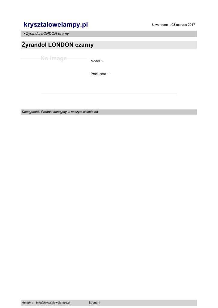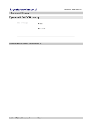 krysztalowelampy.pl Utworzono : 08 marzec 2017 > Żyrandol LONDON czarny Żyrandol LONDON czarny No image Model : - Producent : - Dostępność: Produkt dostępny w naszym sklepie od kontakt : - [email protected] Strona 1