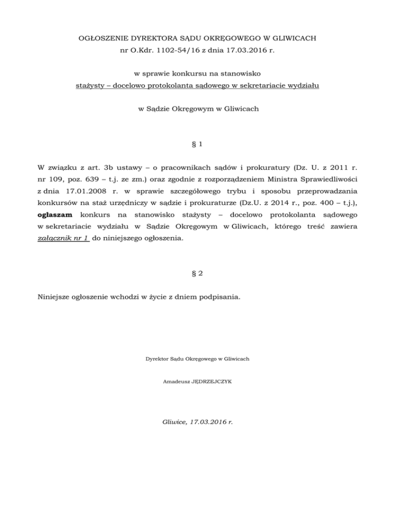 OGŁOSZENIE DYREKTORA SĄDU OKRĘGOWEGO W GLIWICACH nr O.Kdr. 1102-54/16 z dnia 17.03.2016 r. w sprawie konkursu na stanowisko stażysty – docelowo protokolanta sądowego w sekretariacie wydziału w Sądzie Okręgowym w Gliwicach §1 W związku z art. 3b ustawy – o pracownikach sądów i prokuratury (Dz. U. z 2011 r. nr 109, poz. 639 – t.j. ze zm.) oraz zgodnie z rozporządzeniem Ministra Sprawiedliwości z dnia 17.01.2008 r. w sprawie szczegółowego trybu i sposobu przeprowadzania konkursów na staż urzędniczy w sądzie i prokuraturze (Dz.U. z 2014 r., poz. 400 – t.j.), ogłaszam konkurs na stanowisko stażysty – docelowo protokolanta sądowego w sekretariacie wydziału w Sądzie Okręgowym w Gliwicach, którego treść zawiera załącznik nr 1 do niniejszego ogłoszenia. §2 Niniejsze ogłoszenie wchodzi w życie z dniem podpisania. Dyrektor Sądu Okręgowego w Gliwicach Amadeusz JĘDRZEJCZYK Gliwice, 17.03.2016 r. Załącznik nr 1 do OGŁOSZENIA DYREKTORA SĄDU OKRĘGOWEGO W GLIWICACH nr O.Kdr. 1102-54/16 z dnia 17.03.2016 r. w sprawie konkursu na stanowisko stażysty – docelowo protokolanta sądowego w sekretariacie wydziału w Sądzie Okręgowym w Gliwicach Sąd Okręgowy w Gliwicach ogłasza konkurs na 1 stanowisko STAŻYSTY – DOCELOWO PROTOKOLANTA SĄDOWEGO W SEKRETARIACIE WYDZIAŁU wymiar czasu pracy – 1,0 etatu miejsce wykonywania pracy – Gliwice, ul. Kościuszki 15 Wymagania konieczne Stażystą – docelowo protokolantem sądowym może być osoba: 1) 2) 3) 4) 5) która ma pełną zdolność do czynności prawnych, posiadająca wykształcenie co najmniej średnie oraz zdany egzamin maturalny, posiada nieposzlakowaną opinię i wysoką kulturę osobistą, nie była karana za przestępstwo lub przestępstwo skarbowe, przeciwko której nie jest prowadzone postępowanie o przestępstwo ścigane z oskarżenia publicznego lub przestępstwo skarbowe, 6) posiadająca stan zdrowia pozwalający na zatrudnienie na powyższym stanowisku, 7) posiadająca udokumentowane doświadczenie w pracy w sądzie (na stanowisku urzędniczym lub obsługi) albo ukończony staż absolwencki w sądzie, Wymagania dodatkowe 1) znajomość techniki pracy biurowej, w tym umiejętność posługiwania się sprzętem komputerowym, znajomość edytora tekstu, znajomość programu SAWA 2) komunikatywność, kreatywność, dyspozycyjność i odporność na stres, 3) umiejętność sprawnej organizacji pracy własnej i zespołowej. Zakres zadań na w/w stanowisku wykonywanie prac biurowych w sprawach sądowych, t.j. sporządzanie dokumentów i akt sprawy, protokołowanie na rozprawach i posiedzeniach, przepisywanie uzasadnień i postanowień, przyjmowanie i wysyłanie korespondencji, kompleksowa obsługa programu SAWA, wykonywanie innych poleceń kierownika sekretariatu i przewodniczącego wydziału. Pisemne oferty powinny zawierać: 1) list motywacyjny ze wskazaniem sygnatury konkursu i nazwy stanowiska, 2) życiorys (C.V.), 3) kwestionariusz osobowy dla osoby ubiegającej się o zatrudnienie w Sądzie Okręgowym w Gliwicach, 4) kserokopię świadectwa dojrzałości lub dyplomu ukończenia wyższych studiów, 5) świadectwo pracy lub zaświadczenie potwierdzające kwalifikacje opisane w pkt. 7 wymagań koniecznych, 6) oświadczenie, że przeciwko kandydatowi nie jest prowadzone postępowanie o przestępstwo ścigane z oskarżenia publicznego lub przestępstwo skarbowe, 7) oświadczenie o niekaralności za przestępstwo lub przestępstwo skarbowe, 8) oświadczenie o wyrażeniu zgody na przetwarzanie danych osobowych do celów rekrutacji, 9) oświadczenie o korzystaniu z pełni praw cywilnych i obywatelskich, 10) ewentualnie kserokopie dokumentów potwierdzających doświadczenie zawodowe. Oświadczenia winny być podpisane własnoręcznie przez kandydata. Wzory oświadczeń i kwestionariusza dostępne są w Oddziale Kadr oraz na stronie www.gliwice.so.gov.pl Kompletne oferty należy składać w terminie do 25.03.2016 r. w Oddziale Kadr Sądu Okręgowego w Gliwicach w pok.226 lub przesłać za pośrednictwem poczty (decyduje data stempla pocztowego) do siedziby Sądu Okręgowego na adres: Sąd Okręgowy w Gliwicach Oddział Kadr ul. Kościuszki 15 44-100 Gliwice Dodatkowych informacji dotyczących ogłoszonego konkursu na stanowisko stażysty – docelowo protokolanta sądowego w sekretariacie wydziału można uzyskać telefonicznie – tel. (32) 338 00 60 Dyrektor zastrzega sobie prawo do odwołania konkursu bez podania przyczyny. Konkurs zostanie przeprowadzony w oparciu o przepisy rozporządzenia Ministra Sprawiedliwości z dnia 17.01.2008 r. w sprawie szczegółowego trybu i sposobu przeprowadzania konkursów na staż urzędniczy w sądzie i prokuraturze (Dz. U. z 2014 r. poz.400 – t.j.). Przewidywany termin przeprowadzenia I etapu (selekcji wstępnej zgłoszeń kandydatów pod kątem spełnienia wymogów formalnych przystąpienia do konkursu) – nie wcześniej niż 04.04.2016 r. Informacja o terminie II etapu konkursu (praktycznego sprawdzianu umiejętności) zamieszczona zostanie na stronie internetowej Sądu oraz na tablicy ogłoszeń w siedzibie Sądu. Dyrektor Sądu Okręgowego w Gliwicach Amadeusz JĘDRZEJCZYK Gliwice, 17.03.2016 r. Załącznik nr 2 do OGŁOSZENIA DYREKTORA SĄDU OKRĘGOWEGO W GLIWICACH nr O.Kdr. 1102- 54/16 z dnia 17.03.2016r. w sprawie konkursu na stanowisko stażysty – docelowo protokolanta sądowego w sekretariacie wydziału w Sądzie Okręgowym w Gliwicach W związku z ogłoszeniem konkursu na stanowisko stażysty – docelowo protokolanta sądowego w sekretariacie wydziału w Sądzie Okręgowym w Gliwicach powołuję Komisję konkursową w składzie: mgr Piotr KRZYCZMONIK - Kierownik Oddziału Kadr mgr Elżbieta WIDERA - Kierownik Sekretariatu XI Wydziału Wizytacyjnego mgr Helena STOPA - Kierownik Sekretariatu VIII Wydziału Pracy i Ub. Społ. Dyrektor Sądu Okręgowego w Gliwicach Amadeusz JĘDRZEJCZYK Gliwice, 17.03.2016 r.