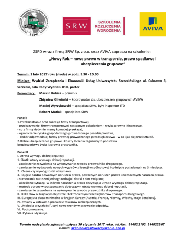 ZSPD wraz z firmą SRW Sp. z o.o. oraz AVIVA zaprasza na szkolenie: „Nowy Rok – nowe prawo w transporcie, prawo spadkowe i ubezpieczenia grupowe” Termin: 1 luty 2017 roku (środa) w godz. 9.30 - 15.00 Miejsce: Wydział Zarządzania i Ekonomiki Usług Uniwersytetu Szczecińskiego ul. Cukrowa 8, Szczecin, sala Rady Wydziału 010, parter Prowadzący: Marcin Kubica – prawnik Zbigniew Gliwiński – koordynator ds. ubezpieczeń grupowych AVIVA Maciej Wyrzykowski – specjalista SRW, były inspektor ITD Robert Matlak – specjalista SRW Panel I 1.Przekształcanie oraz sukcesja firmy transportowej. - przekazywanie firmy transportowej następnym pokoleniom - ryzyka prawne i finansowe, - co z firmą kiedy nie mamy komu jej przekazać, - ograniczanie ryzyka gospodarczego prowadzonego przedsiębiorstwa, - dobór odpowiedniej formy prawnej prowadzonego przedsiębiorstwa - w co i jak się przekształcić. 2.Dobre ubezpieczenie grupowe i koszty leczenia zagranicą to podstawa bezpieczeństwa życia i zdrowia pracownika. Panel II I. Utrata wymogu dobrej reputacji 1. Skutki utraty wymogu dobrej reputacji. - zawieszenie zezwolenia na wykonywanie zawodu przewoźnika drogowego, - zawieszenie wydawania nowych wypisów z licencji wspólnotowej i cofnięcie posiadanych na 3 miesiące. 2. Ocena czy wymóg został utrzymany. 3. Pojęcie bardzo poważnych naruszeń prawa, poważnych naruszeń prawa i nieznacznych naruszeń prawa. - sumowanie naruszeń jednego rodzaju i skutki z nim związane, - określenie sytuacji, w których naruszenia prawa decydują o utracie wymogu dobrej reputacji, - metody obrony w postępowaniu dotyczącym utraty wymogu dobrej reputacji, - zawieszenie zezwolenia na wykonywanie zawodu przewoźnika drogowego. II. Kilka słów o Krajowym Rejestrze Elektronicznym Przedsiębiorców Transportu Drogowego. III. Europejska płaca minimalna w krajach Europy (Austria, Francja, Niemcy, Włochy, kraje Beneluxu). IV. Zmiany w ustawie o przewozie towarów niebezpiecznych. V. „Melodia przyszłości”, czyli nowe trendy w przewozie odpadów. VI. Podsumowanie. VII. Pytania i dyskusja. Termin nadsyłania zgłoszeń upływa 30 stycznia 2017 roku, tel./fax. 914822103, 914822267 e-mail: [email protected] .............................................. (pieczątka firmowa) ZGŁOSZENIE UDZIAŁU CZŁONKA ZSPD w szkoleniu: NOWY ROK - NOWE PRAWO w TRANSPORCIE Zgłaszamy udział: Imię i nazwisko uczestnika tel. kontaktowy e-mail 1. 2. Szkolenie bezpłatne ................................ ................................................. Podpis osoby upoważnionej Data 1. Podstawą udziału w szkoleniu jest przesłanie niniejszego zgłoszenia. 2. Udział w szkoleniu mogą wziąć jedynie firmy, które nie zalegają z opłatą składek członkowskich. Termin nadsyłania zgłoszeń upływa 30 stycznia 2017r., fax. 914822103, 914822267 e-mail: [email protected]