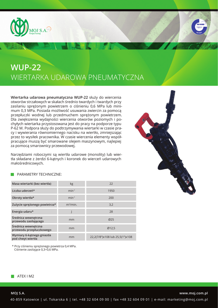 WUP-22 WIERTARKA UDAROWA PNEUMATYCZNA Wiertarka udarowa pneumatyczna WUP-22 służy do wiercenia otworów strzałowych w skałach średnio twardych i twardych przy zasilaniu sprężonym powietrzem o ciśnieniu 0,6 MPa lub minimum 0,3 MPa. Posiada możliwość usuwania zwiercin za pomocą przepłuczki wodnej lub przedmuchem sprężonym powietrzem. Dla zwiększenia wydajności wiercenia otworów poziomych i pochyłych wiertarka przystosowana jest do pracy na podporze typu P-62 M. Podpora służy do podtrzymywania wiertarki w czasie pracy i wywierania równomiernego nacisku na wiertło, zmniejszając przez to wysiłek pracownika. W czasie wiercenia elementy współpracujące muszą być smarowane olejem maszynowym, najlepiej za pomocą smarownicy przewodowej. Narzędziami roboczymi są wiertła udarowe (monolity) lub wiertła składane z żerdzi 6-kątnych i koronek do wierceń udarowych małośrednicowych. PARAMETRY TECHNICZNE: Masa wiertarki (bez wiertła) kg 22 Liczba uderzeń* min-1 1950 Obroty wiertła* min-1 200 m3/min. 3,2 J 28 Średnica wewnętrzna przewodu zasilającego mm Ø25 Średnica wewnętrzna przewodu przepłuczkowego mm Ø12,5 Wymiary 6-kątnego gniazda pod chwyt wiertła mm 22,2(7/8”)x108 lub 25,5(1”)x108 Zużycie sprężonego powietrza* Energia udaru* * Przy ciśnieniu sprężonego powietrza 0,4 MPa. Ciśnienie zasilające 0,3÷0,6 MPa. ATEX I M2 MOJ S.A. www.moj.com.pl 40-859 Katowice | ul. Tokarska 6 | tel. +48 32 604 09 00 | fax +48 32 604 09 01 | e-mail: [email protected]