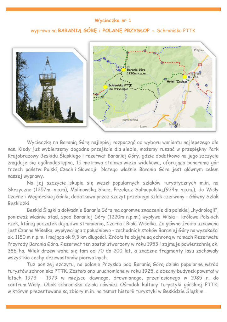 Wycieczka nr 1 wyprawa na BARANIĄ GÓRĘ i POLANĘ PRZYSŁOP - Schronisko PTTK Wycieczkę na Baranią Górę najlepiej rozpocząć od wyboru wariantu najlepszego dla nas. Kiedy już wybierzemy dogodne przejście dla siebie, możemy ruszać w przepiękny Park Krajobrazowy Beskidu Śląskiego i rezerwat Baraniej Góry, gdzie dodatkowo na jego szczycie znajduje się ogólnodostępna, 15 metrowa stalowa wieża widokowa, oferująca panoramę gór trzech państw: Polski, Czech i Słowacji. Dlatego właśnie Barania Góra jest głównym celem naszej wyprawy. Na jej szczycie skupia się węzeł popularnych szlaków turystycznych m.in. na Skrzyczne (1257m. n.p.m), Malinowską Skałę, Przełęcz Salmopolską,(934m n.p.m.), do Wisły Czarne i Węgierskiej Górki, dodatkowo przez szczyt przebiega szlak czerwony - Główny Szlak Beskidzki. Beskid Śląski a dokładnie Barania Góra ma ogromne znaczenie dla polskiej „hydrologii”, ponieważ właśnie stąd, spod Baraniej Góry (1220m n.p.m.) wypływa Wisła – królowa Polskich rzek, której początek dają dwa strumienie, Czarna i Biała Wisełka. Za główne źródło uznawana jest Czarna Wisełka, wypływająca z południowo - zachodnich stoków Baraniej Góry na wysokości ok. 1150 m n.p.m. i mająca ok 9,3 km długości. Źródła te objęte są ochroną w ramach Rezerwatu Przyrody Barania Góra. Rezerwat ten został utworzony w roku 1953 i zajmuje powierzchnię ok. 386 ha. Wiek drzew waha się tam od 70 do 200 lat, a znaczne fragmenty lasu zachowały wszystkie cechy drzewostanów pierwotnych. Tuż poniżej szczytu, na polanie Przysłop pod Baranią Górą działa popularne wśród turystów schronisko PTTK. Zostało ono uruchomione w roku 1925, a obecny budynek powstał w latach 1973 – 1979 w miejsce dawnego, drewnianego, przeniesionego w 1985 r. do centrum Wisły. Obok schroniska działa również Ośrodek kultury turystyki górskiej PTTK, w którym prezentowane są zbiory m.in. na temat historii turystyki w Beskidzie Śląskim. Ciekawostki • Szczyt Baraniej Góry oznaczony był dawniej betonowym słupem, nad którym wznosiła się drewniana wieża triangulacyjna • Barania Góra dość długo nie cieszyła się zainteresowaniem okolicznych mieszkańców i turystów. Pierwszą osobą, o której wiadomo oficjalnie, że zdobyła Baranią Górę był książę pszczyński Ludwik Anhalt-Coethen. Wszedł on na szczyt w lipcu 1810 roku. Jak sam twierdził, w pobliskiej Wiśle było tylko sześciu ludzi, którzy dokonali tego samego przed nim. • Na Baraniej Górze dość licznie występują limby i kosodrzewina. Oba gatunku zostały tu wprowadzone sztucznie • Na obszarze Rezerwatu Barania Góra występują rekordowe w skali kraju opady. Ich wartość wynosi od 1100 do 1700 mm rocznie. • W latach 1926 – 1927 przy schronisku na Przysłopie zbudowano skocznię narciarską, nazywaną „Ślązaczką”. Obiekt istniał do 1977 roku. • Pierwotnie schronisko na Przysłopie mieściło się w zamku myśliwskim Fryderyka Habsburga. W roku 1985 budynek ten został rozebrany i w całości przeniesiony do Wisły www. portalgórski.pl A oto wspomniane warianty, które można dopasować do swoich sił i umiejętności: Wariant 1 Długość całej trasy i czas przejścia: 17,43 km / 5 h Początek trasy : Kamesznica PKS Koniec trasy: Kamesznica Górna Wejście: szlak 3h Zejście: szlak / / (30 min Schronisko PTTK na Przysłopie ) + szlak / (30 min) + szlak( 1 h) Uwagi: Wariant ten przewiduje dojazd własnym środkiem transportu do początku tras. W trasie jest wliczone przejście "przez" schronisko. Wariant 2 Długość całej trasy i czas przejścia: 24,91 km / 7 h 10 min Początek trasy : ul.Trakt Cesarski kierunek Fort "Waligóra" (400 m od hotelu w lewo) Koniec trasy: Hotel "Zacisze" Wejście: szlak 4 h 35 min Zejście: szlak ( 1 h 05 min) + szlak (2 h 20 min) Uwagi: Jeżeli chcemy odwiedzić Schronisko PTTK na Przysłopie należy doliczyć dojście ze szczytu do schroniska + 30 min i ze schroniska do szlaku + 50 min. Życzymy udanej pogody i przyjemnej wędrówki !!! Autor: Tomasz Bambynek