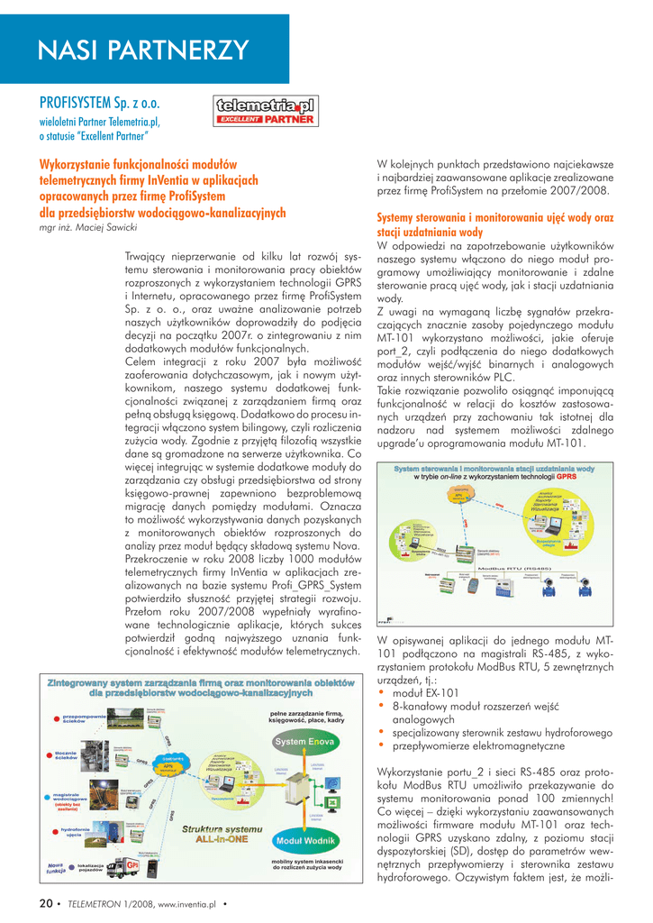NASI PARTNERZY PROFISYSTEM Sp. z o.o. wieloletni Partner Telemetria.pl, o statusie “Excellent Partner” Wykorzystanie funkcjonalności modułów telemetrycznych firmy InVentia w aplikacjach opracowanych przez firmę ProfiSystem dla przedsiębiorstw wodociągowo-kanalizacyjnych mgr inż. Maciej Sawicki Trwający nieprzerwanie od kilku lat rozwój systemu sterowania i monitorowania pracy obiektów rozproszonych z wykorzystaniem technologii GPRS i Internetu, opracowanego przez firmę ProfiSystem Sp. z o. o., oraz uważne analizowanie potrzeb naszych użytkowników doprowadziły do podjęcia decyzji na początku 2007r. o zintegrowaniu z nim dodatkowych modułów funkcjonalnych. Celem integracji z roku 2007 była możliwość zaoferowania dotychczasowym, jak i nowym użyt- kownikom, naszego systemu dodatkowej funkcjonalności związanej z zarządzaniem firmą oraz pełną obsługą księgową. Dodatkowo do procesu integracji włączono system bilingowy, czyli rozliczenia zużycia wody. Zgodnie z przyjętą filozofią wszystkie dane są gromadzone na serwerze użytkownika. Co więcej integrując w systemie dodatkowe moduły do zarządzania czy obsługi przedsiębiorstwa od strony księgowo-prawnej zapewniono bezproblemową migrację danych pomiędzy modułami. Oznacza to możliwość wykorzystywania danych pozyskanych z monitorowanych obiektów rozproszonych do analizy przez moduł będący składową systemu Nova. Przekroczenie w roku 2008 liczby 1000 modułów telemetrycznych firmy InVentia w aplikacjach zrealizowanych na bazie systemu Profi_GPRS_System potwierdziło słuszność przyjętej strategii rozwoju. Przełom roku 2007/2008 wypełniały wyrafinowane technologicznie aplikacje, których sukces potwierdził godną najwyższego uznania funkcjonalność i efektywność modułów telemetrycznych. W kolejnych punktach przedstawiono najciekawsze i najbardziej zaawansowane aplikacje zrealizowane przez firmę ProfiSystem na przełomie 2007/2008. Systemy sterowania i monitorowania ujęć wody oraz stacji uzdatniania wody W odpowiedzi na zapotrzebowanie użytkowników naszego systemu włączono do niego moduł programowy umożliwiający monitorowanie i zdalne sterowanie pracą ujęć wody, jak i stacji uzdatniania wody. Z uwagi na wymaganą liczbę sygnałów przekraczających znacznie zasoby pojedynczego modułu MT-101 wykorzystano możliwości, jakie oferuje port_2, czyli podłączenia do niego dodatkowych modułów wejść/wyjść binarnych i analogowych oraz innych sterowników PLC. Takie rozwiązanie pozwoliło osiągnąć imponującą funkcjonalność w relacji do kosztów zastosowanych urządzeń przy zachowaniu tak istotnej dla nadzoru nad systemem możliwości zdalnego upgrade’u oprogramowania modułu MT-101. W opisywanej aplikacji do jednego modułu MT101 podłączono na magistrali RS-485, z wykorzystaniem protokołu ModBus RTU, 5 zewnętrznych urządzeń, tj.: • moduł EX-101 • 8-kanałowy moduł rozszerzeń wejść analogowych • specjalizowany sterownik zestawu hydroforowego • przepływomierze elektromagnetyczne Wykorzystanie portu_2 i sieci RS-485 oraz protokołu ModBus RTU umożliwiło przekazywanie do systemu monitorowania ponad 100 zmiennych! Co więcej – dzięki wykorzystaniu zaawansowanych możliwości firmware modułu MT-101 oraz technologii GPRS uzyskano zdalny, z poziomu stacji dyspozytorskiej (SD), dostęp do parametrów wewnętrznych przepływomierzy i sterownika zestawu hydroforowego. Oczywistym faktem jest, że możli- 20 • TELEMETRON 1/2008, www.inventia.pl • NASI PARTNERZY wość zdalnego „dostrojenia” elementów wykonaw- czych i pomiarowych na oddalonym obiekcie istotnie redukuje koszty i skraca czas niezbędny na pełne wdrożenie aplikacji. Na uwagę zasługuje również wykorzystanie portu_1 w module MT-101 do lokalnego przekazywania danych do systemu wizualizacji. W kolejnej aplikacji o dużym stopniu zaawansowania, służącej do pełnego sterowanie procesem uzdatniania wody, na bazie modułów MT-101 i MT-202 stworzono sieć monitorowania obiektów rozpro-szonych, tj. ujęć wody oraz zbiorników. Specjalne oprogramowanie zapisane w pamięci modułu MT-202 monitoruje pracę w/w obiektów rozproszonych i przekazuje ich status do klasycznego sterownika PLC. Centralna przepompownia ścieków Konieczność zdalnego oddziaływania na pracę cen- tralnej przepompowni ścieków w ponad stutysięcznym mieście wymusiła w kolejnej aplikacji zastosowanie modułu MT-101 w połączeniu z modułami rozszerzeń wejść/wyjść. Sterowanie całkowicie zautomatyzowanym procesem uzdatniania wody realizowane jest przez „większy” sterownik PLC, który pobiera niezbędne do prawidłowej realizacji dane za pośrednictwem modułu MT-202, który pełni rolę koncentratora danych dla sterownika PLC. W przypadku tej aplikacji do systemu monitorowania przekazywanych jest łącznie ponad 300 zmiennych. Istotne znaczenie mają koszty eksploatacji tego typu systemów. Dzięki zastosowaniu unikalnych i nowatorskich rozwiązań w aplikacjach firmy ProfiSystem miesięczny koszt z tytułu transferu danych w technologii GPRS z jednego obiektu nie przekracza 20,- zł netto. W przypadku omawianej aplikacji możliwość szybkiego wykrycia nieprawidłowej pracy ujęcia wody pozwala ograniczyć prawdopodobieństwo jej skażenia i konieczność zamknięcia stacji uzdatniania. Koszty ponownego „uruchomienia” stacji uzdatnia mogą wynieść nawet kilkadziesiąt tysięcy złotych. Z uwagi na skomplikowany algorytm sterowania przepompownią w tej aplikacji napisano programy zarówno dla modułu MT-101, jak i EX-101. W efekcie stworzono strukturę wykorzystującą 2 niezależne procesory. Efektem był wzrost funkcjonalności całego układu i możliwość zrealizowania założonego algorytmu sterowania pracą obiektu. Stacja wodociągowa W kolejnej aplikacji ponownie zaistniała konieczność podłączenia dodatkowych urządzeń do portu_2 w module MT-101. • www.inventia