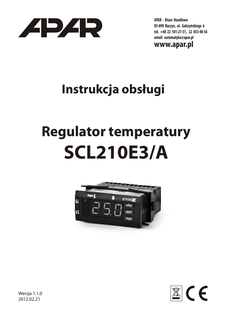 APAR - Biuro Handlowe 05-090 Raszyn, ul. Gałczyńskiego 6 tel. +48 22 101-27-31, 22 853-48-56 email: [email protected] www.apar.pl Instrukcja obsługi Regulator temperatury SCL210E3/A Wersja 1.1.0 2012.02.21 1 . OGÓLNA CHARAKTERYSTYKA REGULATORA SCL210E3/B. Uniwersalny regulator temperatury do kontroli urządzeń grzewczych i chłodniczych. Charakterystyka regulacji: ON-OFF ä programowanie z klawiatury gumowej 3-przyciskowej IP65; ä 1 wejście termometryczne (czujnik temperatury Pt100) ä 1 wejście cyfrowe (Możliwość skokowej zmiany temperatury zadanej). ä 1 próg z wyjściem przekaźnikowym ze stykiem przełącznym (kontrola ON-OFF) ä alarm temperatury (wbudowany brzęczyk) ä wyświetlacz cyfrowy odczyt cyfrowy o rozdzielczości wskazań 0,1°C w zakresie -99,9°C...99,9°C. Po przekroczeniu tego zakresu regulator automatycznie przełącza odczyt temperatury na odczyt w pełnych °C w zakresie 100...999°C; ä ochrona serwisowa Parametry konfiguracyjne sterownika mogą być zabezpieczone hasłem. ä interfejs iFS Wszystkie ustawione parametry konfiguracyjne regulatora mogą być łatwo i szybko kopiowane na następny regulator za pomocą interfejsu iFS, przy użyciu specjalnego klucza. ä obudowa 75 x 33 x 63 mm; ä sygnalizacja błędów; ä produkcja ESSECI. 2. DANE TECHNICZNE Wejścia......................................................Pt100 : -90...+800°C programowalne wejście cyfrowe Zakres wskazań........................................-99,9 ÷ 999°C Wyjścia przekaźnikowe: WY1............................... ........................SPDT 8(3)A/250V~ (dla obciążeń rezyst.) Odczyt cyfrowy LED ............................... 3 cyfry+ znak, czerwony rozdzielczość .........................................1 °C lub 0,1 °C automat. zmiana rozdz. (z 0,1 na 1).......po za zakresem -99,9 ÷ 99,9 °C Zakres temperatur pracy .........................-10 ÷ 50 °C Zakres temperatur przechowywania.......-20 ÷ 70 °C Zakres wilgotności względnej ................30 ÷ 80 % bez skraplania Instalacja...................................................w otworze o wymiarach 71 x 29 mm Zasilanie ...................................................230V ±10% Moc pobierana..........................................3VA Pamięć danych.........................................EEPROM Klasy ochronności...................................czołowa IP65 2 3. FUNKCJE KLAWISZY, SYGNALIZACJA DIOD. 3.1 Funkcje klawiszy przycisk UP (góra). Używamy go do zwiększenia wartości nastawianego parametru lub zmiany parametru na następny. SET przycisk SET. Używamy go do ustawienia temperatury zadanej. przycisk DOWN (dół). Używamy go do zmniejszenia wartości nastawianego parametru lub zmiany parametru na poprzedni. 3.2 Diody sygnalizacyjne Dioda OUT1. Sygnalizuje stan pracy przekaźnika PROGU pierwszego. Dioda świeci - PRÓG1 działa. Dioda nie świeci - PRÓG1 nie działa. Night Dioda trybu nocnego. (Skokowa zmiana wartości temperatury). Dioda świeci - tryb nocny uruchomiony. Dioda alarmu. Sygnalizuje aktywację alarmu. Dioda świeci - alarm włączony. 3.3 Blokada klawiszy Aby zabezpieczyć regulator przed niepożądaną zmianą, należy: 1. Naciśnij jednocześnie i na 5 sekund 2. Ustaw parametr na wartość 1. 3. Aby zakończyć i zachować blokadę klawiatury czekaj 30 sekund nie naciskając klawiszy. Po zabezpieczeniu klawiatury zmiana parametrów regulatora jest możliwa jedynie poprzez hasło. Przy próbie zmiany parametrów regulatora pojawiać się będzie parametr Aby zlikwidować hasło należy: 1. Naciśnij jednocześnie i 2. Naciśnij przycisk SET 3. Ustaw wartość na 95 4. Naciśnij ponownie przycisk SET na 5 sekund 3 4. ZMIANA PARAMETRÓW REGULATORA 1. Naciśnij jednocześnie i na 5 sekund. (Jeżeli pojawi się param. należy zlikwidować hasło zgodnie z pkt. 3.3.) 2. Przyciskami i wyszukaj parametr który chcesz nastawić 3. Aby zobaczyć wartość żądanego parametru wciśnij przycisk SET 4. Przyciskami i nastaw żądaną wartość 5. Przycisk SET - powrót do listy parametrów 6. Aby zakończy i zachować zmiany czekaj 30 sekund nie naciskając klawiszy. 5. NASTAWA TEMPERATURY ZADANEJ (PARAMETR ) 1. Naciśnij przycisk SET i trzymaj do czasu pojawienia się na wyświetlaczu 2. Zwolnij przycisk SET , pojawia się wartość temperatury zadanej (punkt nastawy PROGU) 3. Przy użyciu przycisków i nastaw żądaną wartość temperatury. 4. Aby zakończy i zachować zmiany naciśnij przycisk SET 6. TRYB NOCNY - SKOKOWA ZMIANA TEMPERATURY ZADANEJ.. Za pomocą tej funkcji można skokowo zmieniać wartość zadanej temperatury. Do wejścia cyfrowego należy podłączyć wyłącznik krańcowy. Przy zwarciu obwodu wyłącznika zmieniamy punkty nastawy PROGU1 (wartość temperatury zadanej) na wartość ustawioną w parametrze . 7. TRYB PRACY REGULATORA (KONTROLA ON-OFF) a) Przykład charakterystyki regulacji ON-OFF. TEMPERATURA PRÓG 1 histereza PROGU 1 czas ON OFF ON OFF WY1 - GRZANIE WY1 - CHŁODZENIE Kontrola temperatury przy akcji ON-OFF zależy od poniższcyh parametrów: - wartość temperatury zadanej PROGU1 , - rodzaj charakterystyki (grzanie lub chłodzenie) - wartość histerezy PROGU1 Zastosowanie regulatora jest bardzo uniwersalne. W zależności od doboru powyższych parametrów uzyskujemy indywidualną kontrolę procesu. 4 8. ALARM TEMPERATURY. Regulator ma programowany górny i dolny alarm temperatury. Wartość górnego i dolnego progu alarmu jest niezależna i programowana w całym zakresie pomiarowym. Po przekroczeniu górnego bądź dolnego alarmu temperatury uruchamia się sygnał dźwiękowy oraz alarm na wyświetlaczu. a) Przykład charakterystyki załączenia alarmu temperatury. histereza ALARMU ALARM GÓRNY TEMPERATURA ALARM DOLNY histereza ALARMU czas ON OFF ON OFF ALARM GÓRNY ALARM DOLNY 9. LISTA PARAMETRÓW REGULATORA Kod parametru / Zakres Jednostka Ustawienie fabryczne -12...12 °C 0.0 0...14 - 3 0,1...800 °C 1.0 0 lub 1 - 1 Tryb nocny. Skokowa zmiana