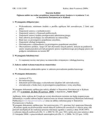 OR. 1118-13/09 Kalisz, dnia 9 czerwca 2009r. Starosta Kaliski Ogłasza nabór na wolne urzędnicze stanowisko pracy kasjera w wymiarze ½ et. w Starostwie Powiatowym w Kaliszu 1. Wymagania obligatoryjne: • • • • • • • • • Wykształcenie: minimum średnie o profilu ogólnym lub zawodowym, 2 letni staŜ pracy Znajomość ustawy o rachunkowości. Znajomość ustawy o finansach publicznych. Znajomość ustawy kodeks postępowania administracyjnego. Stan zdrowia pozwalający na zatrudnienie na stanowisku, Brak kary za przestępstwa popełnione umyślnie, Znajomość obsługi komputera, Oświadczenie o niekaralności za przestępstwa popełnione umyślnie Obywatelstwo polskie, kraju UE lub obywatele innych państw, którym na podstawie umów międzynarodowych lub przepisów prawa wspólnotowego przysługuje prawo do podjęcia zatrudnienia na terenie RP 2. Wymagania fakultatywne: • Co najmniej roczny staŜ pracy na stanowisku związanym z obsługą kasową, 3. Zakres zadań wykonywanych na stanowisku: 1. Prowadzenie całokształtu spraw w zakresie prowadzenia punktu kasowego 4. Wymagane dokumenty: • • • • Ŝyciorys (CV), list motywacyjny, dokument poświadczający wykształcenie (dyplom lub zaświadczenie), oświadczenie o braku kary za przestępstwa popełnione z winy umyślnej, Wymagane dokumenty aplikacyjne naleŜy składać w Starostwie Powiatowym w Kaliszu pok. 231 w terminie do dnia 18 czerwca 2009r z dopiskiem „Nabór Kasa” Aplikacje, które wpłyną do Urzędu po wyŜej określonym terminie nie będą rozpatrywane. Informacja o wyniku naboru będzie umieszczona na stronie internetowej Biuletynu Informacji Publicznej (www.bip.powiat.kalisz.pl )oraz na tablicy informacyjnej w Starostwie Powiatowym w Kaliszu. Wymagane dokumenty aplikacyjne: list motywacyjny, CV, powinny być opatrzone klauzulą „WyraŜam zgodę na przetwarzanie moich danych osobowych zawartych w ofercie pracy dla potrzeb niezbędnych do realizacji procesu rekrutacji zgodnie z ustawą z dnia 29.08.1997r. o ochronie danych osobowych (Dz. U. z 2002 Nr 101, poz. 926 z późn.zm) oraz ustawą z dnia 21 listopada 2008r. o pracownikach samorządowych (Dz. U. z 2008r. Nr 223 poz. 1458)