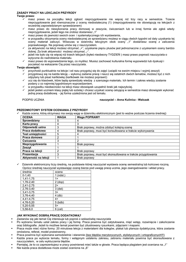 ZASADY PRACY NA LEKCJACH PRZYRODY Twoje prawa: masz prawo na początku lekcji zgłosić nieprzygotowanie nie więcej niż trzy razy w semestrze. Trzecie nieprzygotowanie jest równoznaczne z oceną niedostateczną (1) (nieprzygotowania nie obowiązują na lekcjach z wcześniej zapowiedzianym sprawdzianem) masz prawo do niewykonania pracy domowej w zeszycie, ćwiczeniach lub w innej formie ale zgłoś wtedy nieprzygotowanie, jeżeli tego nie zrobisz dostaniesz „1” masz prawo do jawności swoich ocen i systematycznego ich wystawiania, w przypadku otrzymania oceny niedostatecznej ze sprawdzianu możesz w ciągu dwóch tygodni od daty uzyskania tej oceny materiał zaliczyć. Wówczas w dzienniku lekcyjnym obok oceny „1” dostaniesz ocenę z zaliczenia poprawkowego. Na poprawę umów się z nauczycielem. za aktywność na lekcji możesz otrzymać „+”, uzyskanie pięciu plusów jest jednoznaczne z uzyskaniem oceny bardzo dobrej. Za brak aktywności możesz otrzymać „-‘’. jeżeli nie było cię na więcej niż trzech lekcjach (byłeś nieobecny TYDZIEŃ ) masz prawo poprosić nauczyciela o wytyczne do nadrobienia materiału. masz prawo do wypowiedzenia tego, co myślisz. Musisz zachować kulturalna formę wypowiedzi lub dyskusji i poczekać na wskazanie Cię przez nauczyciela. Twoje obowiązki: przychodź punktualnie na lekcje i od razu przygotuj się do zajęć (usiądź na swoim miejscu i wyjmij zeszyt) przygotowuj się na każda lekcję – wykonuj zadanie pracę i naucz się ostatnich dwóch tematów, możesz być z nich odpytany lub pisać kartkówkę (kartkówek nie możesz poprawić) ucz się do klasówek, które będą sprawdzały wiedzę z szerszego materiału. Ich termin i zakres wiedzy zostanie podany z co najmniej tygodniowym wyprzedzeniem. w przypadku nieobecności na lekcji masz obowiązek uzupełnić braki jak najszybciej. jeżeli jesteś uczniem klasy piątej lub szóstej i chcesz uzyskać ocenę celującą w semestrze masz obowiązek wykonać jedną pracę dodatkową - jej forma uzależniona jest od tematu. PODPIS UCZNIA nauczyciel – Anna Kulinicz - Walczak PRZEDMIOTOWY SYSTEM OCENIANIA Z PRZYRODY Każda ocena, którą otrzymasz ma swoją wagę w dzienniku elektronicznym (jest to ważne podczas liczenia średniej) OCENA WAGA Waga POPRAWY Sprawdziany 5 4 Karta pracy 4 3 Odpowiedź ustna 3 Brak poprawy, można zdobyć kolejną ocenę Praca dodatkowa 4 Brak poprawy, musi być konsultowana w trakcie wykonywania Test umiejętności 5 4 Praca domowa 2 1 Ćwiczenia 3 2 Nieprzygotowania 1 Brak poprawy Zeszyt 1 1 Praca na lekcji 2 Brak poprawy Prezentacja 3 Brak poprawy, musi być skonsultowana w trakcie przygotowania Aktywność na lekcji 1 Brak poprawy Dziennik elektroniczny liczy średnią, na podstawie której nauczyciel wystawia ocenę semestralną lub końcowo roczną. Oprócz średniej nauczyciel wystawiając ocenę bierze pod uwagę pracę ucznia, jego zaangażowanie i wkład pracy. średnia ocena 0-1,40 1 (ndst.) 1,41-1,75 1+ 1,76-2,40 2 (dop) 2,41-2,75 2+ 2,76-3,40 3 (dst) 3,41-3,75 3+ 3,76-4,40 4 (db) 4,41-4,75 4+ 4,76-5,20 5 (bdb) 5,20-5,55 5+ 5,56-6,0 6 (cel) JAK WYKONAĆ DOBRĄ PRACĘ DODATKOWĄ? Zastanów się jaki temat Cię interesuje lub poproś o wskazówkę nauczyciela Po wybraniu tematu ustal zakres pracy i jej formę. Praca powinna być zatytułowana, mięć wstęp, rozwinięcie i zakończenie oraz bibliografie. Jeżeli to możliwe temat powinien być zilustrowany rysunkami, zdjęciami i mapami. Praca może mieć różne formy: 20 minutowa lekcja z materiałami dla kolegów, plakat lub plansza dydaktyczna, która zostanie omówiona, referat, model przestrzenny. Praca powinna być wykonana samodzielnie i starannie (bez błędów merytorycznych, stylistycznych i ortograficznych!!!) Każda praca po wyborze tematu, formy i wstępnym ustaleniu zakresu, zebraniu materiału powinna być skonsultowana z nauczycielem, w celu wykluczenia błędów. Pamiętaj, że to co zaprezentujesz w pracy powinieneś mieć także w głowie. Praca będąca plagiatem jest oceniana na „1” Nie każda praca dodatkowa może zostać oceniona na „6”