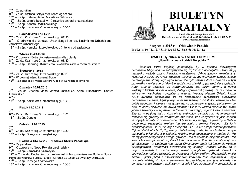 730 – Za parafian 900 – Za śp. Stefana Sołtys w 35 rocznicę śmierci 1030 – Za śp. Helenę, Jana i Mirosława Sakowicz 1200 – Za śp. Józefę Buczak w 19 rocznicę śmierci oraz rodziców 1300 – Za śp. Adama Radzikowskiego 1830 – Za śp. Kazimierę Chrzanowską gr. 06/30 Poniedziałek 07.01.2013 700 – Za śp. Kazimierę Chrzanowską gr. 07/30 830 – O zdrowie dla Janusza Urbańskiego i za śp. Kazimierza Urbańskiego i Jarosława Urbańskiego 1830 – Za śp. Henryka Szpręglewskiego (intencja od sąsiadów) Wtorek 08.01.2013 700 – O zdrowie i Boże błogosławieństwo dla Jolanty 830 – Za śp. Kazimierę Chrzanowską gr. 08/30 1830 – Za śp. Gertrudę i Kazimierza Lewandowskich w rocznicę śmierci Środa 09.01.2013 700 – Za śp. Kazimierę Chrzanowską gr. 09/30 830 – W pewnej intencji znanej Bogu 1830 – Za zmarłego męża Wiktora Goss w 12 rocznicę śmierci Czwartek 10.01.2013 700 – Za śp. Joannę, Jana, Józefa Jasińskich, Annę, Euzebiusza, Danutę Pławińskich 830 – 1830 – Za śp. Kazimierę Chrzanowską gr. 10/30 Piątek 11.01.2013 700 – 830 – Za śp. Kazimierę Chrzanowską gr. 11/30 1830 – Za śp. Danutę Sobota 12.01.2013 700 – 830 – Za śp. Kazimierę Chrzanowską gr. 12/30 1830 – Za śp. Grzegorza Jarzębskiego Niedziela 13.01.2013 – Niedziela Chrztu Pańskiego 730 – Za parafian 900 – O zdrowie na Nowy Rok dla całej rodziny 1030 – Za śp. Bernarda Rybarczyka 1200 – O światło Ducha św., potrzebne łaski i błogosławieństwo Boże w Nowym Roku dla wnuków Bartka, Natalii i Oli oraz za dzieci ze świetlicy Okruszek 1300 – Za śp. Jerzego Adamowicza 1830 – Za śp. Kazimierę Chrzanowską gr. 13/30 BIULETYN PARAFIALNY Parafia Niepokalanego Serca NMP Księża Marianie, ul. Mickiewicza 43, 86-300 Grudziądz, tel. 462 54 56 www.grudziadz.marianie.pl 6 stycznia 2013 r. – Objawienie Pańskie Iz 60,1-6; Ps 72,1-2.7-8.10-13; Ef 3,2-3a.5-6; Mt 2,1-12 UWIELBIĄ PANA WSZYSTKIE LUDY ZIEMI! „Upadli na twarz i oddali Mu pokłon” Badacze coraz częściej podkreślają, by w opisach dotyczących narodzenia Chrystusa nie zatrzymywać się zbytnio nad szczegółami, które mają nierzadko wartość czysto literacką: warsztatową, dekoracyjno-ornamentacyjną. Również w opisie przybycia Mędrców musimy przede wszystkim zwrócić uwagę na teologiczną stronę tego wydarzenia. Nie było celem autora mówienie - w tym przypadku - wyłącznie o jakimś przedziwnym zjawisku, jak wędrująca gwiazda. Autor pragnął wykazać, że Nowonarodzony jest takim samym, a nawet większym królem niż inni królowie, dlatego wprowadził gwiazdę. Ta zaś miała na antycznym Wschodzie specjalne znaczenie. Według wierzeń Orientu każda nowa gwiazda pojawiająca się na firmamencie zwiastowała niechybnie narodzenie się króla, bądź jakiejś innej znamienitej osobistości. Astrologia - tak bujnie naonczas kwitnąca - utrzymywała, co przetrwało w języku potocznym do dziś, że każdy człowiek „ma swoją gwiazdę”. Ciekawy wywód znajdujemy - pisze jeden z badaczy - w tej materii u Pliniusza Starszego, w jego Historia naturalis. Zna on te poglądy ludu i stara się je podważyć, uważając za niedorzeczność rodzenie się gwiazdy ze zrodzeniem człowieka. W Ewangeliach w jakiś sposób te poglądy zostały odzwierciedlone. Gdy zwrócimy uwagę, że gwiazdy w Biblii w ogóle mają szczególne miejsce (dawały znaki o śmierci Faraona - Ez 32,7; oznaczały króla - Iz 14,12; bądź Mesjasza - Lb 24,17; przepowiadały poniżenie Egiptu i Babilonii - Iz 13,10), wtedy uświadomimy sobie, że nie chodzi w naszym przypadku o historię, a o teologię, religijna myśl opowiadania o mędrcach. Nie mamy potrzeby wyjaśniać owego zjawiska - jak to czyniono niejednokrotnie - tak zwaną koniunkcją planet: Jupitera i Saturna w znaku Ryb, która miała miejsce jak obliczono - w siódmym roku przed Chrystusem, bądź też innym zjawiskiem astrologicznym, mianowicie pojawieniem się komety. Obecnie wiemy, że w całym opowiadaniu zastosowany został specyficzny gatunek literacki opowiadanie mające wykazać, że Jezus jest wielkim Królem. „Przewodnią myślą autora - pisze jeden z najwybitniejszych znawców tego zagadnienia - było ukazanie wielkiej różnicy w uznawaniu Jezusa Mesjaszem, jaka ujawniła się pomiędzy przywództwem politycznym Izraela i jego poddanymi w Jerozolimie, a tymi, którzy przybyli do Niego ze Wschodu”. „Oni czekają na Nadzieję” W uroczystość Objawienia Pańskiego, zwaną popularnie świętem Trzech Króli, w kościołach całej Polski zbierana jest składka na rzecz misji. Środki przeznaczane są na wspieranie działalności polskich misjonarzy oraz na utrzymanie Centrum Formacji Misyjnej, gdzie odbywa się przygotowanie do pracy misyjnej. Tegoroczna zbiórka przebiega pod hasłem „Oni czekają na Nadzieję”. Te słowa towarzyszą też rozpoczętej w Nowy Rok akcji „Misyjny SMS”. Przypadająca 6 stycznia uroczystość Objawienia Pańskiego to dzień związany z misjami i głoszeniem Ewangelii całemu światu. Jest to dzień misji, ponieważ upamiętnia pierwsze zetknięcie się pogan z Chrystusem. Jego wyrazem jest pokłon złożony Zbawicielowi przez Trzech Mędrców ze Wschodu. Ofiary zbierane wówczas na tacę w polskich parafiach będą przeznaczone na tzw. fundusz misyjny, służący polskim misjonarzom. Dzięki niemu funkcjonuje też Centrum Formacji Misyjnej. Święto Trzech Króli to również okazja do tego, aby informować o działalności polskich misjonarzy i w sposób szczególny pamiętać o nich w modlitwie. Obecnie na misjach w 94 krajach świata pracuje 2117 polskich misjonarzy. W tej liczbie jest 304 księży diecezjalnych (tzw. fideidonistów), 1144 księży i braci zakonnych, 635 sióstr zakonnych oraz 34 osoby świeckie. Komisja Episkopatu Polski ds. Misji wspiera pracę ewangelizacyjną misjonarzy i pomaga im w budowie i utrzymaniu kościołów, ale także w prowadz