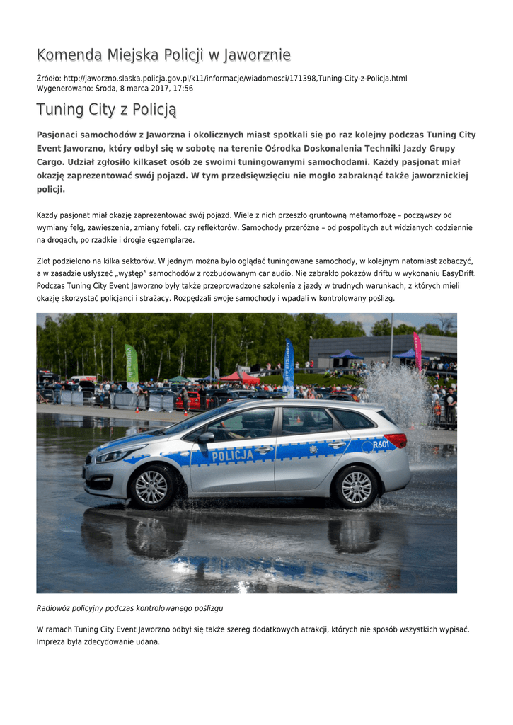 Komenda Miejska Policji w Jaworznie Źródło: http://jaworzno.slaska.policja.gov.pl/k11/informacje/wiadomosci/171398,Tuning-City-z-Policja.html Wygenerowano: Środa, 8 marca 2017, 17:56 Tuning City z Policją Pasjonaci samochodów z Jaworzna i okolicznych miast spotkali się po raz kolejny podczas Tuning City Event Jaworzno, który odbył się w sobotę na terenie Ośrodka Doskonalenia Techniki Jazdy Grupy Cargo. Udział zgłosiło kilkaset osób ze swoimi tuningowanymi samochodami. Każdy pasjonat miał okazję zaprezentować swój pojazd. W tym przedsięwzięciu nie mogło zabraknąć także jaworznickiej policji. Każdy pasjonat miał okazję zaprezentować swój pojazd. Wiele z nich przeszło gruntowną metamorfozę – począwszy od wymiany felg, zawieszenia, zmiany foteli, czy reflektorów. Samochody przeróżne – od pospolitych aut widzianych codziennie na drogach, po rzadkie i drogie egzemplarze. Zlot podzielono na kilka sektorów. W jednym można było oglądać tuningowane samochody, w kolejnym natomiast zobaczyć, a w zasadzie usłyszeć „występ” samochodów z rozbudowanym car audio. Nie zabrakło pokazów driftu w wykonaniu EasyDrift. Podczas Tuning City Event Jaworzno były także przeprowadzone szkolenia z jazdy w trudnych warunkach, z których mieli okazję skorzystać policjanci i strażacy. Rozpędzali swoje samochody i wpadali w kontrolowany poślizg. Radiowóz policyjny podczas kontrolowanego poślizgu W ramach Tuning City Event Jaworzno odbył się także szereg dodatkowych atrakcji, których nie sposób wszystkich wypisać. Impreza była zdecydowanie udana. Źródło: www.jaw.pl ZAŁĄCZNIKI DO STRONY Relacja telewizji "DlaCiebie.pl" Ocena: 0/5 (0) Tweetnij