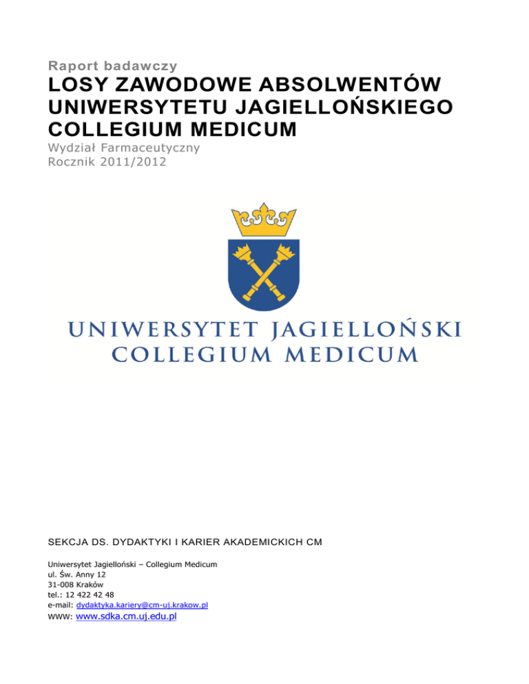 Raport badawczy LOSY ZAWODOWE ABSOLWENTÓW UNIWERSYTETU JAGIELLOŃSKIEGO COLLEGIUM MEDICUM Wydział Farmaceutyczny Rocznik 2011/2012 SEKCJA DS. DYDAKTYKI I KARIER AKADEMICKICH CM Uniwersytet Jagielloński – Collegium Medicum ul. Św. Anny 12 31-008 Kraków tel.: 12 422 42 48 e-mail: [email protected] WWW: www.sdka.cm.uj.edu.pl Losy zawodowe absolwentów Uniwersytetu Jagiellońskiego – Collegium Medicum. Wydział Farmaceutyczny. Rocznik 2011/2012 STRESZCZENIE WYBRANYCH WYNIKÓW 1. Okres realizacji projektu: kwiecień i maj 2013 r. 2. Osobami badanymi niniejszej części badania byli absolwenci studiów stacjonarnych i niestacjonarnych, którzy uzyskali absolutorium na kierunku Analityka Medyczna i Kosmetologia Wydziału Farmaceutycznego w roku akademickim 2011/2012. 3. Wśród całkowitej liczby 89 absolwentów badanego rocznika, zebrano łącznie 65 poprawnych deklaracji o udziale w badaniu. Wśród nich, 58 osób wyraziło gotowość na udział w badaniu (w tym 22 i 36 odpowiednio z kierunku Analityka Medyczna i z Kosmetologii), natomiast 7 osób takiej gotowości nie wyraziło. Odnotowano łącznie 24 braki danych, dotyczące osób, które nie wypełniły formularza deklaracji o udziale w badaniu lub też wypełniły go niejednoznacznie lub nieprawidłowo. 4. Ostateczna liczba osób, którym przesłano ankietę wyniosła 58 (odpowiednio 22 i 36 dla kierunku Analityka Medyczna i Kosmetologia). 5. Liczba osób, które wypełniły ankietę wyniosła łącznie 22, w tym 8 z absolwentów kierunku Analityka Medyczna oraz 14 z Kosmetologii. Zwrotność wynosiła odpowiednio 36% i 39% w stosunku do wszystkich ankiet przesłanych absolwentom tych kierunków. 6. Powody braku kompletnego operatu do badania pełnego to (1) niewypełnienie przez absolwenta formularza zgody na udział w badaniu; (2) odmowa lub niejednoznaczne określenie swojej decyzji o zgodzie na udział w badaniu. 7. Charakterystyka próby: wśród badanych absolwentów Wydziału Farmaceutycznego zdecydowaną większość stanowiły kobiety. Największy odsetek ankietowanych pochodził ze wsi lub z małych czy dużych miast. Po studiach, większość badanych wskazywała duże miasto jako obecne miejsce zamieszkania. Wszyscy badani ukończyli liceum ogólnokształcące. 8. Badani najczęściej wskazywali zainteresowanie przedmiotem, jako kryterium wyboru studiów. Najmniej osób kierowało się prestiżem zawodu, perspektywą dobrych zarobków i sugestią innych osób. 9. Sytuacja zawodowa: wśród respondentów, większość absolwentów pracuje i nie kontynuuje nauki. Osoby pracujące: większość pracujących wykonuje pracę najemną, którą we wszystkich przypadkach rozpoczęli po studiach. W relacji do ukończonego kierunku studiów, badani z Kosmetologii byli najczęściej zatrudniani w okresie do 1 miesiąca po ukończeniu studiów, natomiast w przypadku Analityki Medycznej był to okres od 5 do 6 miesięcy. 10. Osoby kontynuujące naukę najczęściej robiły to w formie kursów podnoszących kwalifikacje zawodowe (Analityka Medyczna) lub studiów podyplomowych (Kosmetologia). Najważniejszymi motywami kontynuowania nauki była perspektywa znalezienia lepszej pracy i możliwość realizowania zainteresowań. 11. Osoby niepracujące stanowiły niewielki odsetek osób badanych. 4 ankietowanych pozostawało bez pracy, co w ich opinii spowodowane było: brakiem ofert pracy zgodnej z wykształceniem i zainteresowaniami, dyskryminacją ze względu na wiek i płeć, niekorzystnymi warunkami formalno-prawnymi pracy oraz sytuacją rodzinną. 12. Do najlepiej opanowanych kompetencji uzyskanych w czasie studiów badani zaliczali myślenie analityczne i syntetyczne, podstawowe umiejętności obsługi komputera, bierną znajomość obsługi komputera, zdolność do samokształcenia, samodzielność, dobrą organizację czasu, umiejętność pracy w zespole i skuteczne komunikowanie się, a także zdolność do wykorzystania teorii w praktyce. Zawartość Metoda badania ....................................................................................................................... 4 Osoby badane .......................................................................................................................... 5 Wyniki ..................................................................................................................................... 6 Podstawowe dane demograficzne badanych ............................................................................... 6 2 Losy zawodowe absolwentów Uniwersytetu Jagiellońskiego – Collegium Medicum. Wydział Farmaceutyczny. Rocznik 2011/2012 Edukacja ............................................................................................................................... 10 Sytuacja zawodowa ................................................................................................................ 17 Osoby wykonujące pracę najemną ........................................................................................... 19 Osoby prowadzące działalność gospodarczą.............................................................................. 29 Osoby kontynuujące naukę ..................................................................................................... 30 Osoby niepracujące ................................................................................................................ 31 Kontakty z Urzędem Pracy....................................................................................................... 32 Ocena kompetencji uzyskanych na studiach .............................................................................. 32 Priorytetem prowadzenia badań losów zawodowych absolwentów jest analiza oraz spójny w czasie monitoring zatrudnienia i sytuacji zawodowej osób, którzy ukończyli studia na UJ CM. Badanie ma także na celu ocenę przydatności w pracy zawodowej kompetencji nabytych przez nich w trakcie stud