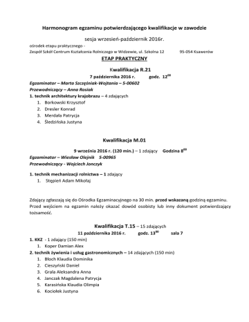 Harmonogram egzaminu potwierdzającego kwalifikacje w zawodzie sesja wrzesień-październik 2016r. ośrodek etapu praktycznego Zespół Szkół Centrum Kształcenia Rolniczego w Widzewie, ul. Szkolna 12 95-054 Ksawerów ETAP PRAKTYCZNY Kwalifikacja R.21 7 października 2016 r. Egzaminator – Marta Szczęśniak-Wojtania – 5-00602 Przewodniczący – Anna Rosiak 1. technik architektury krajobrazu – 4 zdających 1. Borkowski Krzysztof 2. Dresler Konrad 3. Merdała Patrycja 4. Śledzińska Justyna godz. 1200 Kwalifikacja M.01 9 września 2016 r. (120 min.) – 1 zdający Egzaminator – Wiesław Olejnik 5-00965 Przewodniczący - Wojciech Jonczyk Godzina 800 1. technik mechanizacji rolnictwa – 1 zdający 1. Stępień Adam Mikołaj Zdający zgłaszają się do Ośrodka Egzaminacyjnego na 30 min. przed wskazaną godziną egzaminu. Przed wejściem na egzamin należy okazać dowód osobisty lub inny dokument potwierdzający tożsamość. Kwalifikacja T.15 – 15 zdających 11 października 2016 r. godz. 1300 sala 7 1. KKZ - 1 zdający (150 min) 1. Koper Damian Alex 2. technik żywienia i usług gastronomicznych – 14 zdających (150 min) 1. Błoch Klaudia Dominika 2. Cieszyński Daniel 3. Grala Aleksandra Anna 4. Janczak Magdalena Patrycja 5. Karasińska Klaudia Olimpia 6. Kociołek Justyna 7. Kunicka Monika 8. Leżańska Justyna Anna 9. Łudzeń Damian Piotr 10. Okrojek Justyna Patrycja 11. Parteka Krzysztof Jan 12. Pawlak Adrian Jan 13. Pisera Mariusz Józef 14. Wierzbicki Patryk Michał Kwalifikacja R.22 – 5 zdających 11 października 2016 r. 1. KKZ - 1 zdająca (180 min) 1. Figurska Agnieszka Ewa godz. 1300 sala 11 2. technik architektury krajobrazu – 4 zdające (180 min) 1. Gałka Klaudia Angelika 2. Pik Monika Aleksandra 3. Sobolewska Monika Klaudia 4. Staniszewska Róża Konstancja Zdający zgłaszają się do Ośrodka Egzaminacyjnego na 30 min. przed wskazaną godziną egzaminu. Przed wejściem na egzamin należy okazać dowód osobisty lub inny dokument potwierdzający tożsamość.