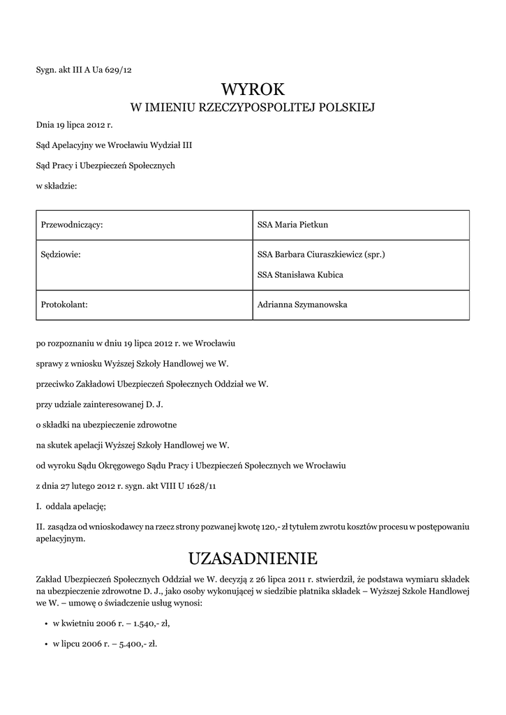 Sygn. akt III A Ua 629/12 WYROK W IMIENIU RZECZYPOSPOLITEJ POLSKIEJ Dnia 19 lipca 2012 r. Sąd Apelacyjny we Wrocławiu Wydział III Sąd Pracy i Ubezpieczeń Społecznych w składzie: Przewodniczący: SSA Maria Pietkun Sędziowie: SSA Barbara Ciuraszkiewicz (spr.) SSA Stanisława Kubica Protokolant: Adrianna Szymanowska po rozpoznaniu w dniu 19 lipca 2012 r. we Wrocławiu sprawy z wniosku Wyższej Szkoły Handlowej we W. przeciwko Zakładowi Ubezpieczeń Społecznych Oddział we W. przy udziale zainteresowanej D. J. o składki na ubezpieczenie zdrowotne na skutek apelacji Wyższej Szkoły Handlowej we W. od wyroku Sądu Okręgowego Sądu Pracy i Ubezpieczeń Społecznych we Wrocławiu z dnia 27 lutego 2012 r. sygn. akt VIII U 1628/11 I. oddala apelację; II. zasądza od wnioskodawcy na rzecz strony pozwanej kwotę 120,- zł tytułem zwrotu kosztów procesu w postępowaniu apelacyjnym. UZASADNIENIE Zakład Ubezpieczeń Społecznych Oddział we W. decyzją z 26 lipca 2011 r. stwierdził, że podstawa wymiaru składek na ubezpieczenie zdrowotne D. J., jako osoby wykonującej w siedzibie płatnika składek – Wyższej Szkole Handlowej we W. – umowę o świadczenie usług wynosi: • w kwietniu 2006 r. – 1.540,- zł, • w lipcu 2006 r. – 5.400,- zł. Wyrokiem z 27 lutego 2012 r. Sąd Okręgowy we Wrocławiu oddalił odwołanie wnioskodawczyni - Wyższej Szkoły Handlowej we W. - od w/w decyzji oraz zasądził od niej na rzecz organu rentowego 60,- zł tytułem zwrotu kosztów zastępstwa procesowego. Rozpoznanie sprawy odbyło się z udziałem zainteresowanej D. J.. Sąd ustalił następujący stan faktyczny: Wyższa Szkoła Handlowa we W. posiada uprawnienia do prowadzenia studiów pierwszego i drugiego stopnia oraz studiów magisterskich na kierunku zarządzanie i marketing. Szkoła liczy około 2000-3000 studentów oraz 100 nauczycieli akademickich, z których 60 zatrudnionych jest na podstawie umów o pracę, a pozostali pracownicy naukowi zatrudnieni są na podstawie umów zlecenia i umów o dzieło. W szkole istnieje harmonogram zajęć, do którego pracownicy muszą się dostosować, wyznaczając godziny zajęć dydaktycznych. Każdy z wykładowców ma przypisany dzień na wykład i określoną godzinę. Jeżeli wnioskodawca zatrudniał do prowadzenia zajęć osobę, która ma kontakt z praktyką, to osoba taka, jako prowadzący miała wnieść wkład własny oraz wiedzę i w tym celu opracować syllabus przedmiotowy, w którym przedstawiała zakres zajęć, treść oraz metody realizacji. W syllabusie prowadzący w sposób ogólny określa przede wszystkim ilość godzin, stosowane metody dydaktyczne, formę i warunki zaliczenia danego przedmiotu, założenia i cele przedmiotu oraz treści programowe przedmiotu. Syllabusy dotyczą wszystkich przedmiotów, w tym również tych, które prowadzą pracownicy etatowi. Umowy o dzieło obejmują wyłącznie przekazanie wiedzy na dany temat, poza określonym syllabusem. Zarówno pracownicy zatrudnieni na podstawie umowy o pracę, jak i pracownicy zatrudnieni na podstawie umów cywilnoprawnych są kontrolowani przez kierownika katedry w zakresie prowadzonych zajęć dydaktycznych. Każdorazowo podpisują listę obecności, celem ustalenia, czy zajęcia rzeczywiście się odbyły. Zainteresowana, będąca z wykształcenia prawniczką współpracowała z uczelnią w latach 2005-2006 w ramach dwóch umów o dzieło, którymi były objęte wszystkie wykłady, które prowadziła na uczelni. Przedmiotem umów o dzieło było opracowanie koncepcji i przeprowadzenie cyklu wykładów dotyczących programu nauczania oraz przeprowadzenie egzaminów. Umowy zawierały zapis o przeniesieniu praw autorskich, po skończeniu dzieła, na zamawiającego – Wyższą Szkołę Handlową. Wynagrodzenie płacone było miesięcznie lub na koniec semestru według stawki godzinowej. Zainteresowana w ramach powierzonych jej czynności przygotowywała tematy poszczególnych wykładów, opracowywała je, przygotowując wykład. Zainteresowana przekazywała wiedzę z danego tematu w sposób ustny na wykładach. Do jej obowiązków należało sporządzenie syllabusa. Zainteresowana w trakcie wykonywania umów o dzieło była zatrudniona na podstawie umowy o pracę na Uniwersytecie (...). Pracowała jako adiunkt w Zakładzie Polityki Gospodarczej. Organ rentowy przeprowadził u wnioskodawczyni kontrolę w 2005 r. i 2011 r. W tak ustalonym stanie faktycznym Sąd Okręgowy uznał, że odwołanie Wyższej Szkoły Handlowej we W. nie zasługuje na uwzględnienie. Sąd wskazał, że istotą sporu było ustalenie, czy zainteresowaną i Wyższą Szkołę Handlową łączyły umowy o dzieło czy też umowy o świadczenie usług uregulowane w art. 750 kc w związku z czym wnioskodawczyni zobowiązana byłaby zgłosić zainteresowaną do obowiązkowych ubezpieczeń społecznych i ubezpieczenia zdrowotnego oraz odprowadzać za nią składki na podstawie przepisów art. 6 ust. 1 pkt 4, art. 12 ust. 1 ustawy o systemie ubezpieczeń społecznych oraz art. 66 ust. 1 pkt 1e ustawy o świadczeniach opieki zdrowotnej finansowanych ze środków publicznych. Sąd dokonał charakterystyki prawnej umowy o dzieło i umowy o świadczenie usług, do której stosuje się przepisy o zleceniu, wskazując na podstawowe elementy obu umów i dzielące je różnice i uznał, że zainteresowaną łączyły z wnioskodawczynią – Wyższą Szkołą Handlową we W. – umowy o świadczenie usług z art. 750 kc. Sąd wskazał, że przedmiotem umowy o dzieło mogą być nie tylko rezultaty materialne, lecz także niematerialne. Zdaniem Sądu I instancji, nie ma żadnej różnicy w sposobie przygotowania i wygłaszania wykładu realizowanego na podstawie umowy o pracę czy umowy zlecenia nazywanej przez strony umową o dzieło. Niezależnie od formy prawnej umowy wykładowca do swej pracy wnosi czynnik twórczy, począwszy od sposobu ujęcia tematu, doboru literatury, metody przeprowadzania wykładu. Cz