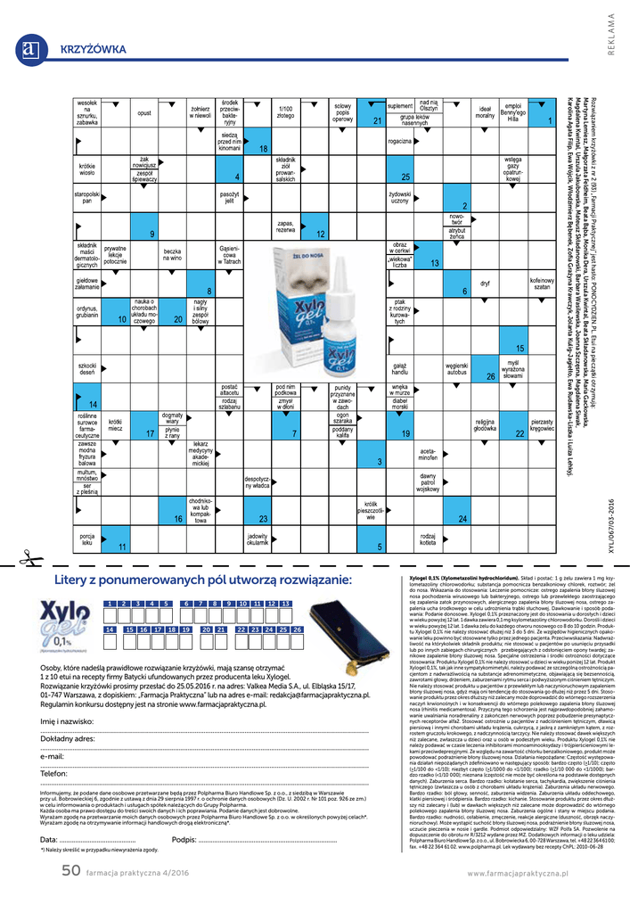 REKLAMA KRZYŻÓWKA XYL/067/03-2016 Rozwiązaniem krzyżówki z nr 2 (93) „Farmacji Praktycznej” jest hasło: PONOCYDZIEN.PL. Etui na pieczątki otrzymują: Martyna Lemiesz, Małgorzata Feldheim, Beata Bąba, Monika Dera, Urszula Kwintal, Beata Składanowska, Maria Gackowska, Magdalena Kwintal, Urszula Jakubowska, Mateusz Składanowski, Barbara Wasilewska, Joanna Szczęsna, Magdalena Siwak, Karolina Agata Filip, Ewa Wójcik, Włodzimierz Bębenek, Zofia Grażyna Krawczyk, Jolanta Kulig-Jagiełło, Ewa Rudawska-Liszka i Luiza Lehkyj. Litery z ponumerowanych pól utworzą rozwiązanie: 1 14 2 3 15 4 16 5 17 6 18 19 8 7 20 9 21 10 11 22 23 12 24 13 25 26 Osoby, które nadeślą prawidłowe rozwiązanie krzyżówki, mają szansę otrzymać 1 z 10 etui na recepty firmy Batycki ufundowanych przez producenta leku Xylogel. Rozwiązanie krzyżówki prosimy przesłać do 25.05.2016 r. na adres: Valkea Media S.A., ul. Elbląska 15/17, 01-747 Warszawa, z dopiskiem: „Farmacja Praktyczna” lub na adres e-mail: [email protected]. Regulamin konkursu dostępny jest na stronie www.farmacjapraktyczna.pl. Imię i nazwisko: ......................................................................................................................................................................................... Dokładny adres: ......................................................................................................................................................................................... e-mail: ......................................................................................................................................................................................... Telefon: ......................................................................................................................................................................................... Informujemy, że podane dane osobowe przetwarzane będą przez Polpharma Biuro Handlowe Sp. z o.o., z siedzibą w Warszawie przy ul. Bobrowieckiej 6, zgodnie z ustawą z dnia 29 sierpnia 1997 r. o ochronie danych osobowych (Dz. U. 2002 r. Nr 101 poz. 926 ze zm.) w celu informowania o produktach i usługach spółek należących do Grupy Polpharma. Każda osoba ma prawo dostępu do treści swoich danych i ich poprawiania. Podanie danych jest dobrowolne. Wyrażam zgodę na przetwarzanie moich danych osobowych przez Polpharma Biuro Handlowe Sp. z o.o. w określonych powyżej celach*. Wyrażam zgodę na otrzymywanie informacji handlowych drogą elektroniczną*. Data: ........................................... Podpis: .............................................................................. *) Należy skreślić w przypadku niewyrażenia zgody. 50 farmacja praktyczna 4/2016 Xylogel 0,1% (Xylometazolini hydrochloridum). Skład i postać: 1 g żelu zawiera 1 mg ksylometazoliny chlorowodorku; substancja pomocnicza benzalkoniowy chlorek, roztwór; żel do nosa. Wskazania do stosowania: Leczenie pomocnicze: ostrego zapalenia błony śluzowej nosa pochodzenia wirusowego lub bakteryjnego, ostrego lub przewlekłego zaostrzającego się zapalenia zatok przynosowych, alergicznego zapalenia błony śluzowej nosa, ostrego zapalenia ucha środkowego w celu udrożnienia trąbki słuchowej. Dawkowanie i sposób podawania: Podanie donosowe. Xylogel 0,1% przeznaczony jest do stosowania u dorosłych i dzieci w wieku powyżej 12 lat. 1 dawka zawiera 0,1 mg ksylometazoliny chlorowodorku. Dorośli i dzieci w wieku powyżej 12 lat. 1 dawka żelu do każdego otworu nosowego co 8 do 10 godzin. Produktu Xylogel 0,1% nie należy stosować dłużej niż 3 do 5 dni. Ze względów higienicznych opakowanie leku powinno być stosowane tylko przez jednego pacjenta. Przeciwwskazania: Nadwrażliwość na którykolwiek składnik produktu; nie stosować u pacjentów po usunięciu przysadki lub po innych zabiegach chirurgicznych przebiegających z odsłonięciem opony twardej; zanikowe zapalenie błony śluzowej nosa. Specjalne ostrzeżenia i środki ostrożności dotyczące stosowania: Produktu Xylogel 0,1% nie należy stosować u dzieci w wieku poniżej 12 lat. Produkt Xylogel 0,1%, tak jak inne sympatykomimetyki, należy podawać ze szczególną ostrożnością pacjentom z nadwrażliwością na substancje adrenomimetyczne, objawiającą się bezsennością, zawrotami głowy, drżeniem, zaburzeniami rytmu serca i podwyższonym ciśnieniem tętniczym. Nie należy stosować produktu u pacjentów z przewlekłym lub naczynioruchowym zapaleniem błony śluzowej nosa, gdyż mają oni tendencję do stosowania go dłużej niż przez 5 dni. Stosowanie produktu przez okres dłuższy niż zalecany może doprowadzić do wtórnego rozszerzenia naczyń krwionośnych i w konsekwencji do wtórnego polekowego zapalenia błony śluzowej nosa (rhinitis medicamentosa). Przyczyną tego schorzenia jest najprawdopodobniej zahamowanie uwalniania noradrenaliny z zakończeń nerwowych poprzez pobudzenie presynaptycznych receptorów alfa2. Stosować ostrożnie u pacjentów z nadciśnieniem tętniczym, dławicą piersiową i innymi chorobami układu krążenia, cukrzycą, z jaskrą z zamkniętym kątem, z rozrostem gruczołu krokowego, z nadczynnością tarczycy. Nie należy stosować dawek większych niż zalecane, zwłaszcza u dzieci oraz u osób w podeszłym wieku. Produktu Xylogel 0,1% nie należy podawać w czasie leczenia inhibitorami monoaminooksydazy i trójpierścieniowymi lekami przeciwdepresyjnymi. Ze względu na zawartość chlorku benzalkoniowego, produkt może powodować podrażnienie błony śluzowej nosa. Działania niepożądane: Częstość występowania działań niepożądanych zdefiniowano w następujący sposób: bardzo często (≥1/10); często (≥1/100 do <1/10); niezbyt często (≥1/1000 do <1/100); rzadko (≥1/10 000 do <1/1000); bardzo rzadko (<1/10 000); nieznana (częstość nie może być określona na podstawie dostępnych danych). Zaburzenia se